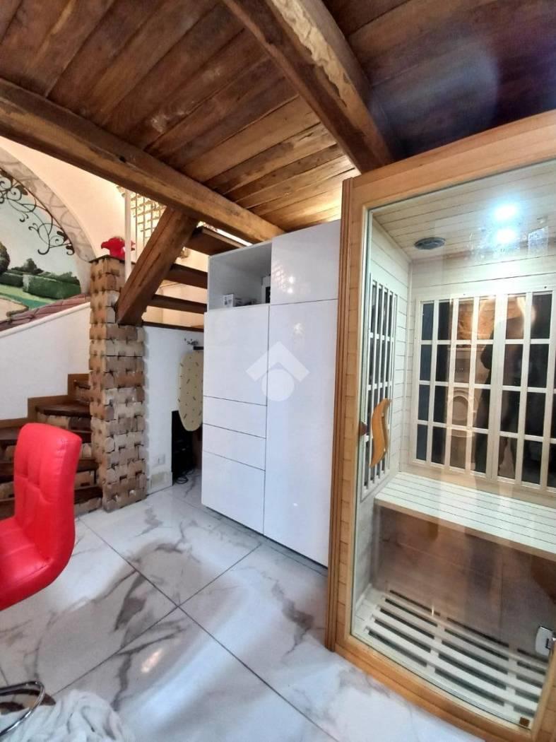 Il secondo appartamento dispone di un soggiorno con angolo cottura, un locale sauna e un bagno. Anche in questo caso, una scala in legno porta al soppalco abitabile che ospita la zona notte.