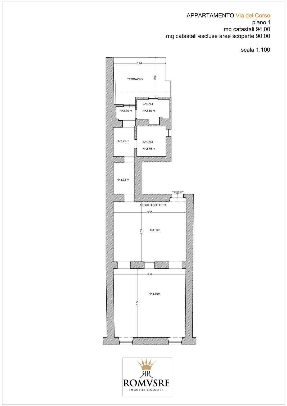 La proprietà si trova al primo piano di un elegante palazzo d’epoca risalente al '700 di 5 piani, senza ascensore, dispone internamente di pavimenti in parquet, travertino presente sia nei battiscopa che negli imbotti delle porte e nei disimpegni e nei bagni, infissi in alluminio bianco con doppi vetri, grate di sicurezza lato terrazzo, persiane in legno e doppi infissi lato via del Corso, aria condizionata e porte a scrigno nei bagni.