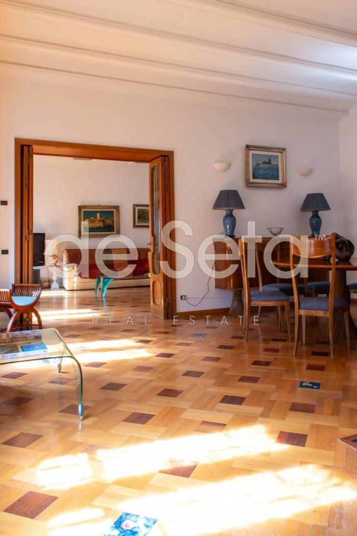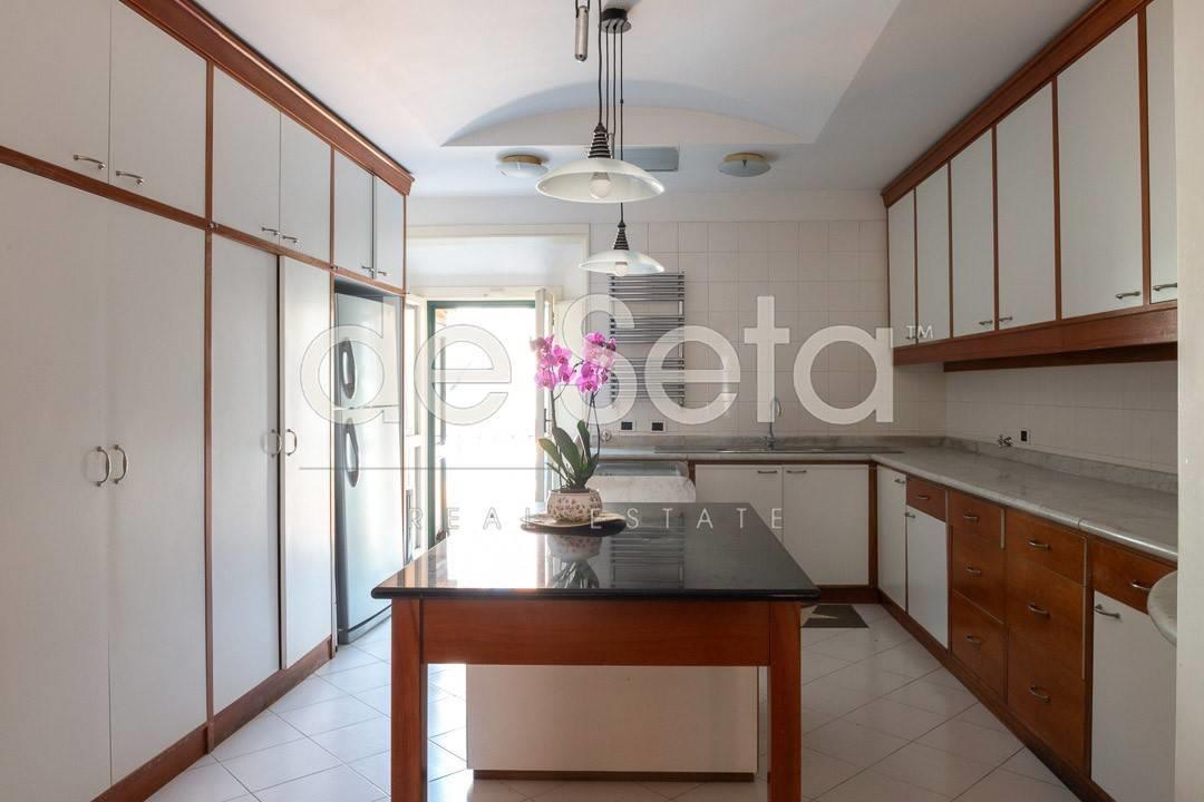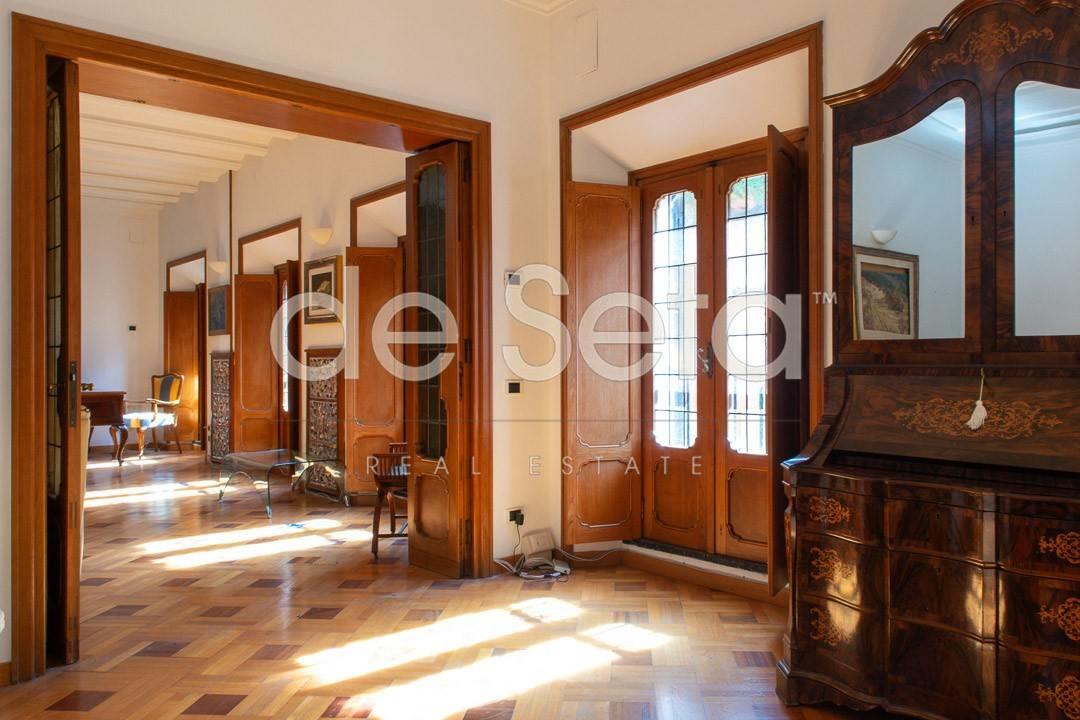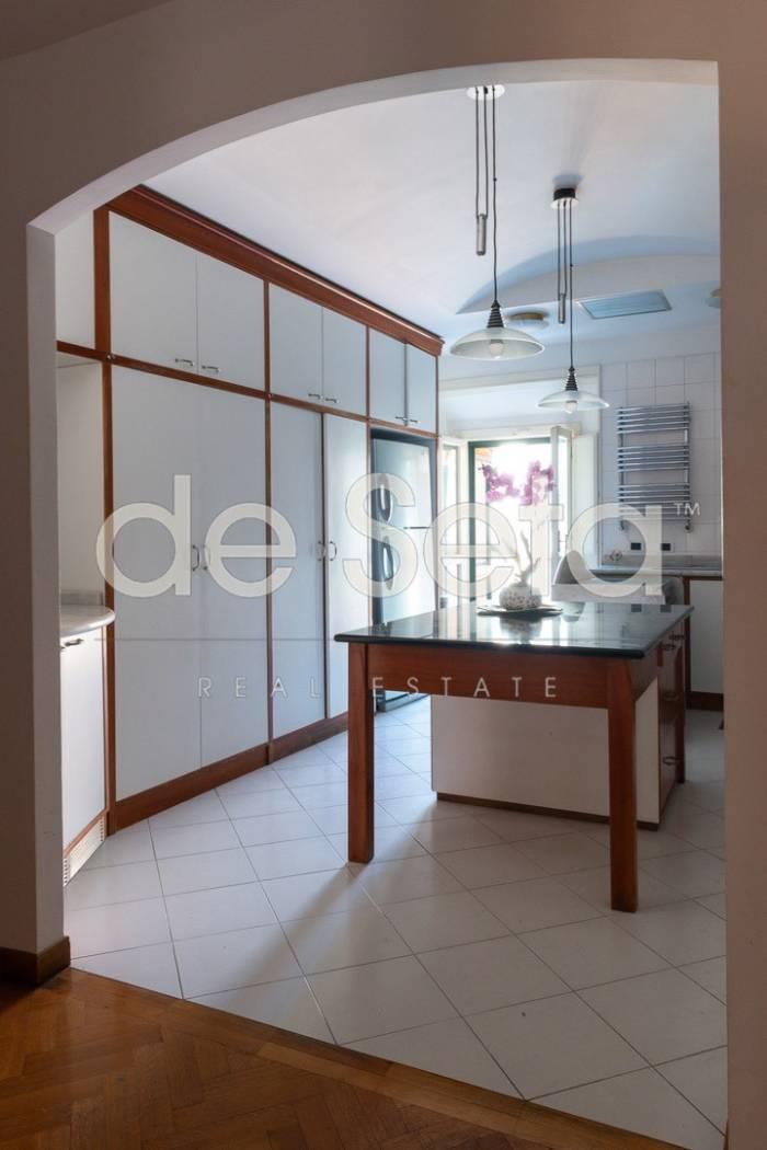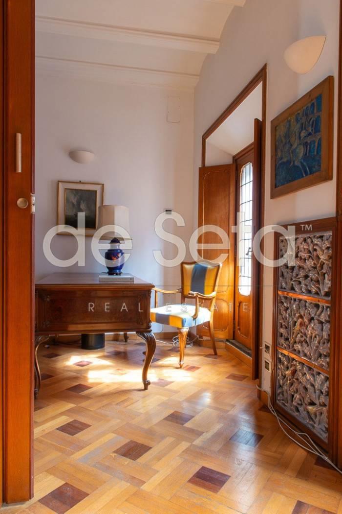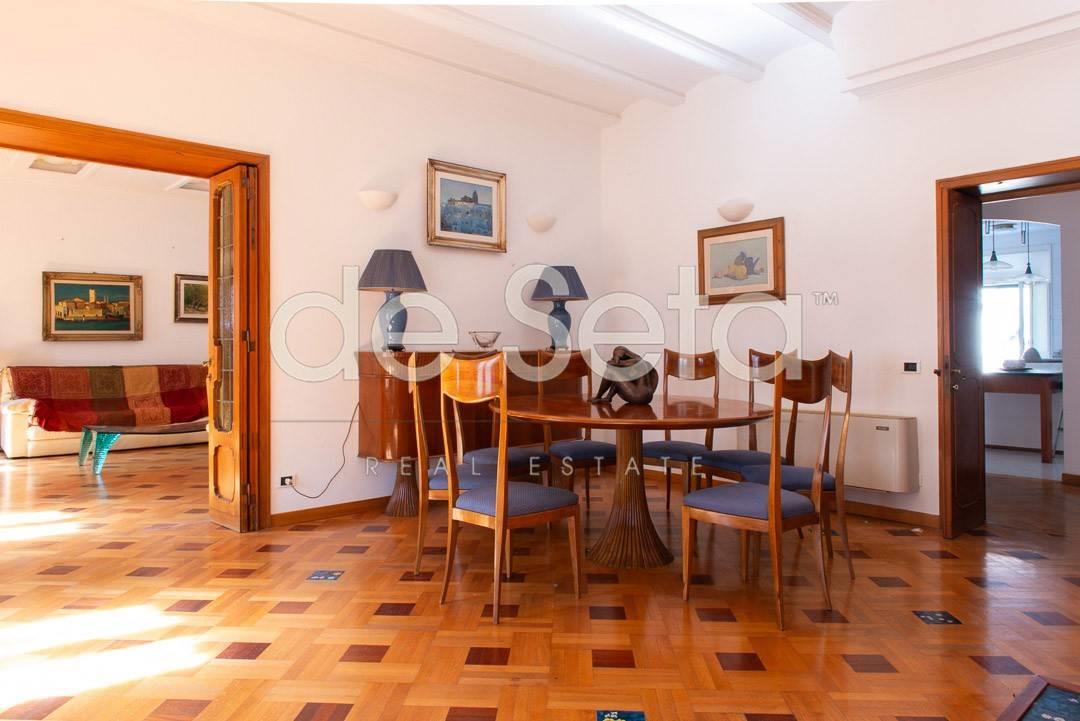 Attualmente composto da grande ingresso con armadi a muro, salone, sala da pranzo, studio, ampia cucina abitabile con balconcino, disimpegno, due grandi camere da letto (una puo' essere divisa in due), 2 bagni (uno molto grande potrebbe essere una camera).