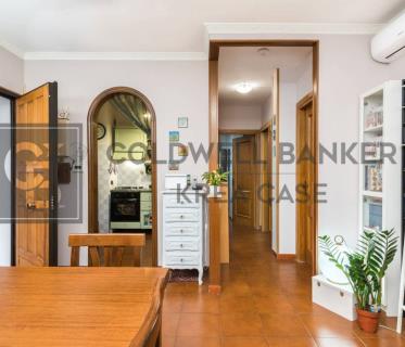 L'appartamento è composto da soggiorno ampio con cucina a vista, due camere, due bagni, ripostiglio guardaroba, due balconi ed un box auto di proprietà al piano seminterrato.