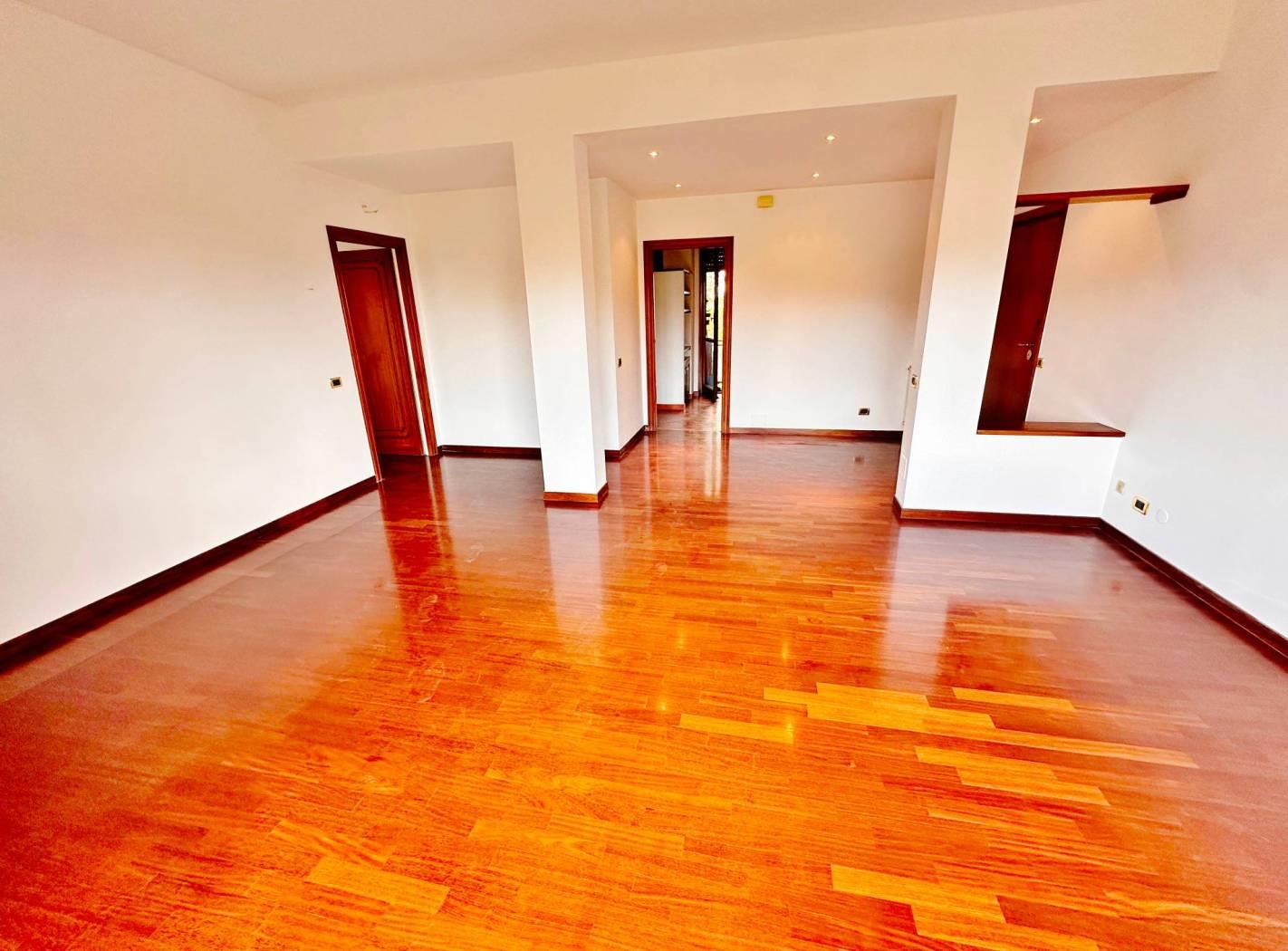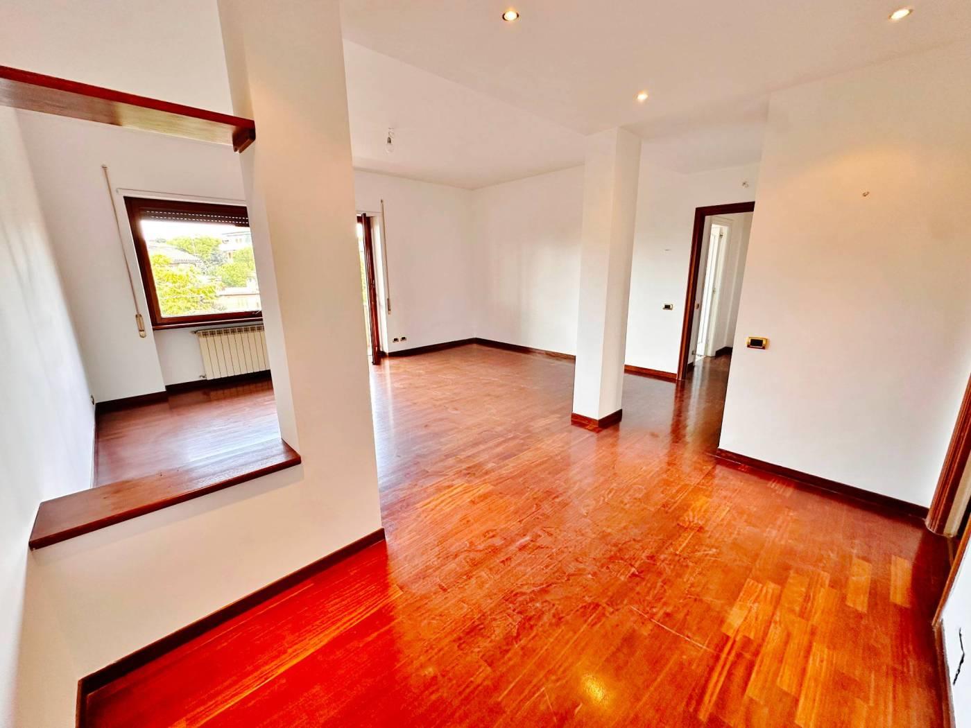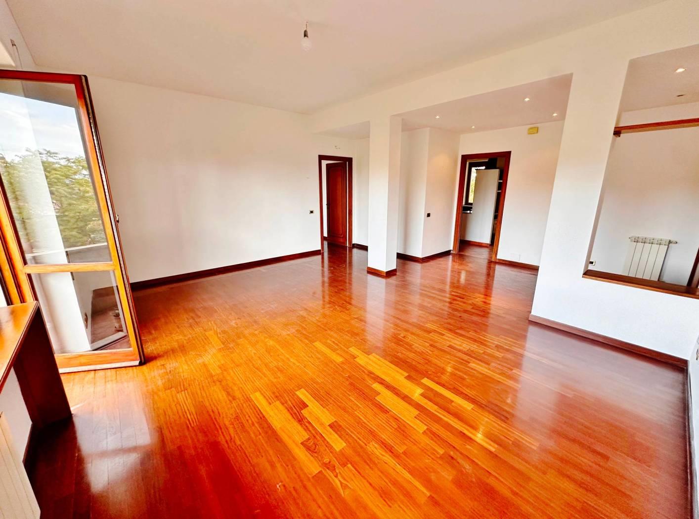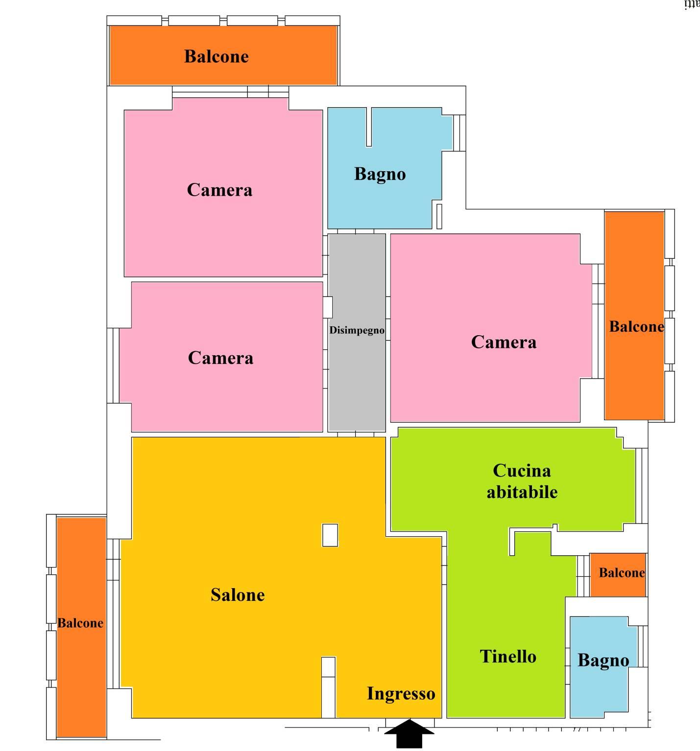 Ingresso con salone a vista, cucina con tinello, tre camere da letto, due bagni, tre balconi e posto auto di proprietà nel garage condominiale.