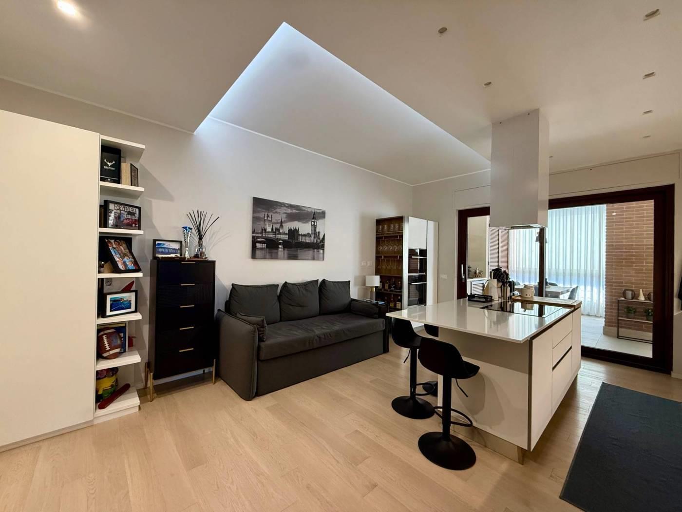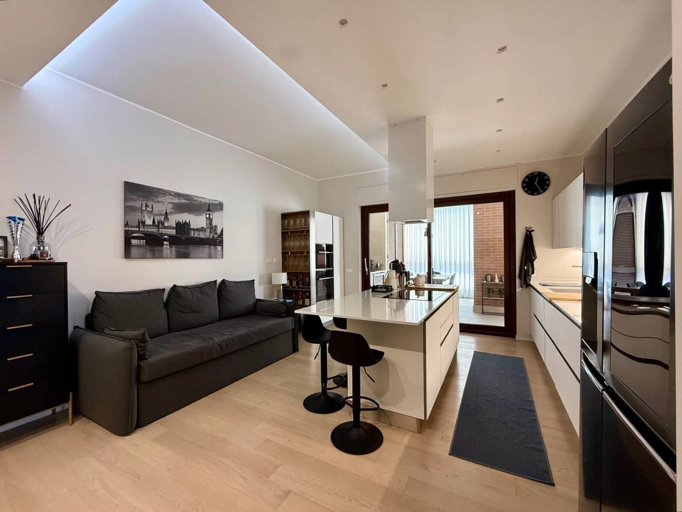 Una porzione del terrazzo è stata inoltre chiusa con eleganti vetrate scorrevoli, creando una raffinata serra bioclimatica, attualmente adibita a zona living e angolo studio.