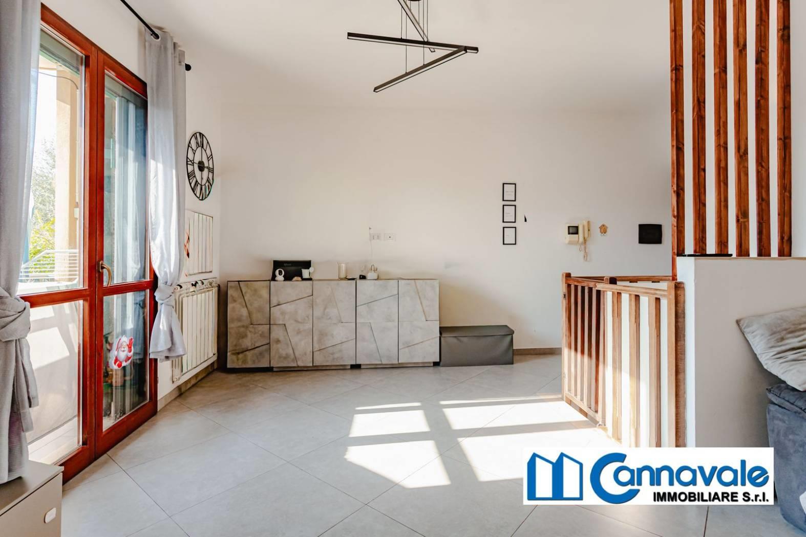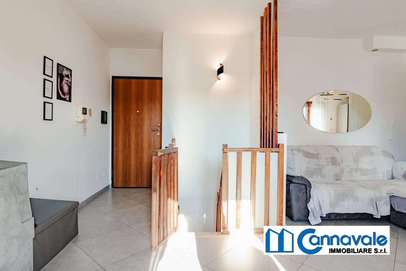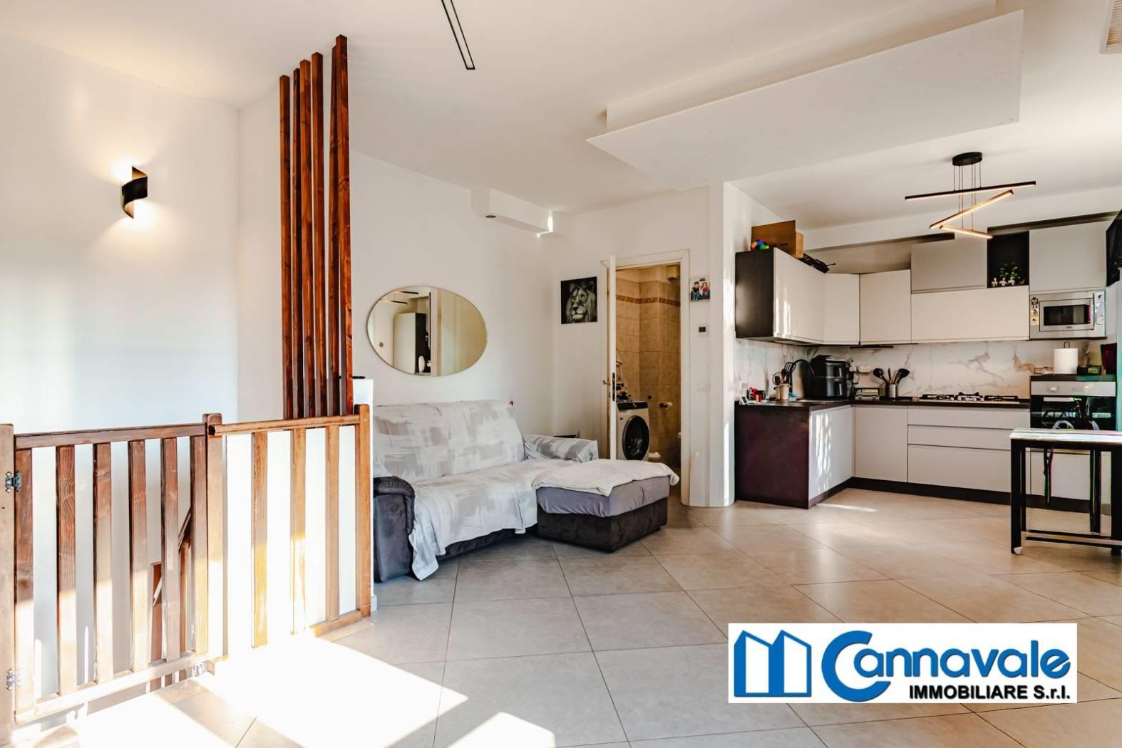 Piano Rialzato (Zona Giorno): Un luminoso open space con salone e cucina a vista, ottimizzato per massimizzare la percezione dei volumi. Da qui si accede al balcone di pertinenza, perfetto elemento di transizione verso il cuore pulsante della casa.