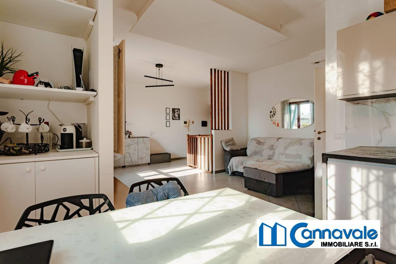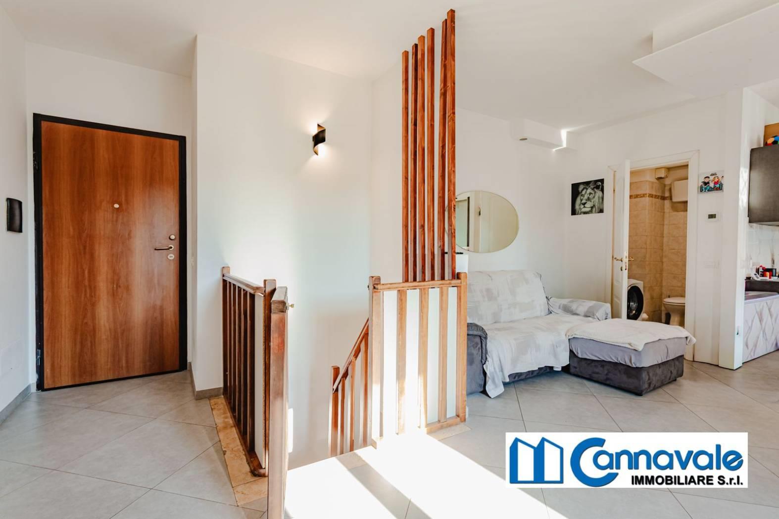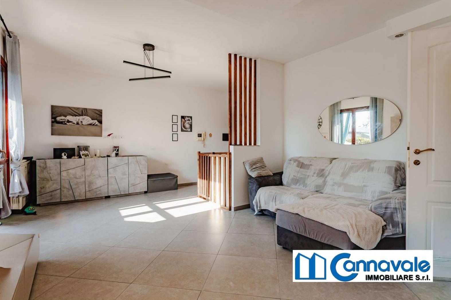 Piano Rialzato (Zona Giorno): Un luminoso open space con salone e cucina a vista, ottimizzato per massimizzare la percezione dei volumi. Da qui si accede al balcone di pertinenza, perfetto elemento di transizione verso il cuore pulsante della casa.