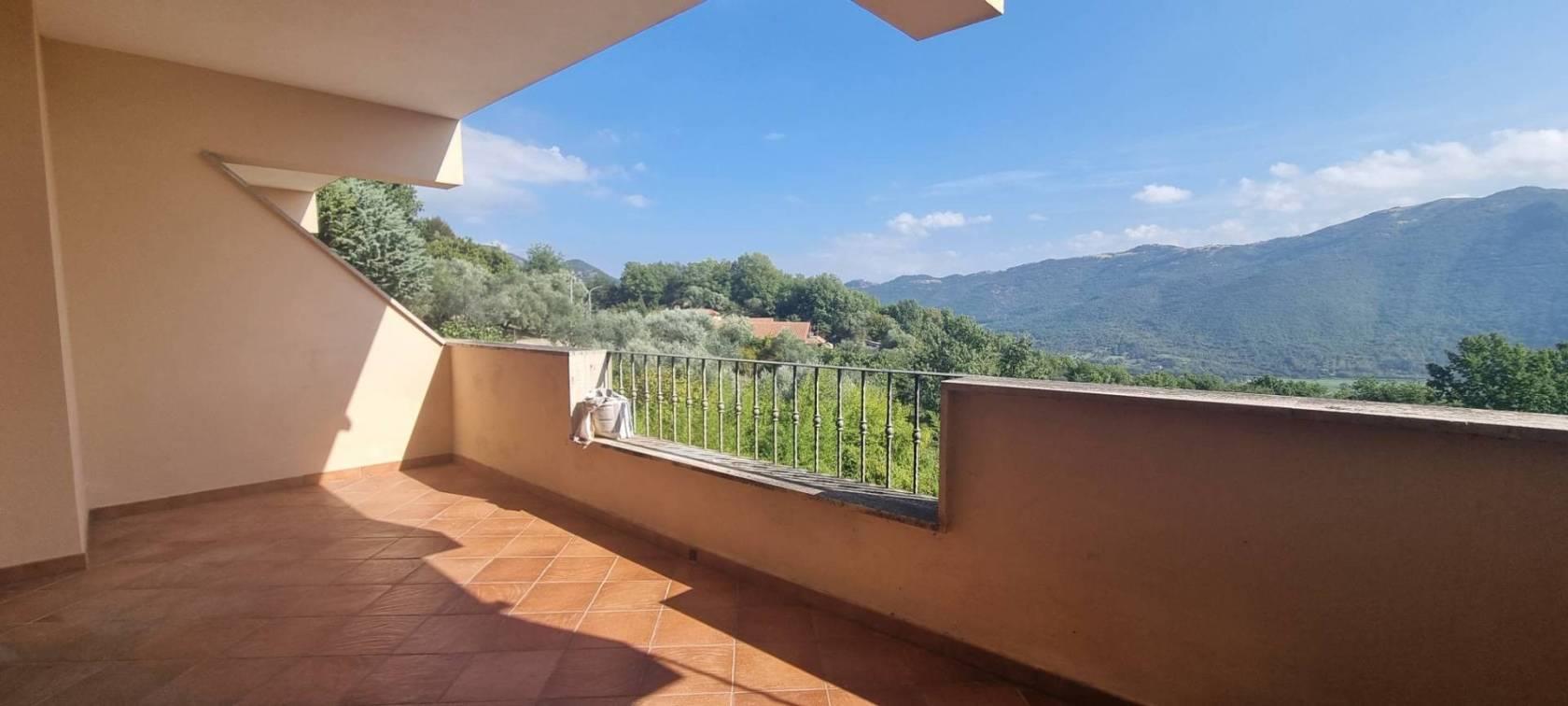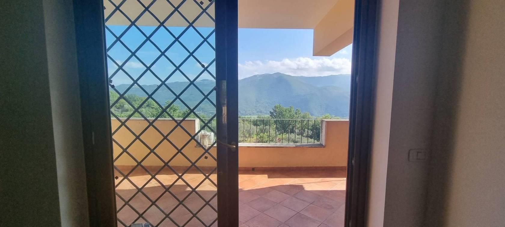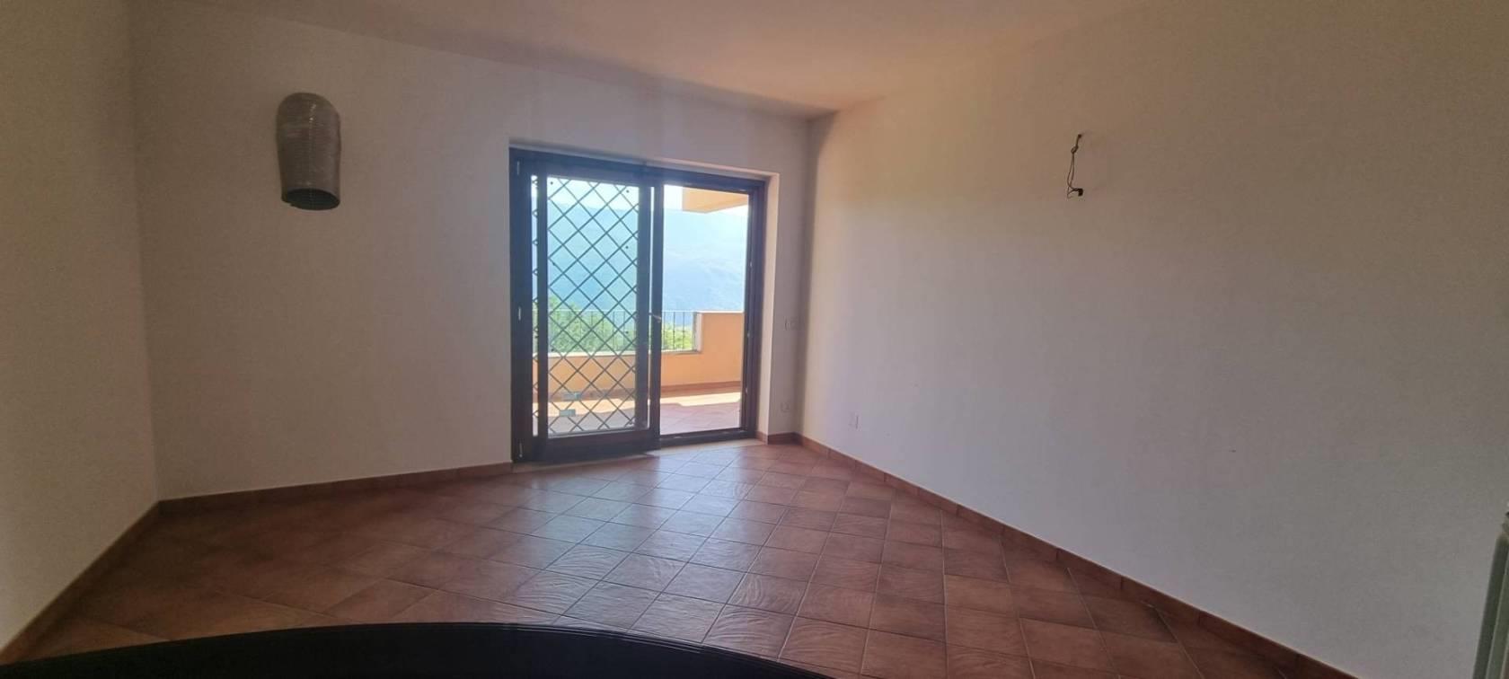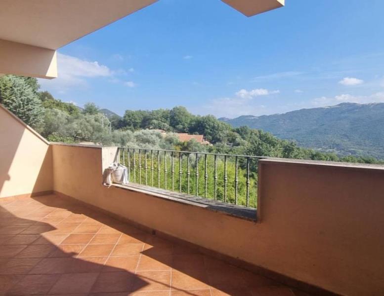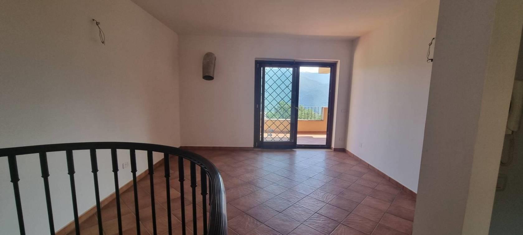 L'appartamento è diviso su due livelli tramite l' ingresso principale si arriva a un ampio e luminoso soggiorno, dotato di doppie finestre in PVC a doppio vetro che danno l'accesso a uno strepitoso terrazzo con vista mozzafiato sulla vallata , una camera da letto , cucina abitabile e servizio; tramite una comoda scala si scende al piano inferiore che è sbancato e troviamo un'ulteriore soggiorno con terrazzo con la medesima vista ed esposizione del primo ,un secondo bagno e due camere da letto, completa la proprietà un comodo giardino a livello.