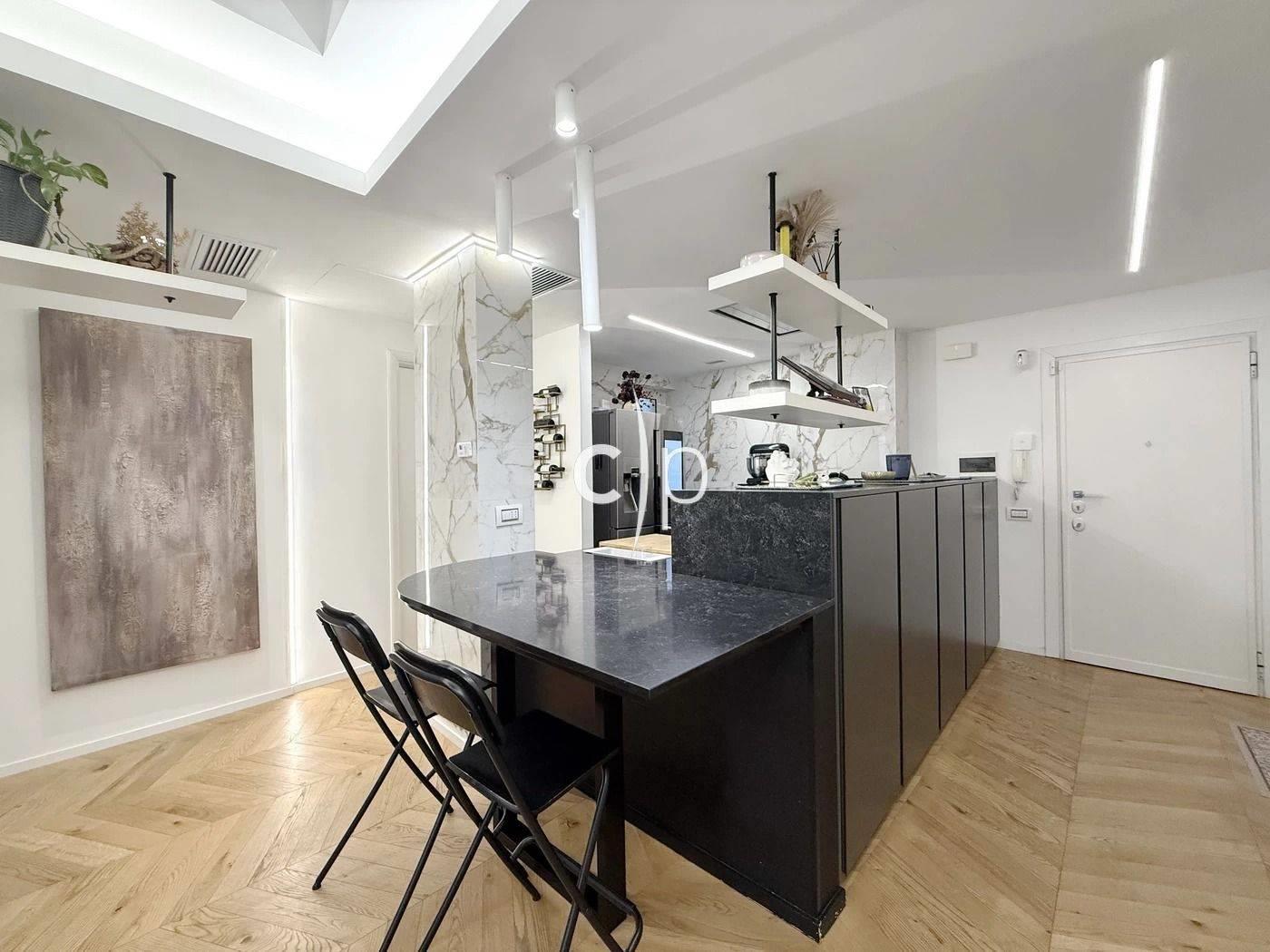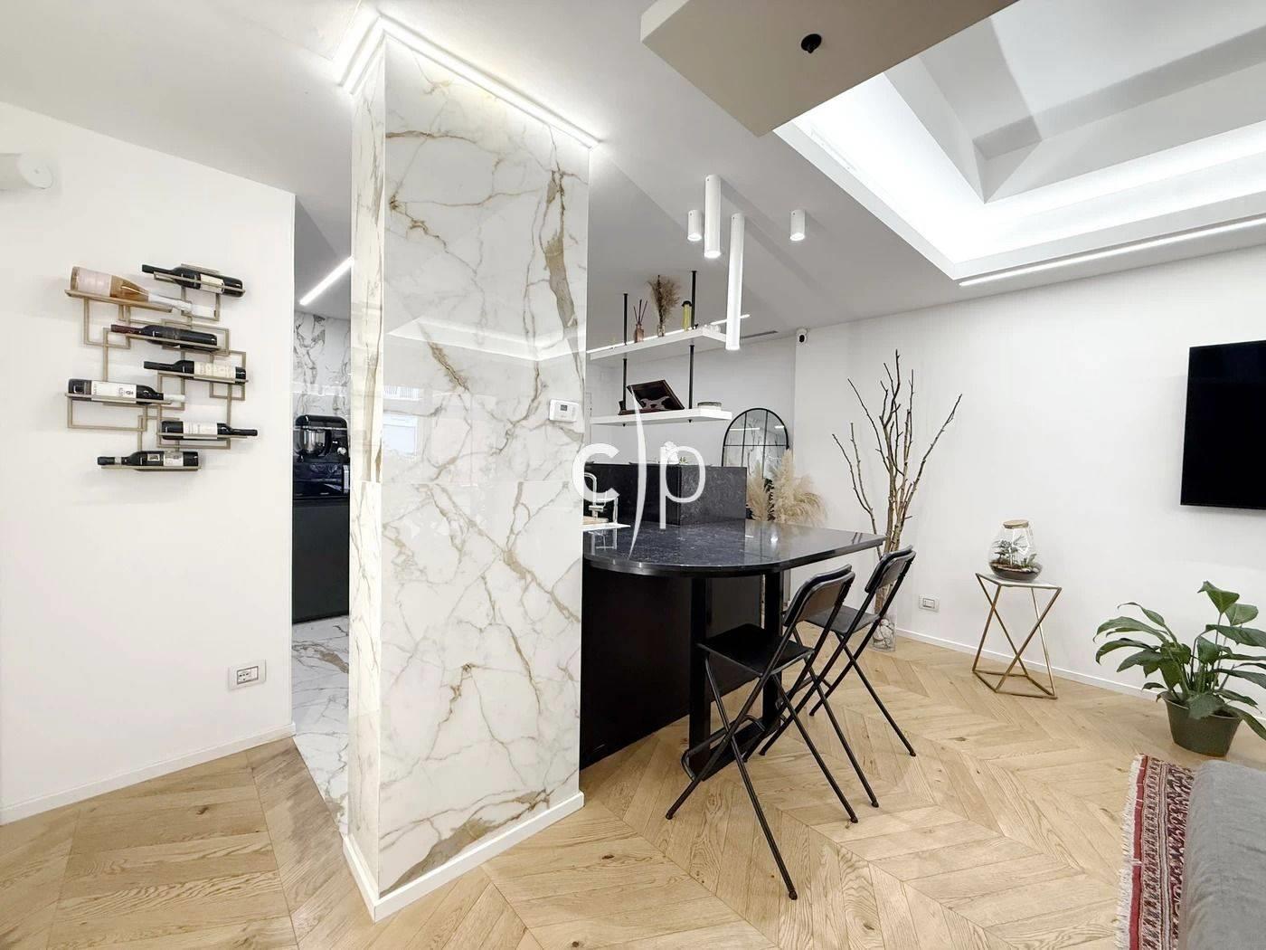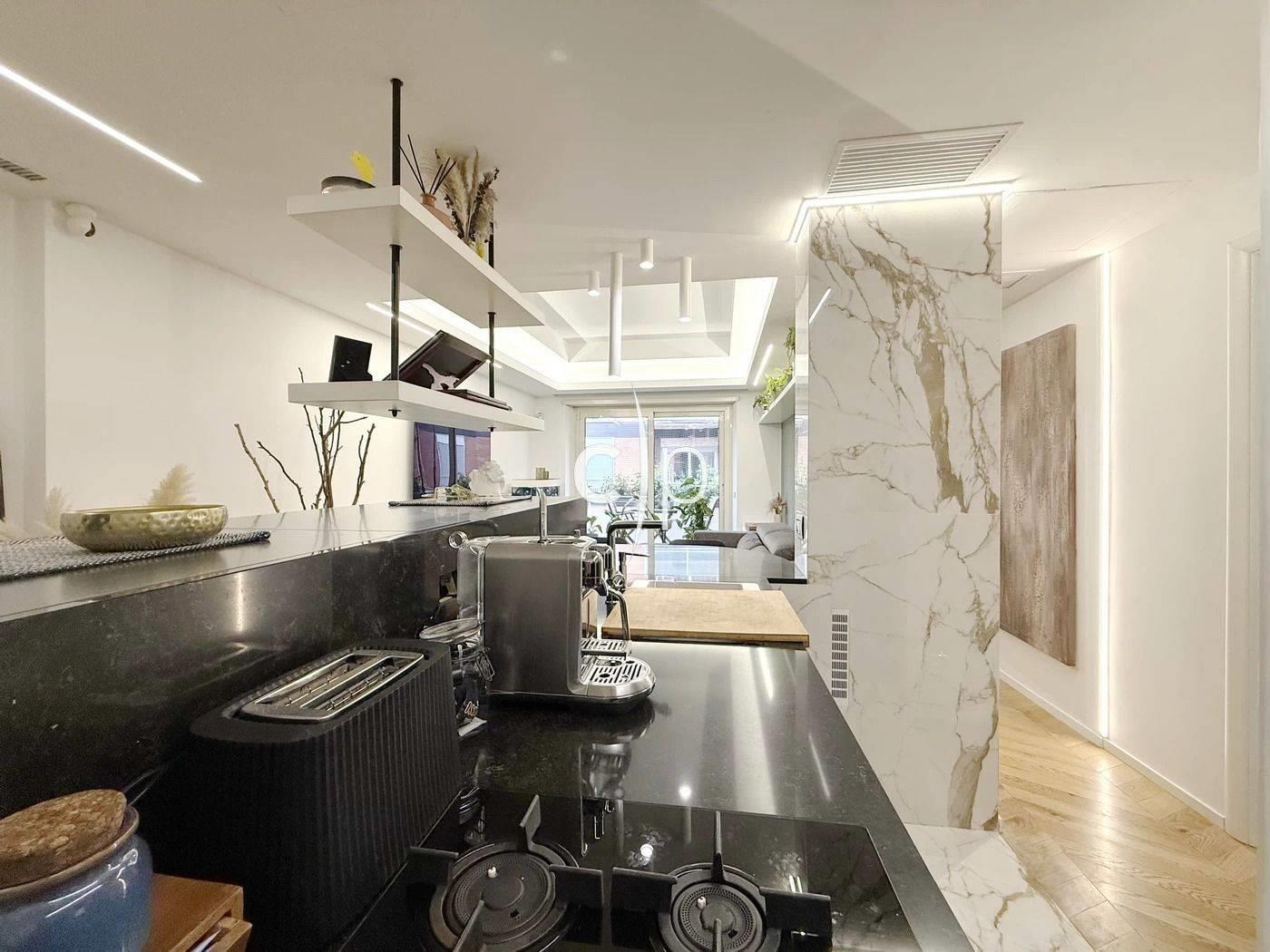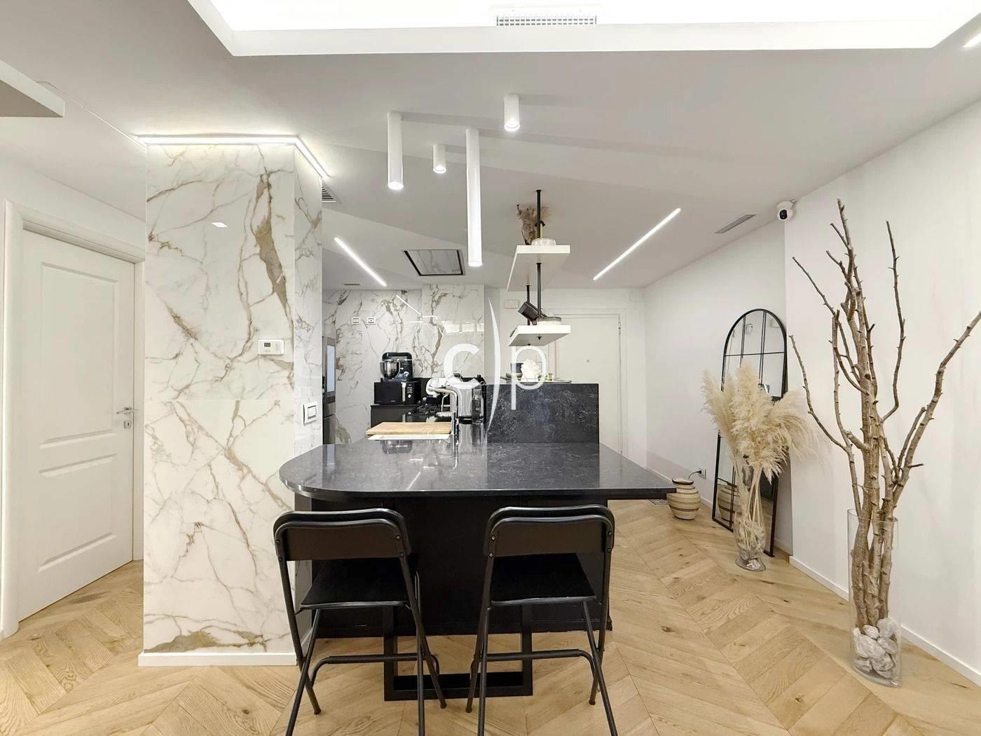 La ristrutturazione, curata nei minimi dettagli, valorizza materiali di pregio e soluzioni tecnologiche: