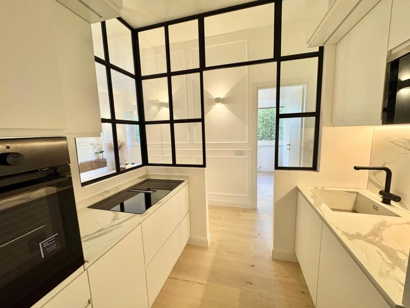 un ampio soggiorno luminoso, con la cucina separata da una splendida vetrata, crea un equilibrio perfetto tra convivialità e riservatezza.