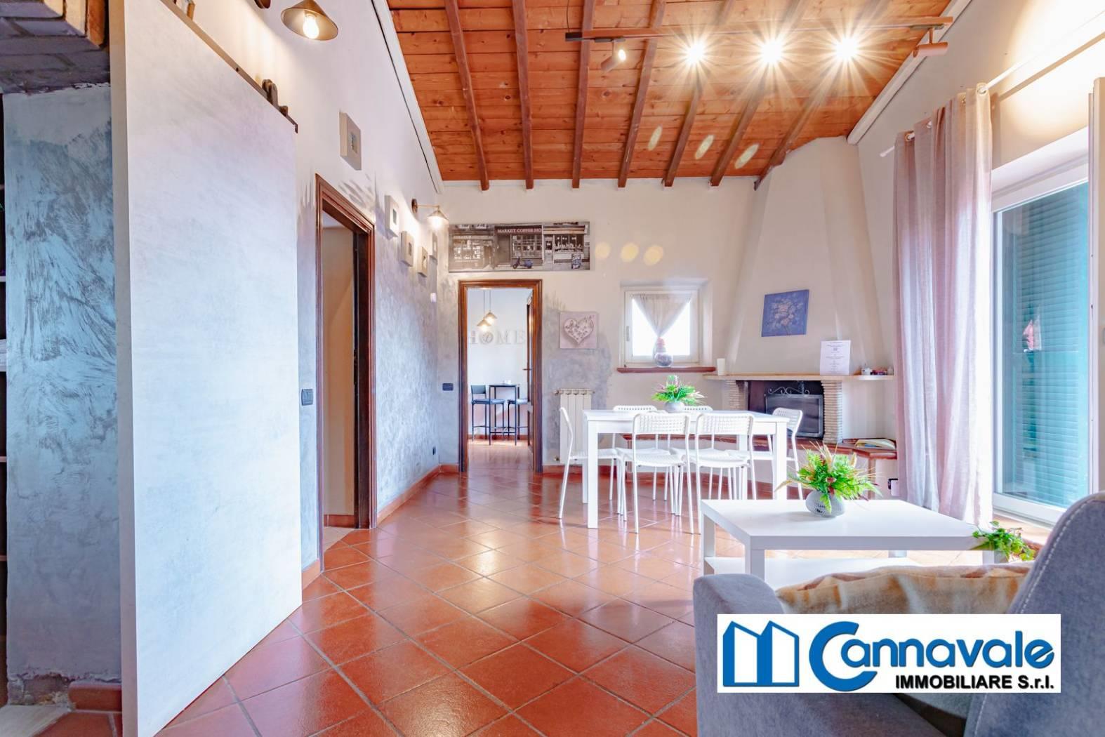 Varcando la soglia, si viene accolti in uno spazio interno di circa 85 metri quadrati, caratterizzato da una distribuzione degli ambienti estremamente razionale e moderna. Il cuore pulsante della casa è il caldo soggiorno di rappresentanza, impreziosito da un grande camino a legna perfettamente funzionante e integrato nell'architettura della sala. Gli ambienti proseguono fluidamente verso la cucina adiacente, mentre la zona notte è ben separata e offre due luminose camere da letto servite da un bagno completo. Ogni singola stanza vanta una finitura di immenso pregio: suggestivi soffitti con corpose travi di legno massiccio a vista, una scelta che mantiene un'affascinante coerenza filologica con la lunga e nobile storia dell'edificio.