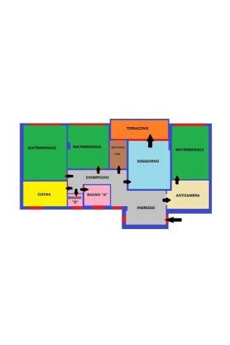 salone triplo con cucina all'americana; disimpegno; 3 comode camere da letto; 3 bagni finestrati.