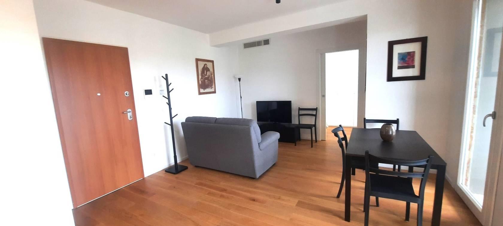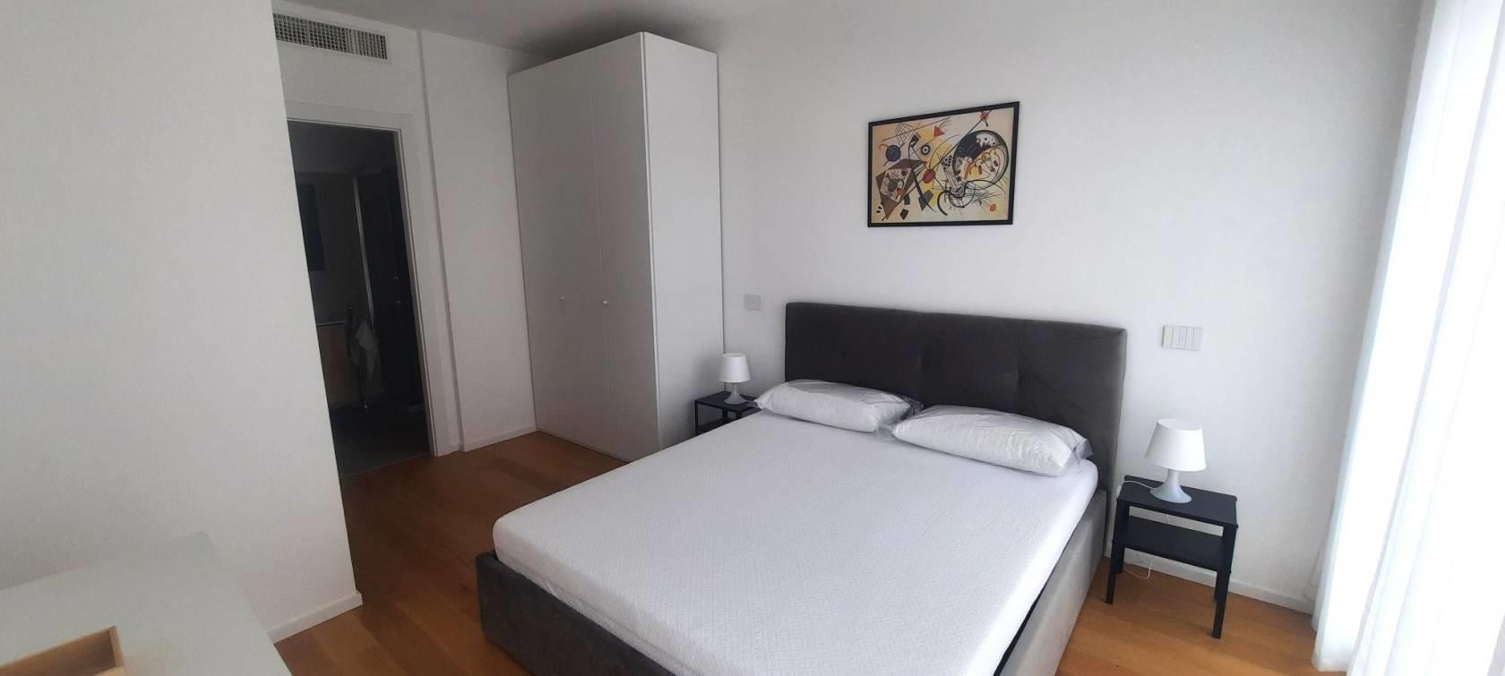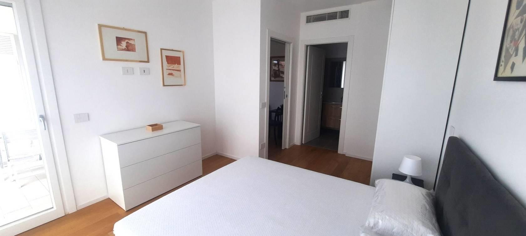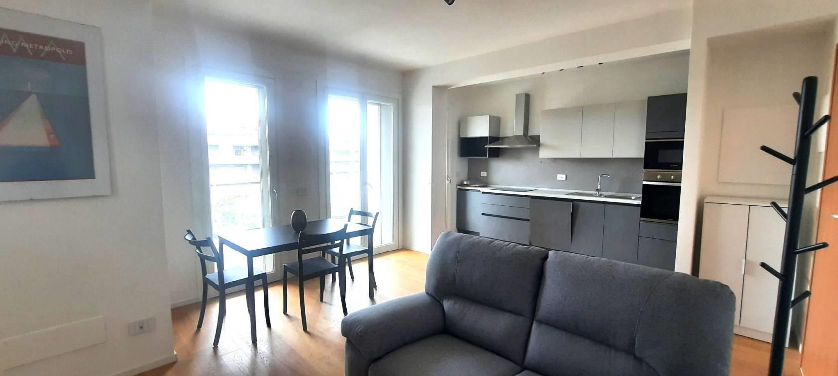 TRANSITORIO per 18 MESI. Tassativamente escluse locazioni lunghe e turistico-ricettive. Offriamo un luminoso bilocale completamente arredato di nuova costruzione posto al sesto piano del palazzo. Internamente sviluppa una superficie di mq.43 suddivisi in salone con cucina a vista, una camera matrimoniale, un bagno con doccia ed un ampio terrazzo abitabile con ripostiglio/lavanderia esterno.
