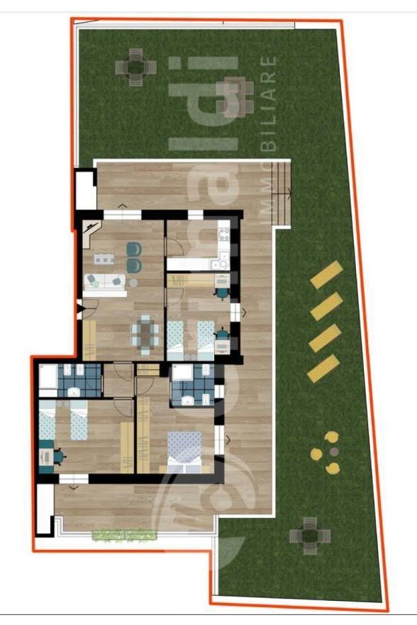 Il quadrilocale proposto è posto al piano terra e composto da soggiorno e zona pranzo, cucina semiabitabile separata, 3 camere da letto, doppi servizi di cui uno en suite, terrazzo perimetrale su 3 lati con due ripostigli esterni, giardino privato angolare. Tutti gli ambienti sono dotati di porta finestra per l’uscita sul grande terrazzo e sul giardino. Possibilità di acquisto anche di un posto auto.