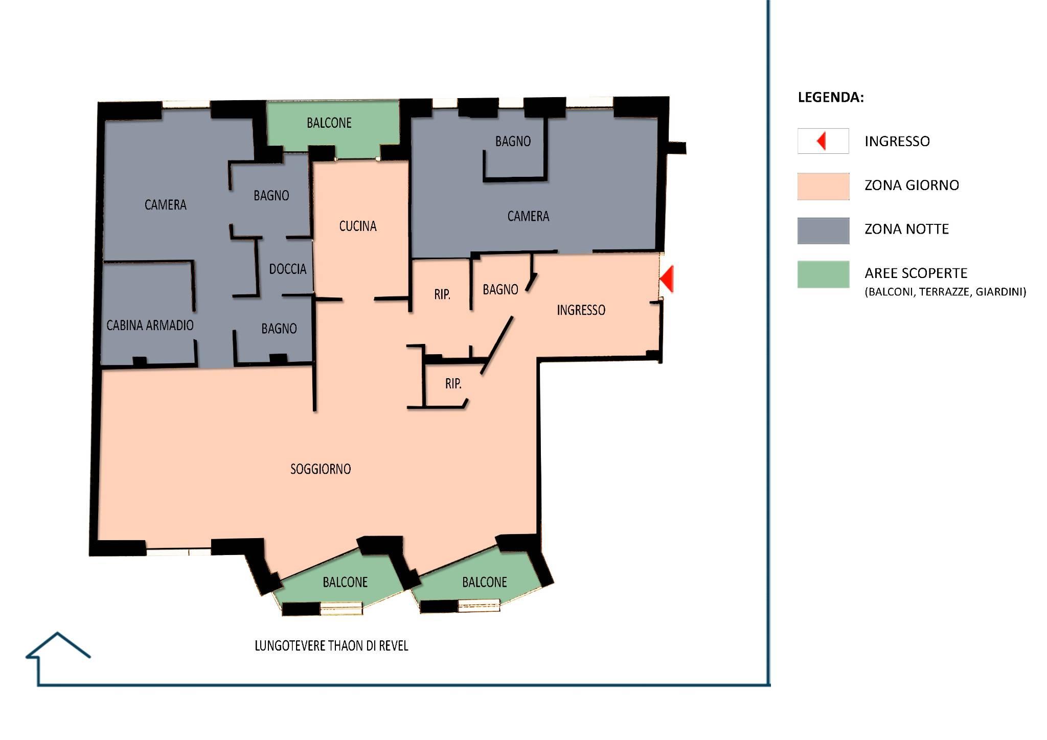 La zona giorno si compone di ingresso con guardaroba e ripostiglio, SALONE TRIPLO con accesso a DUE BALCONI PANORAMICI fronte Tevere e zona pranzo, bagno ospiti completo di doccia, moderna cucina completamente arredata e dotata di elettrodomestici da cui si accede ad un terzo balcone verandato adibito a lavanderia, altro ampio ripostiglio/stireria.