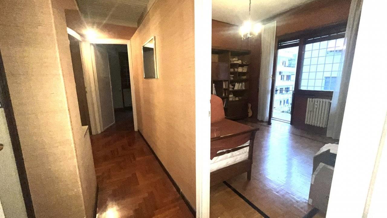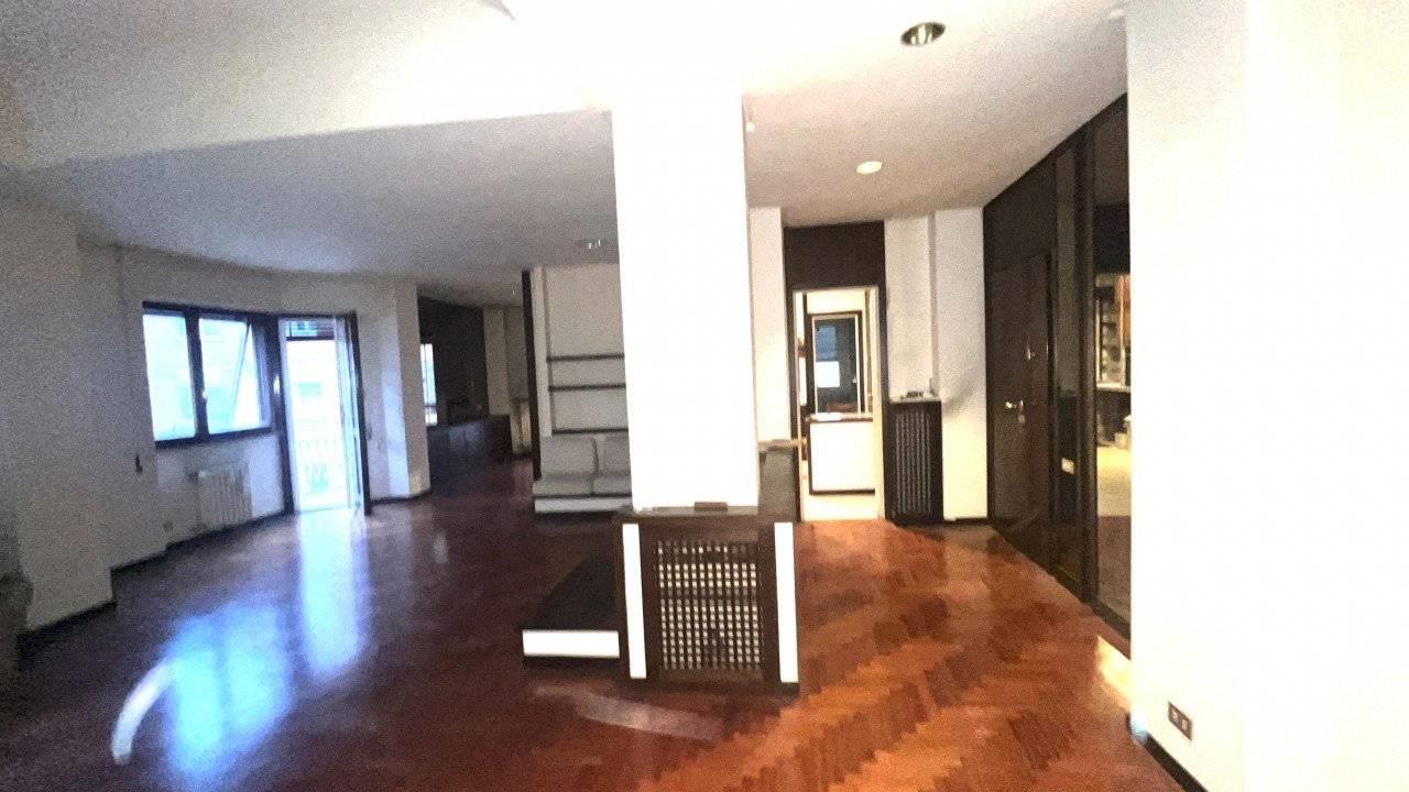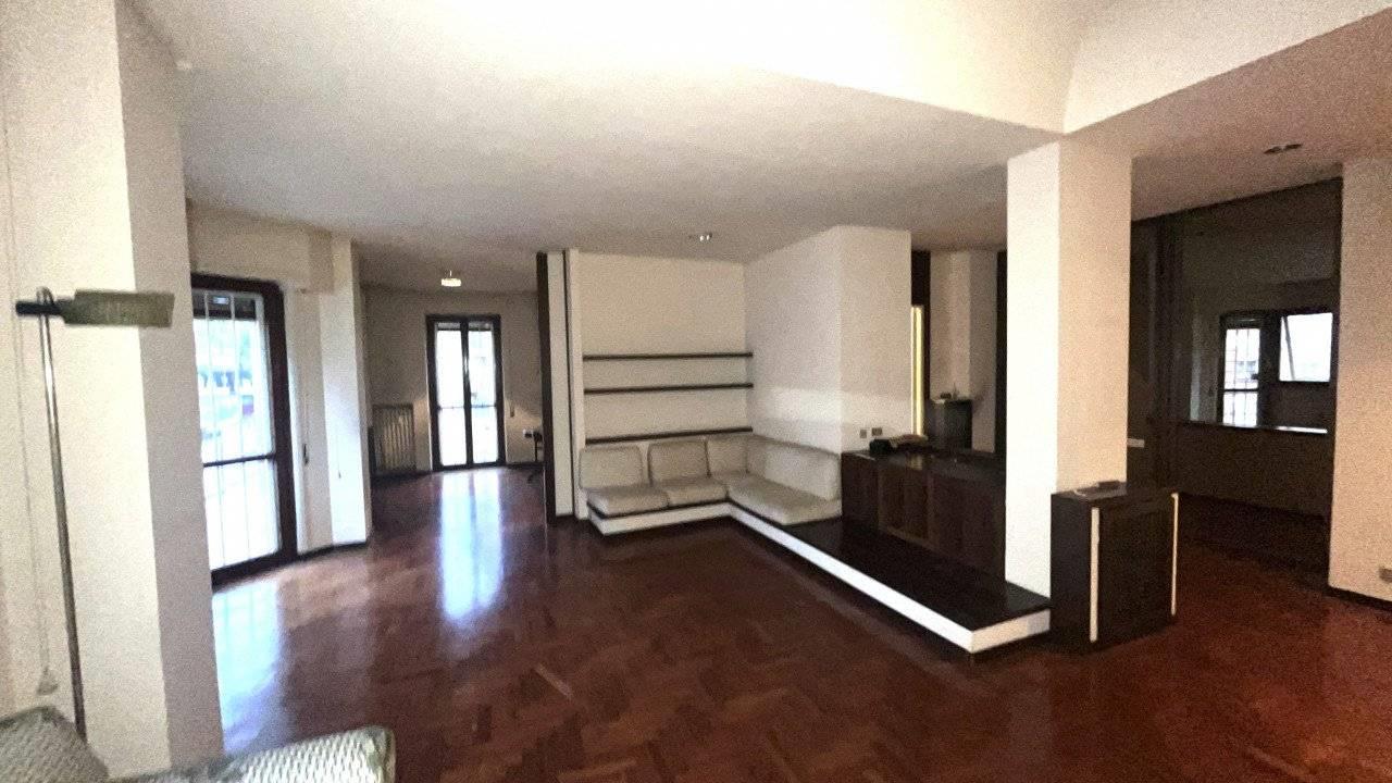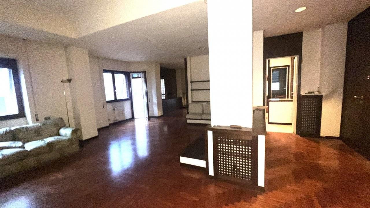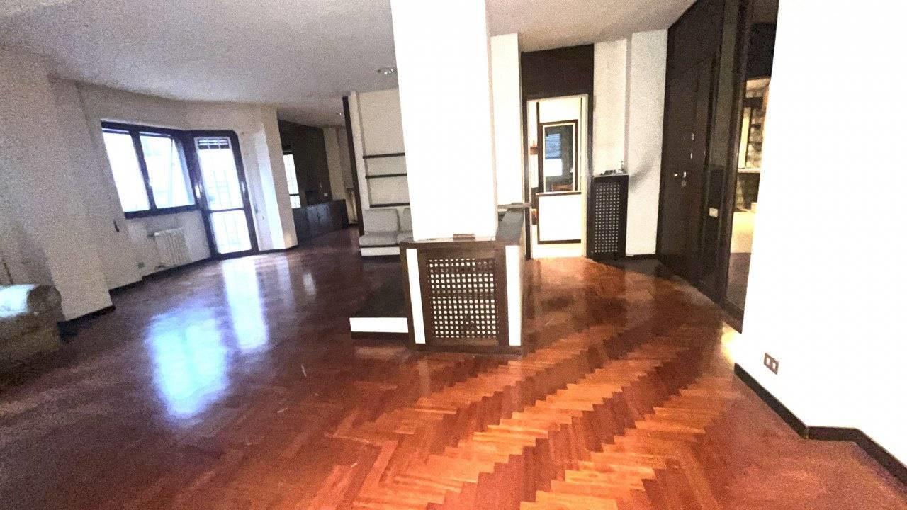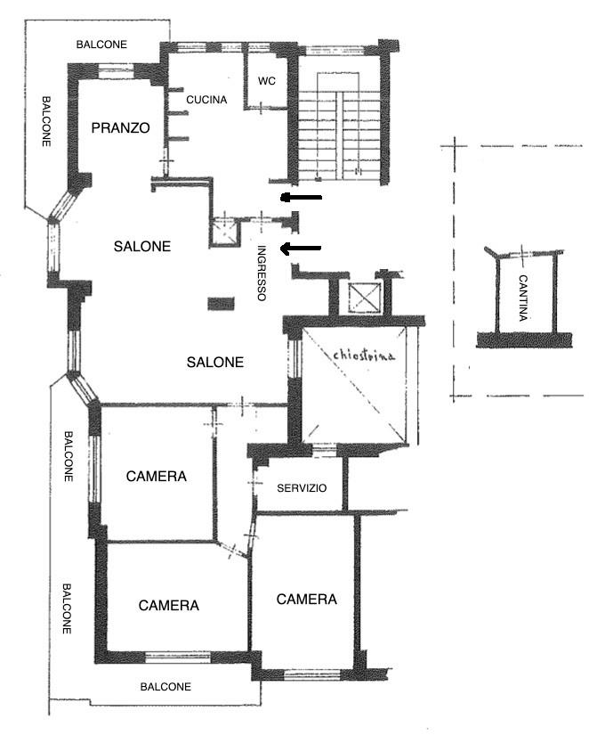 E' composto da un doppio ingresso, salone doppio , camera da pranzo separabile dal salone con una grande porta scorrevole, cucina abitabile accanto alla sala da pranzo, tre camere, doppi servizi finestrati.