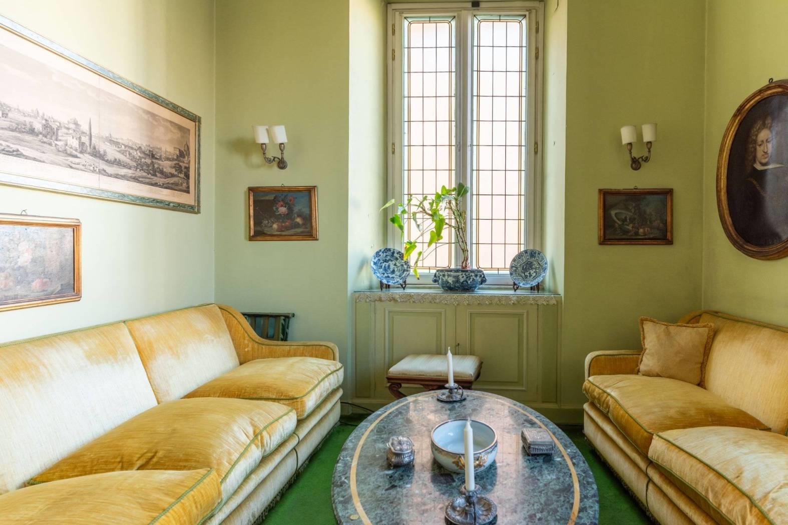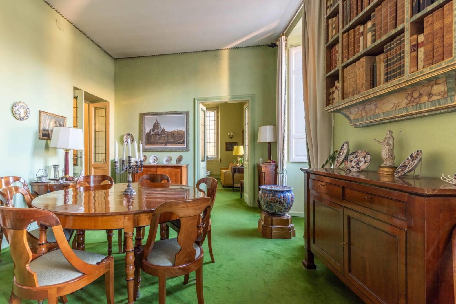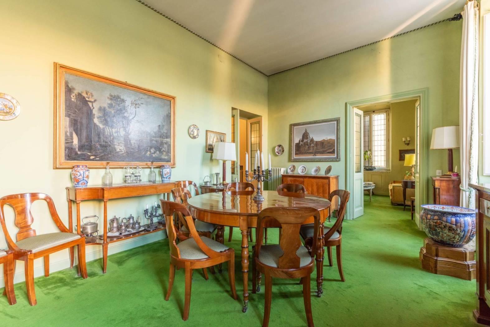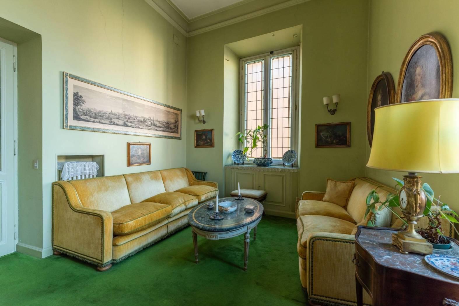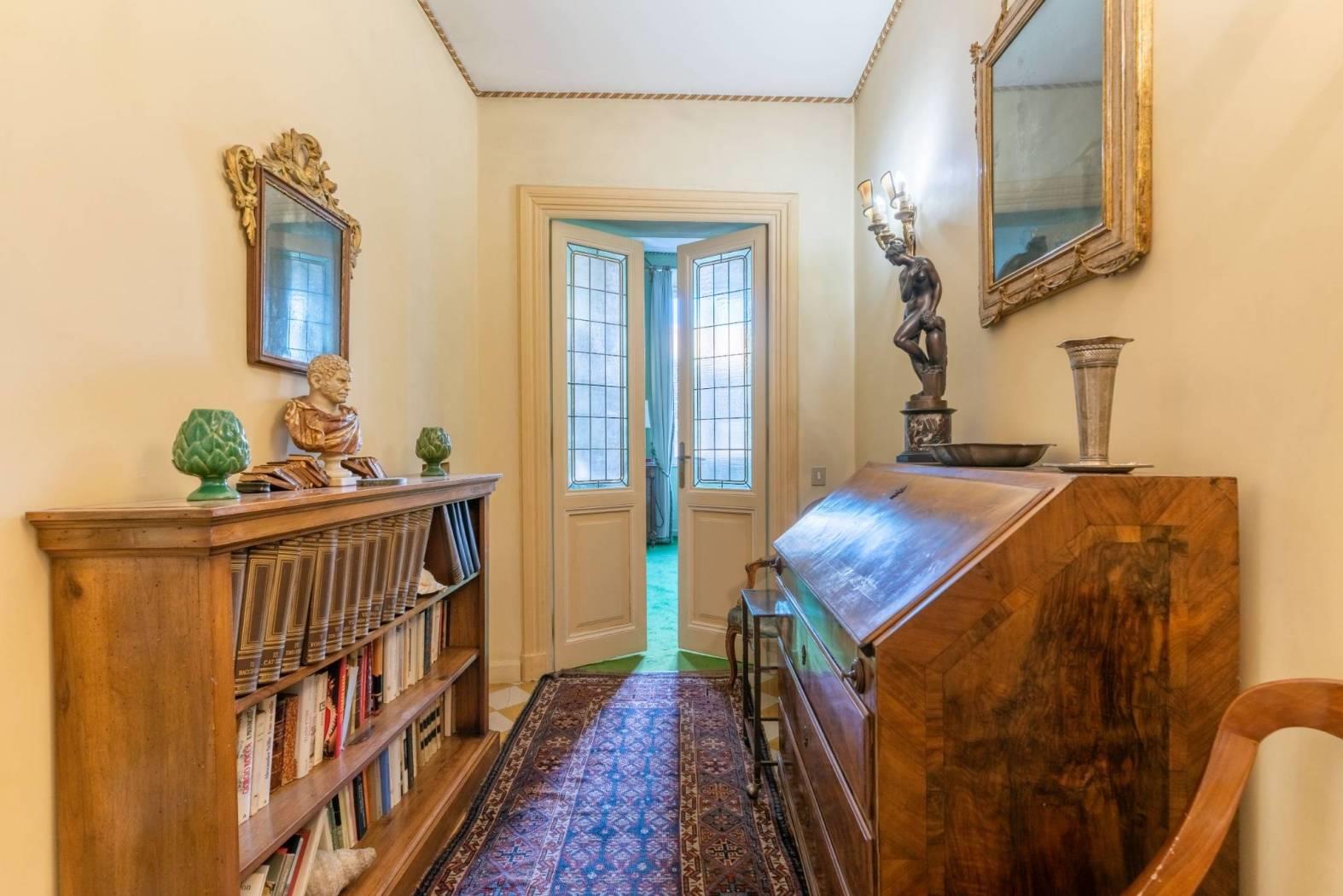Entriamo in un ambiente di ingresso che smista le due zone della casa. Di qui si accede alla rappresentanza, composta da tre belle sale in infilata tra loro: una ampia sala da pranzo centrale, un salotto angolare più intimo e uno studio attualmente attrezzato come seconda camera da letto. La zona di servizio ha una cucina abitabile e un piccolo bagno. Infine vi è una camera da letto padronale davvero molto grande, con il suo bagno ed una stanza en suite attualmente adibita a comoda cabina armadio.