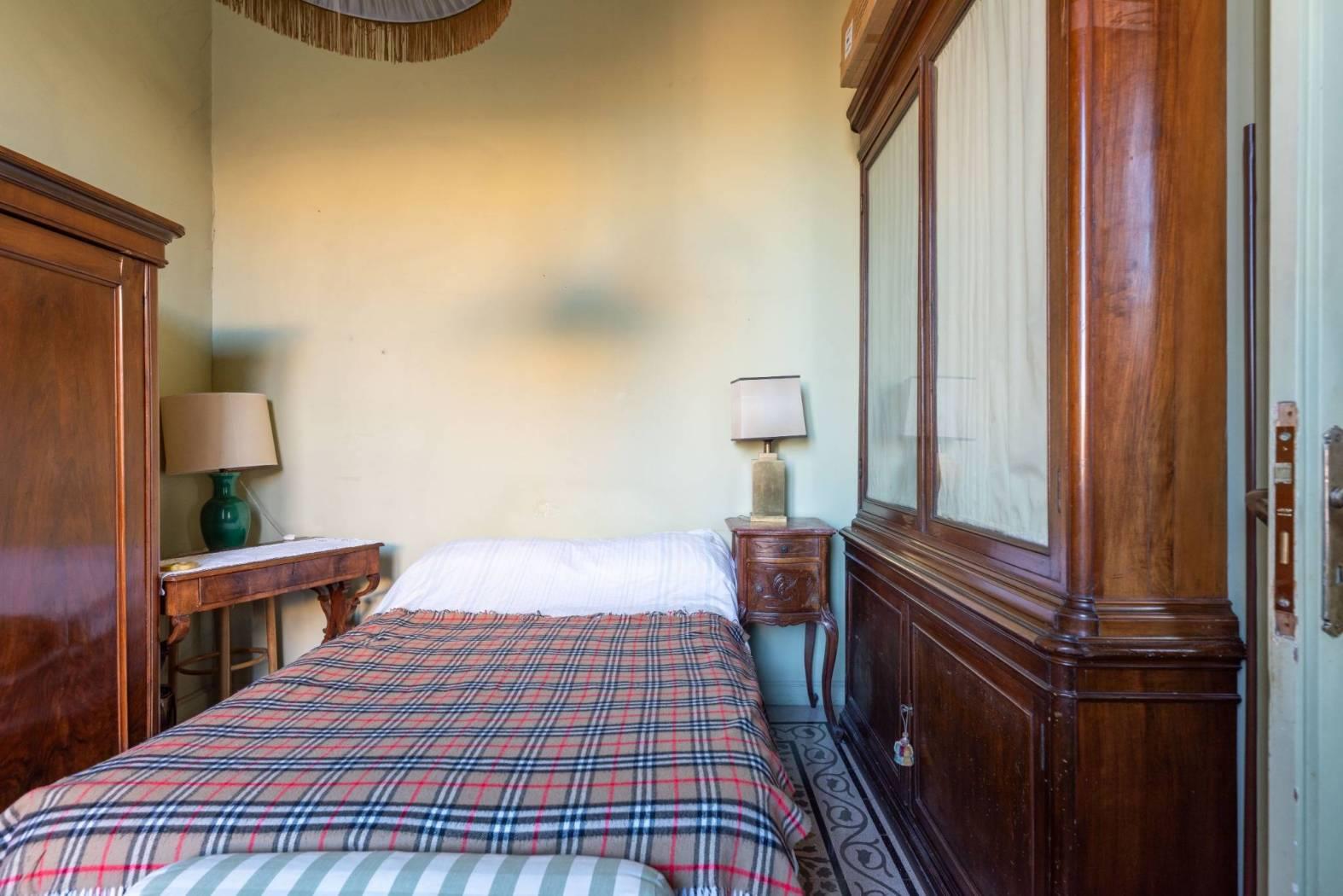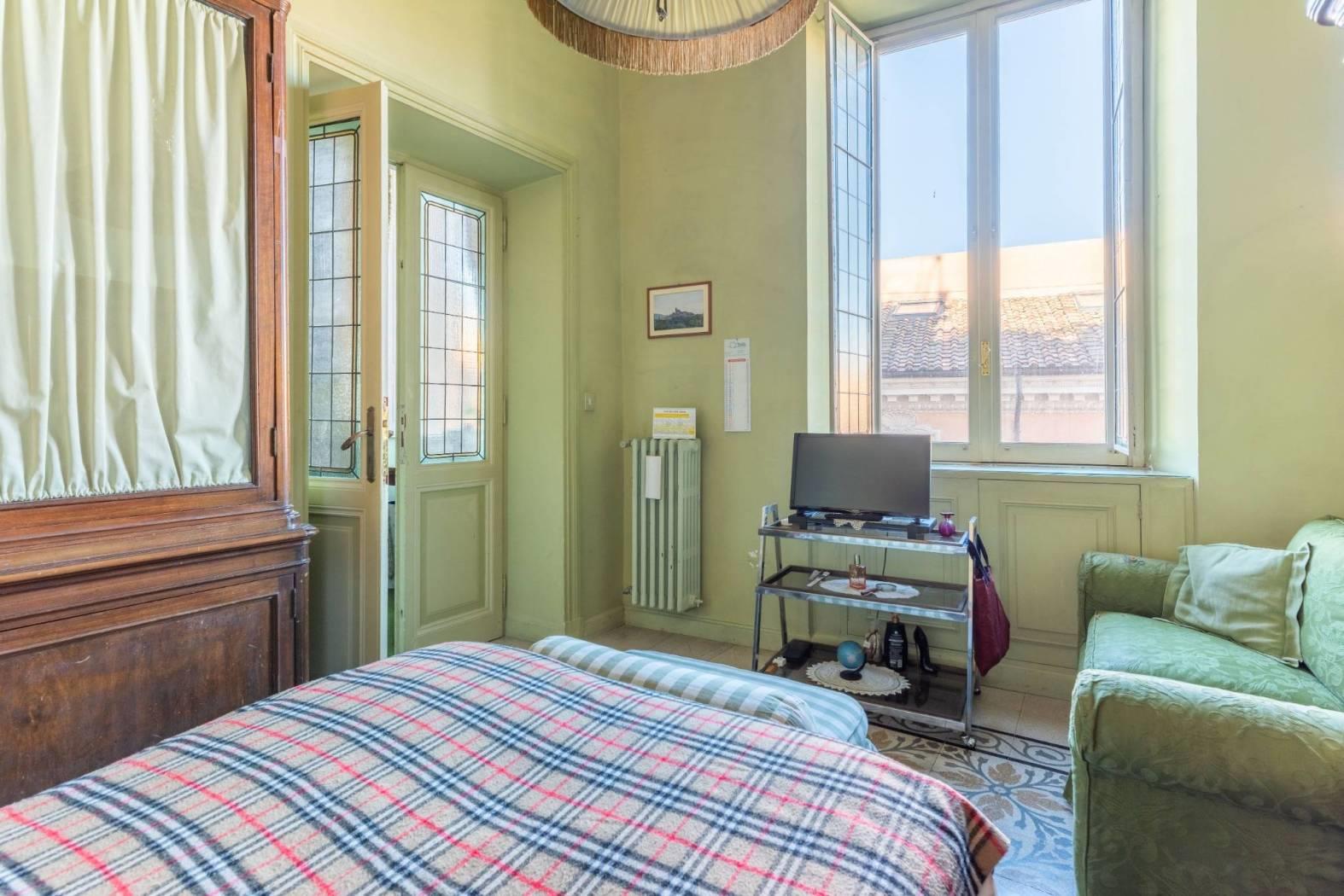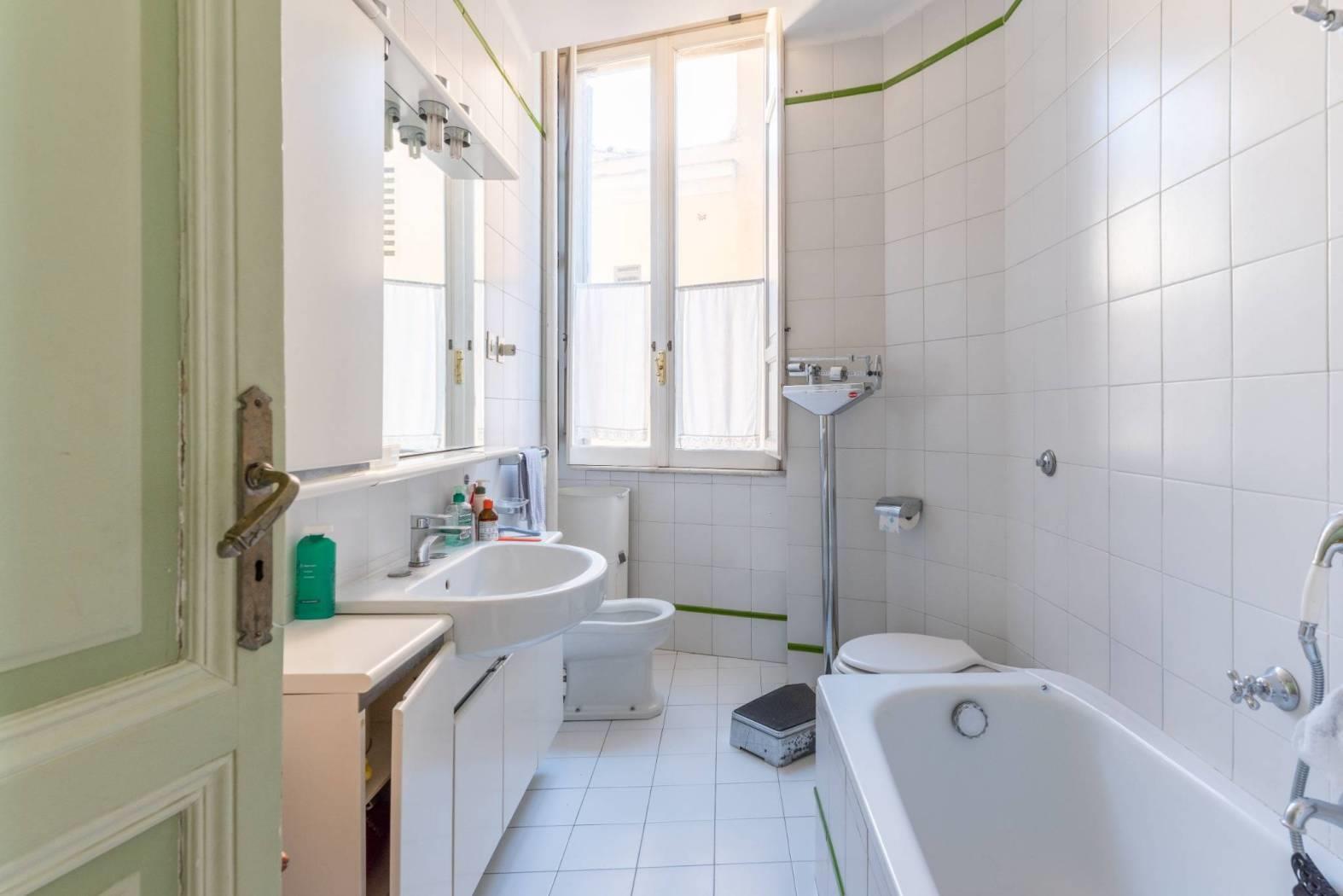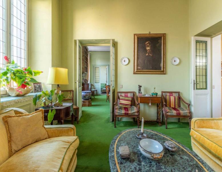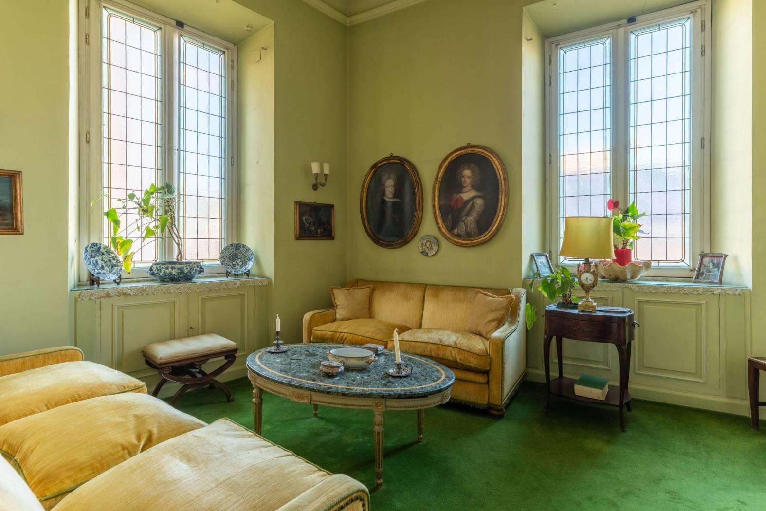 Entriamo in un ambiente di ingresso che smista le due zone della casa. Di qui si accede alla rappresentanza, composta da tre belle sale in infilata tra loro: una ampia sala da pranzo centrale, un salotto angolare più intimo e uno studio attualmente attrezzato come seconda camera da letto. La zona di servizio ha una cucina abitabile e un piccolo bagno. Infine vi è una camera da letto padronale davvero molto grande, con il suo bagno ed una stanza en suite attualmente adibita a comoda cabina armadio.