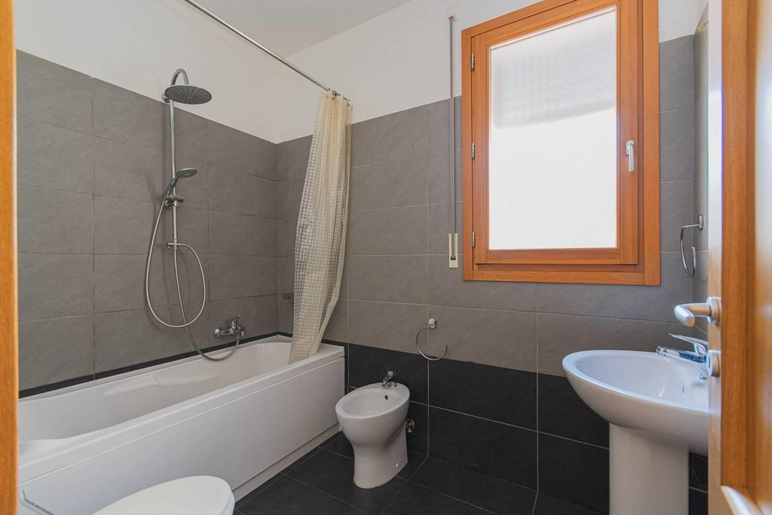 Primo piano composto da soggiorno con angolo cottura arredato, disimpegno, camera matrimoniale con bagno con vasca e finestra, seconda camera e bagno con doccia.