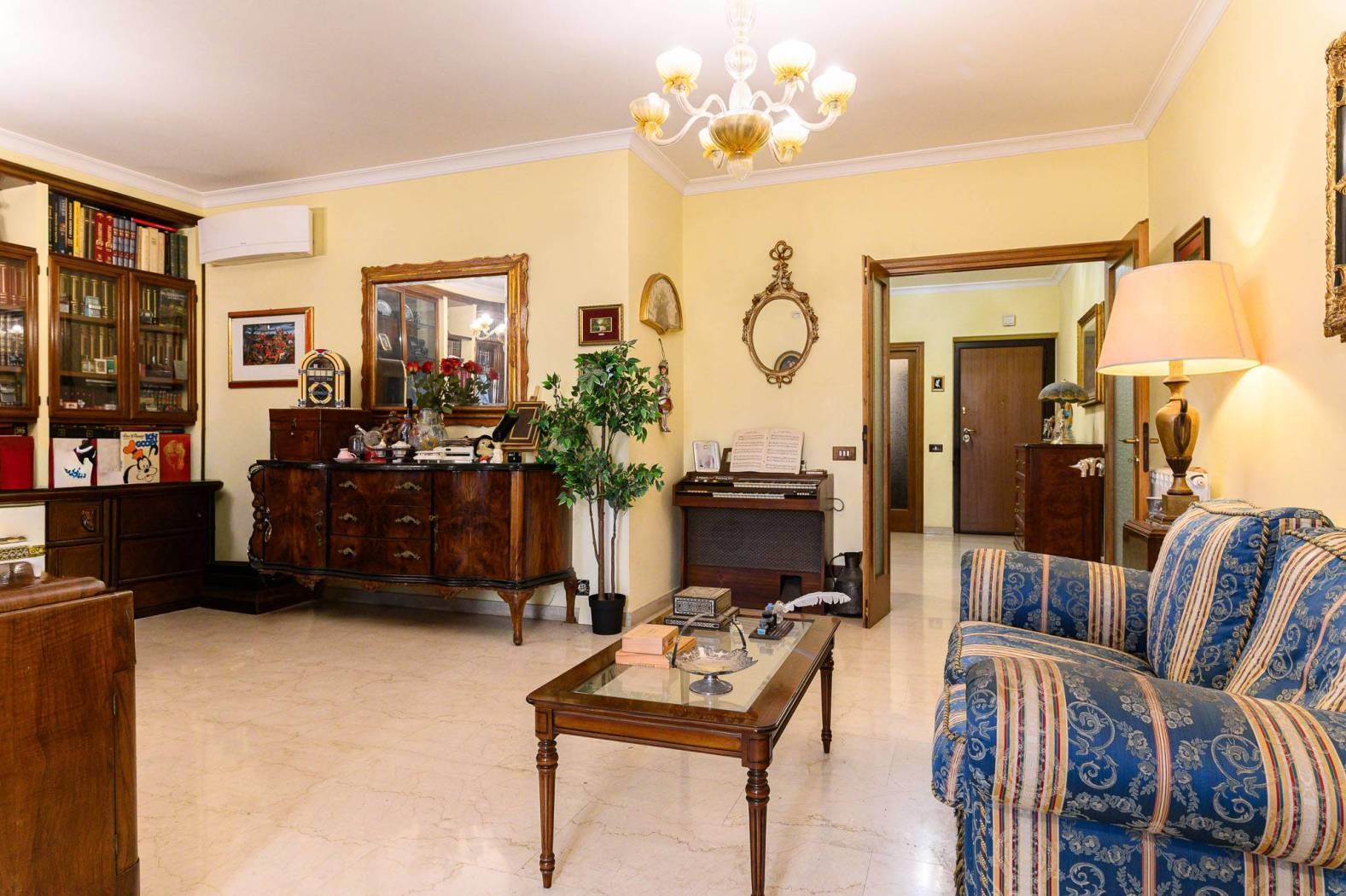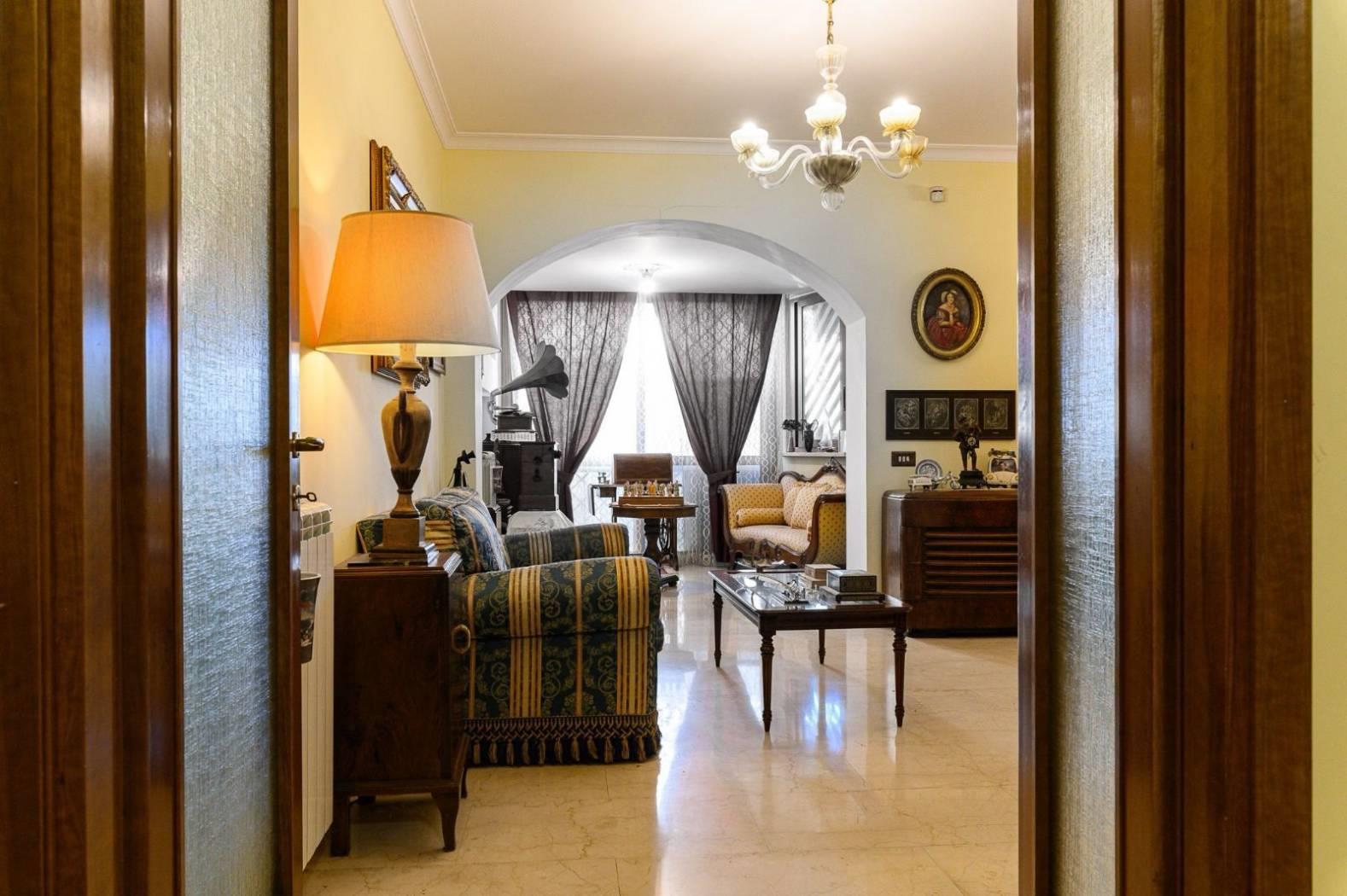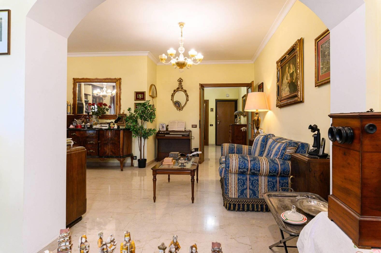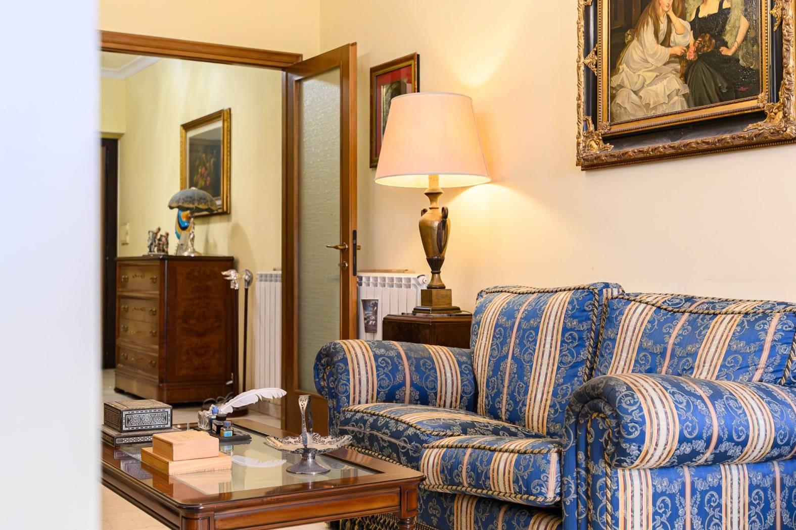 L’appartamento è composto da: salone doppio con boiserie in legno massello, cucina abitabile, due camere da letto matrimoniali, due bagni, ed un ampio terrazzo.