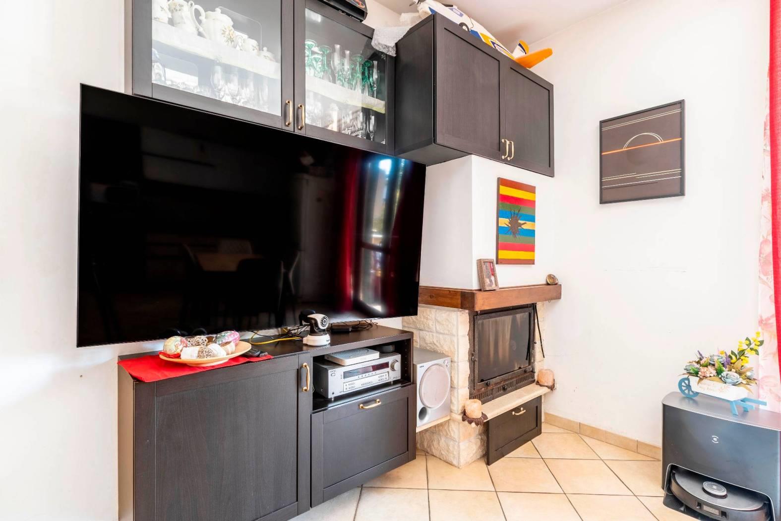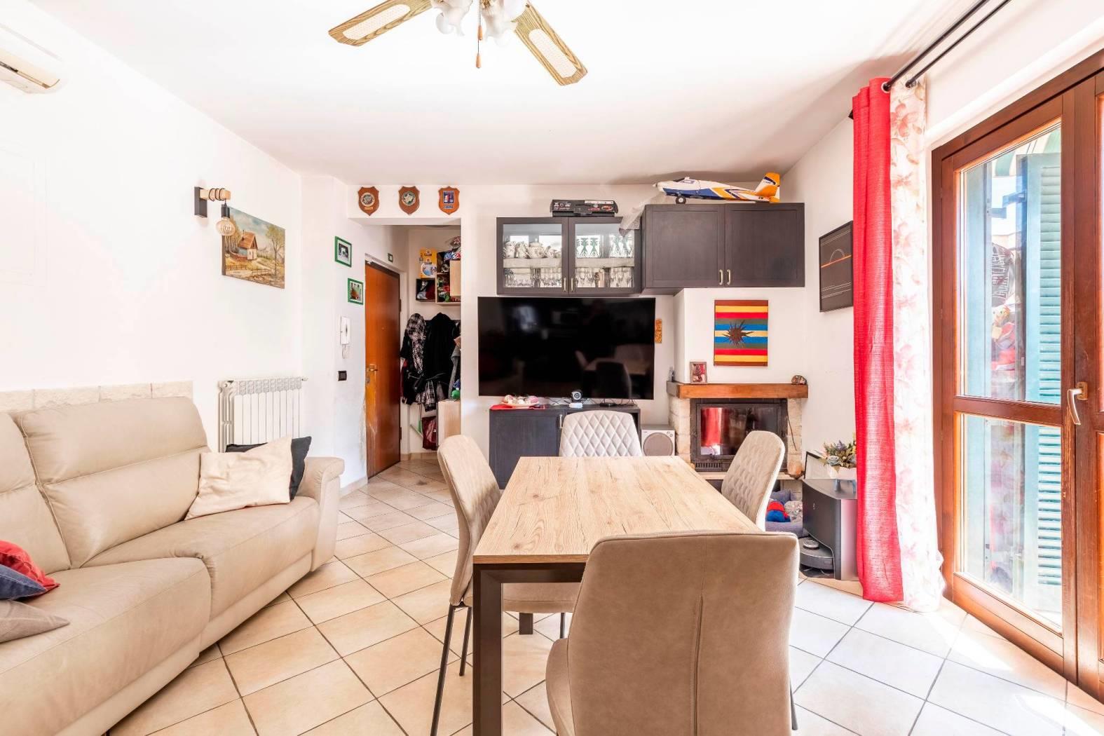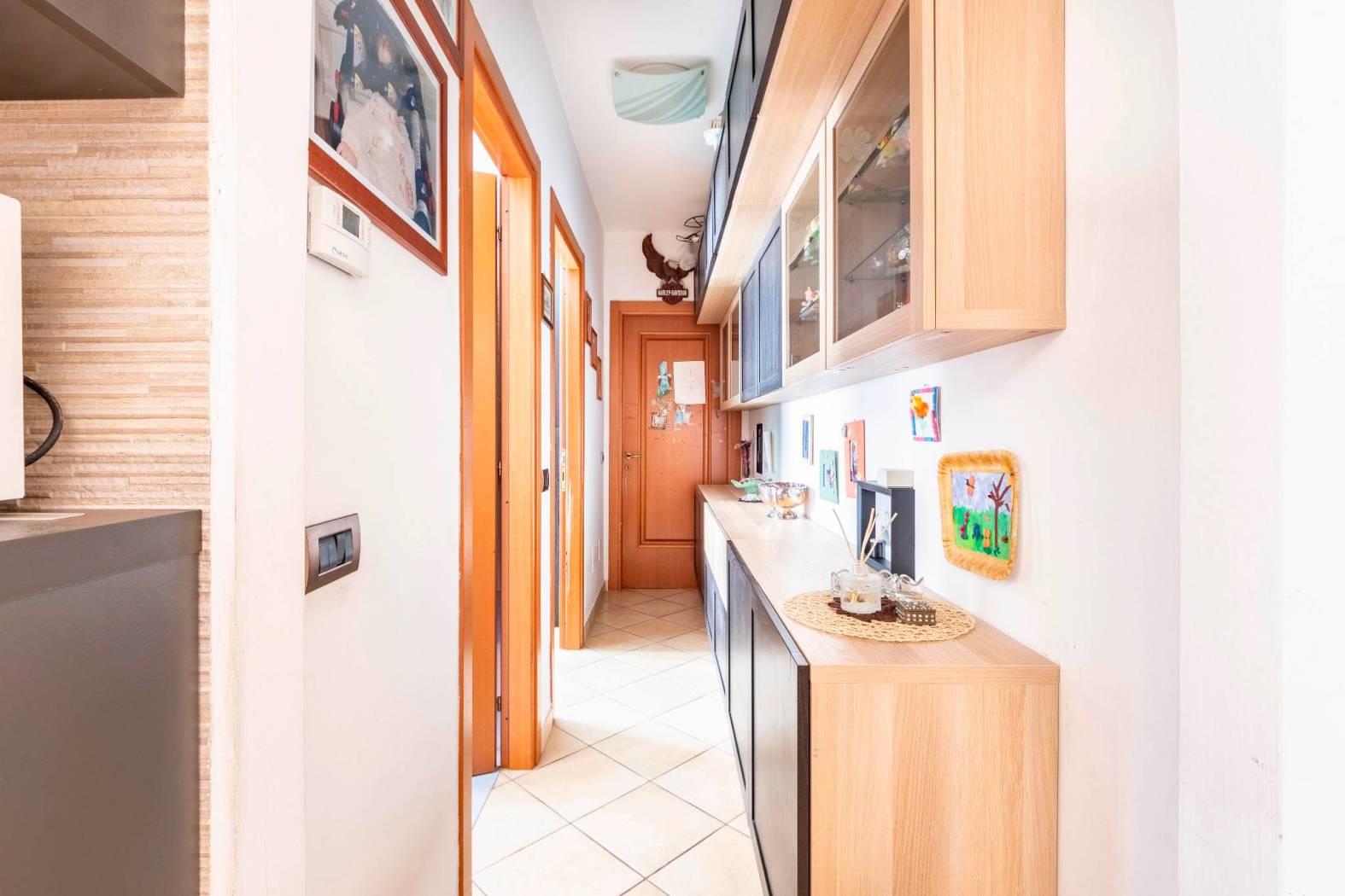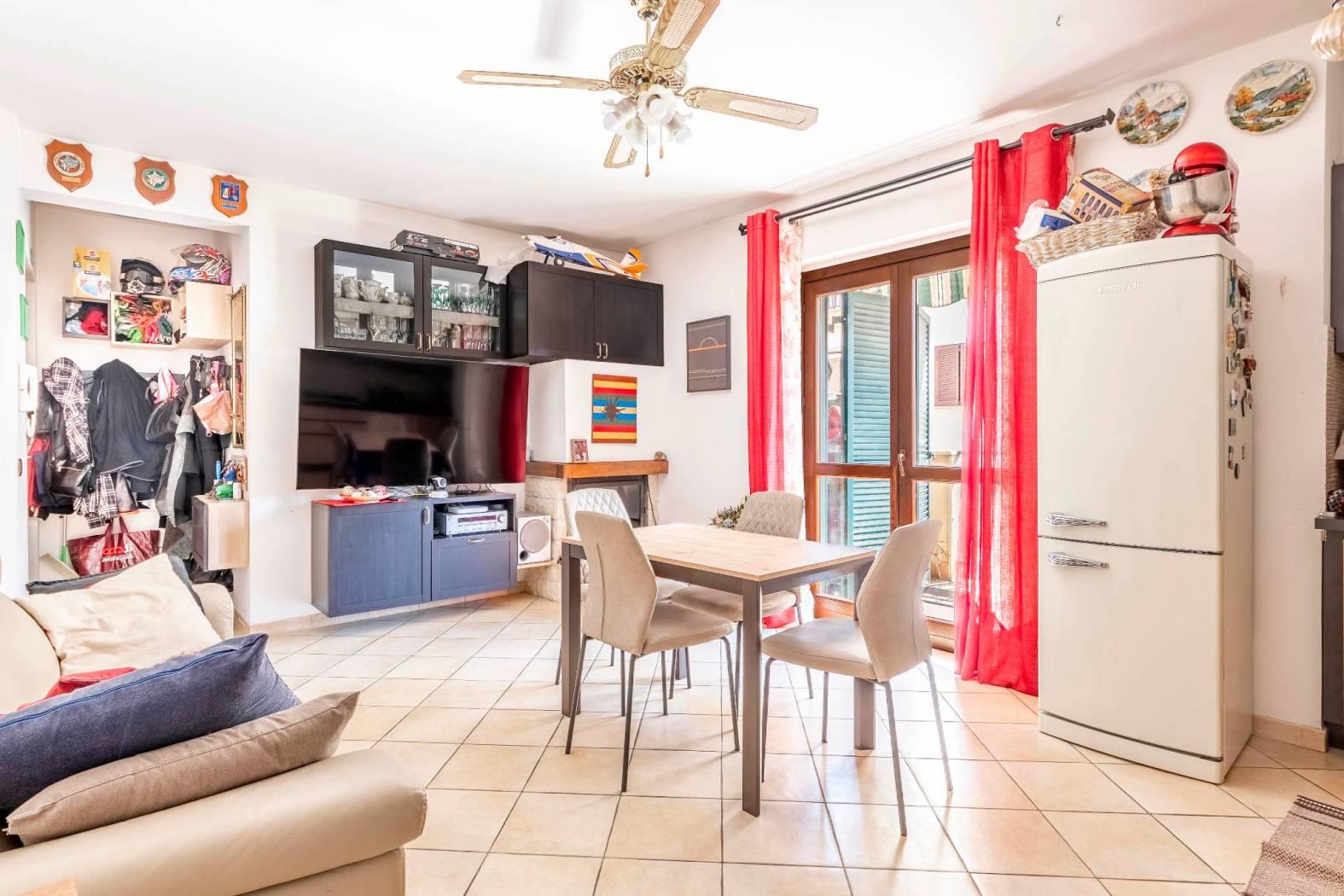 La disposizione interna prevede un ingresso, salone con camino e cucina a vista e con porta finestra con uscita sul terrazzino, una camera matrimoniale, una cameretta ed un bagno finestrato con box doccia. Completa la proprietà una cantina di circa 5mq al piano seminterrato raggiungibile tramite ascensore ed un posto auto assegnato all'interno dell'area condominiale con accesso tramite cancello automatico.