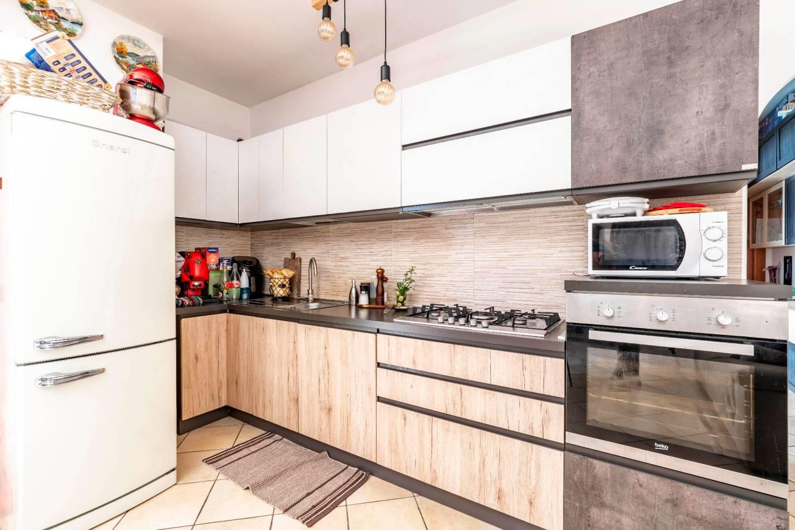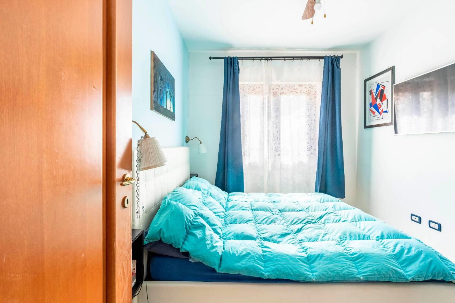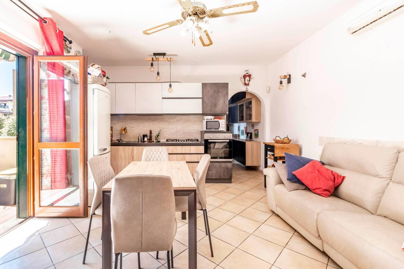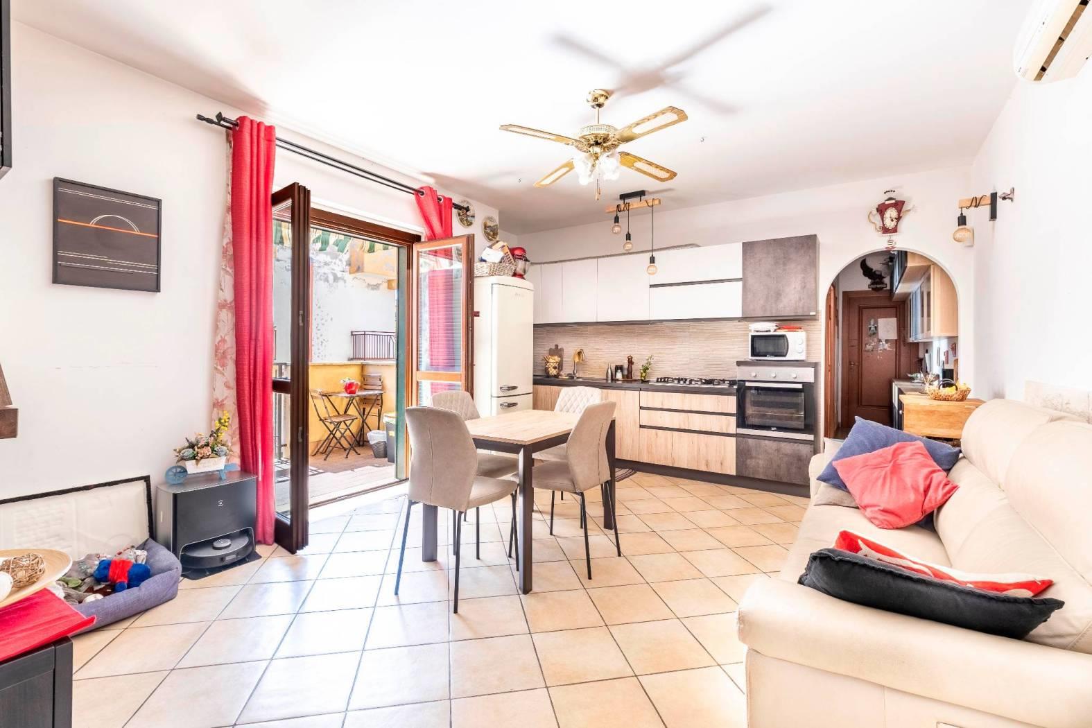 La disposizione interna prevede un ingresso, salone con camino e cucina a vista e con porta finestra con uscita sul terrazzino, una camera matrimoniale, una cameretta ed un bagno finestrato con box doccia. Completa la proprietà una cantina di circa 5mq al piano seminterrato raggiungibile tramite ascensore ed un posto auto assegnato all'interno dell'area condominiale con accesso tramite cancello automatico.
