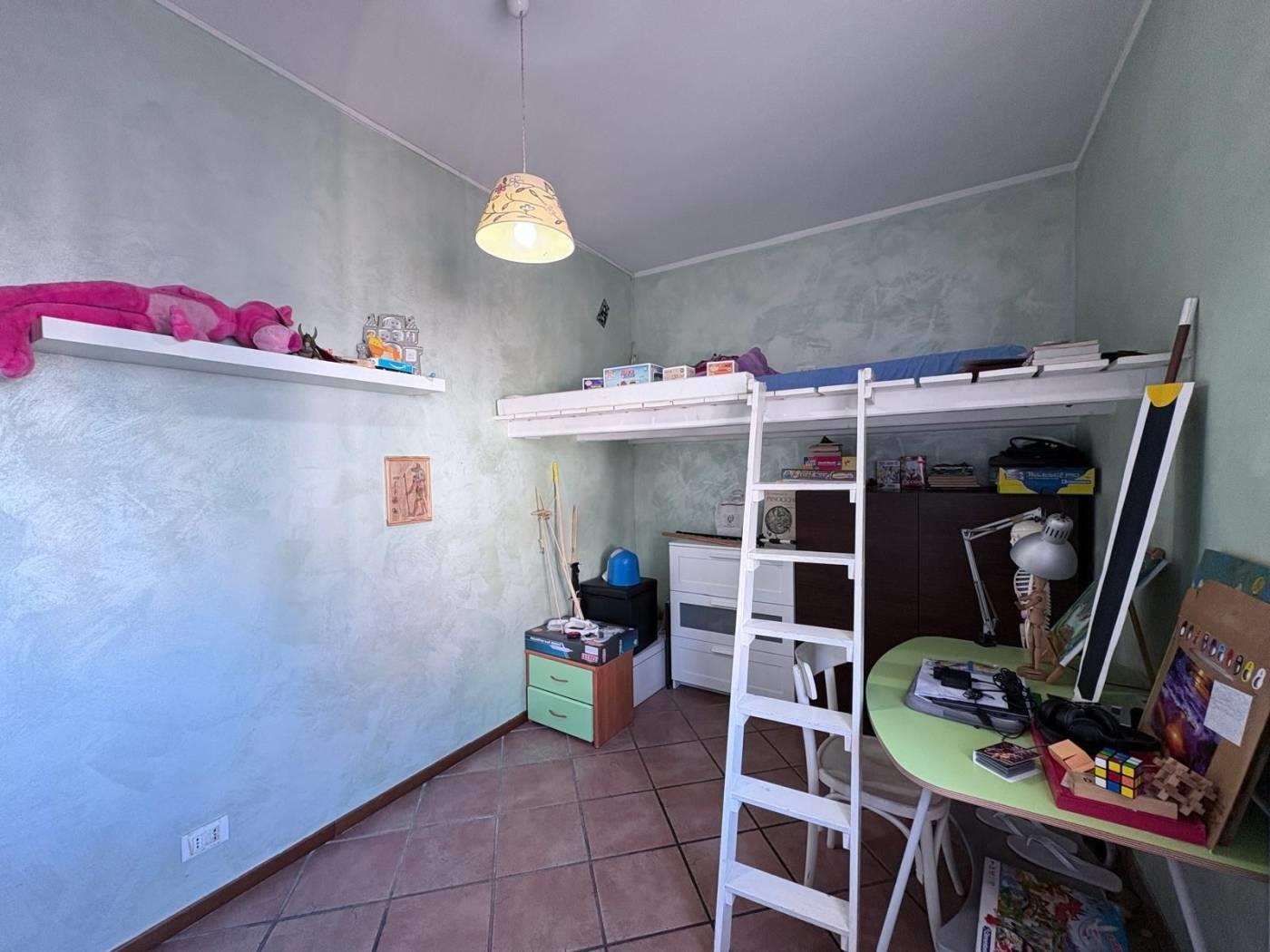 L’appartamento si sviluppa al piano terra per circa 95 mq ed è composto da un luminoso soggiorno con camino, un cucinotto funzionale e un comodo ripostiglio. La zona notte comprende due camere matrimoniali, di cui una con bagno en suite, una cameretta e un secondo bagno. Completa il piano un ampio balcone di circa 40 mq, ideale come spazio esterno vivibile.