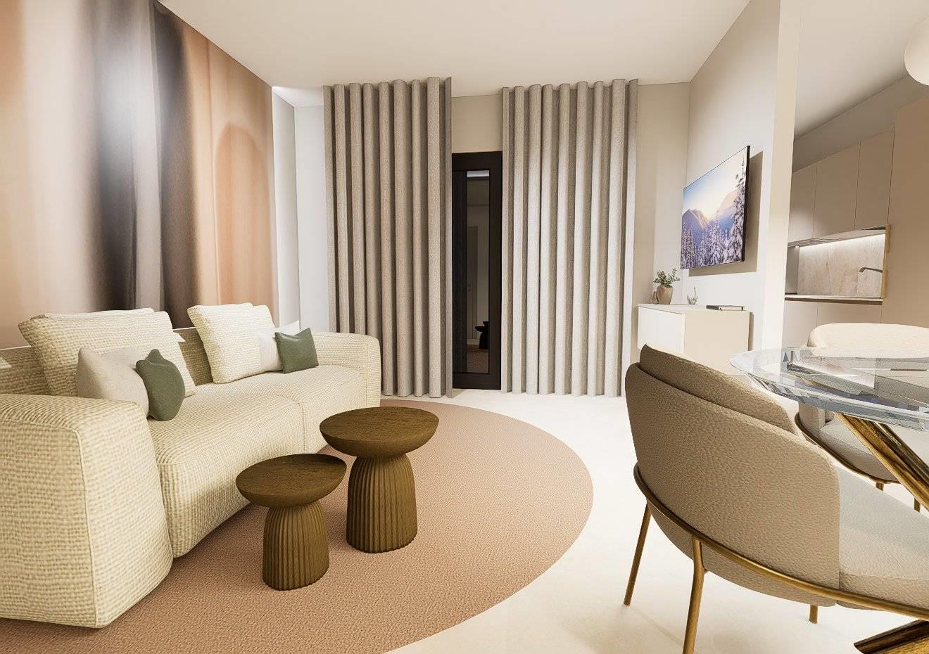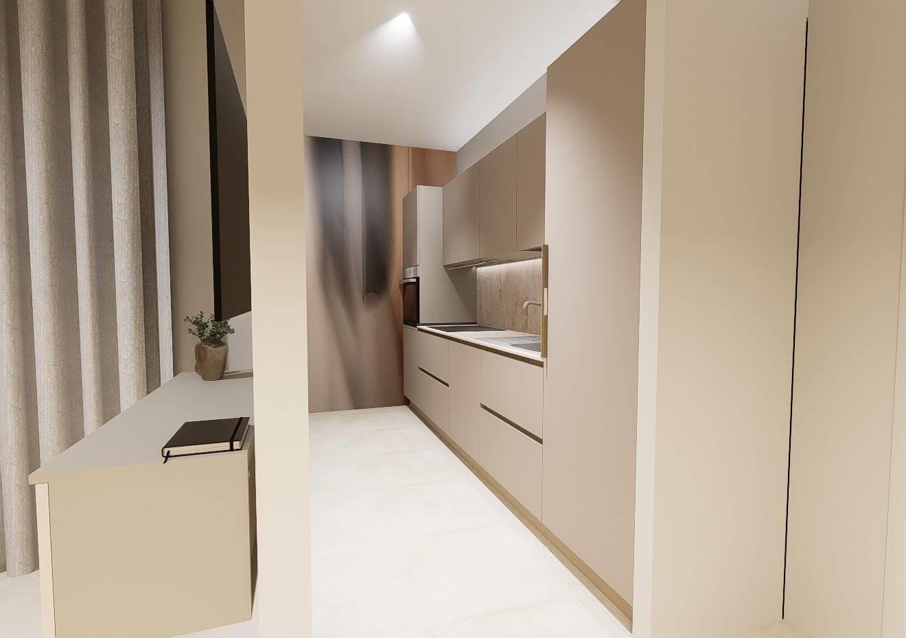 Appartamento piano primo ed ultimo, composto da salone con cucina a vista, due camere, due bagni, disimpegno, ampia terrazza con armadio tecnico, balcone, box auto e cantina con ascensore di collegamento al piano interrato, posto auto scoperto nell'area interna al complesso;