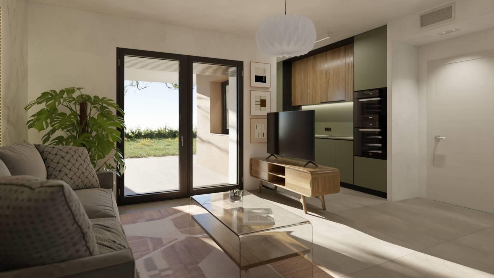 Appartamento piano terra, composto da salone con cucina a vista, due camere, due bagni, disimpegno, porticato con armadio tecnico, giardino, box auto e cantina con ascensore di collegamento al piano interrato, posto auto scoperto nell'area interna al complesso;