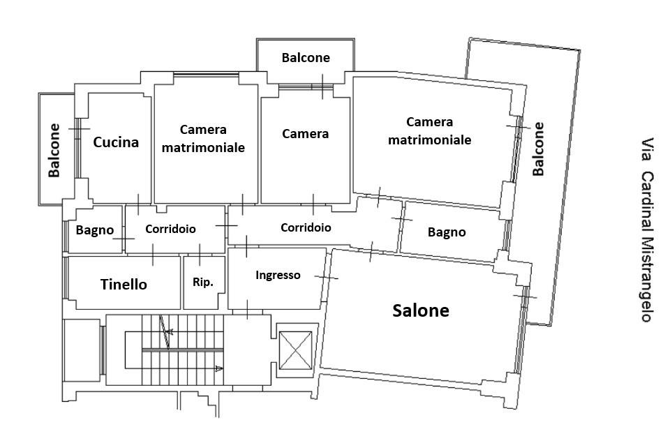 Un accogliente ingresso introduce all'ampio salone di rappresentanza e alla zona pranzo composta da cucina abitabile e tinello, due spaziose camere matrimoniali ed una cameretta, due bagni entrambi finestrati ed un pratico ripostiglio; la proprietà è arricchita da tre balconi; il principale, un vero sfogo esterno di 16 mq , è accessibile sia dal salone che da una delle camere matrimoniali, i due più piccoli servono rispettivamente la cucina e la cameretta.