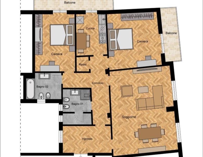 L'appartamento è così composto: ampio ingresso di rappresentanza, salone luminoso, tre camere da letto spaziose, cucina abitabile, doppi servizi (di cui uno recentemente e completamente ristrutturato), comodo ripostiglio, due balconi che offrono uno sfogo esterno funzionale.