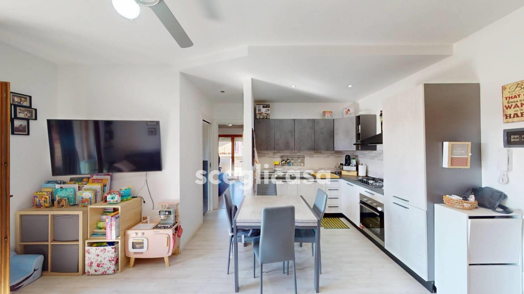 La zona living con angolo cottura è organizzata in un unico ambiente regolare, che può ospitare comodamente tavolo da pranzo e zona salotto/TV, con pavimentazione in gres porcellanato chiaro posato in continuità e pareti rifinite con pittura neutra. L'angolo cottura integrato, a vista, è totalmente arredato e corredato di elettrodomestici.