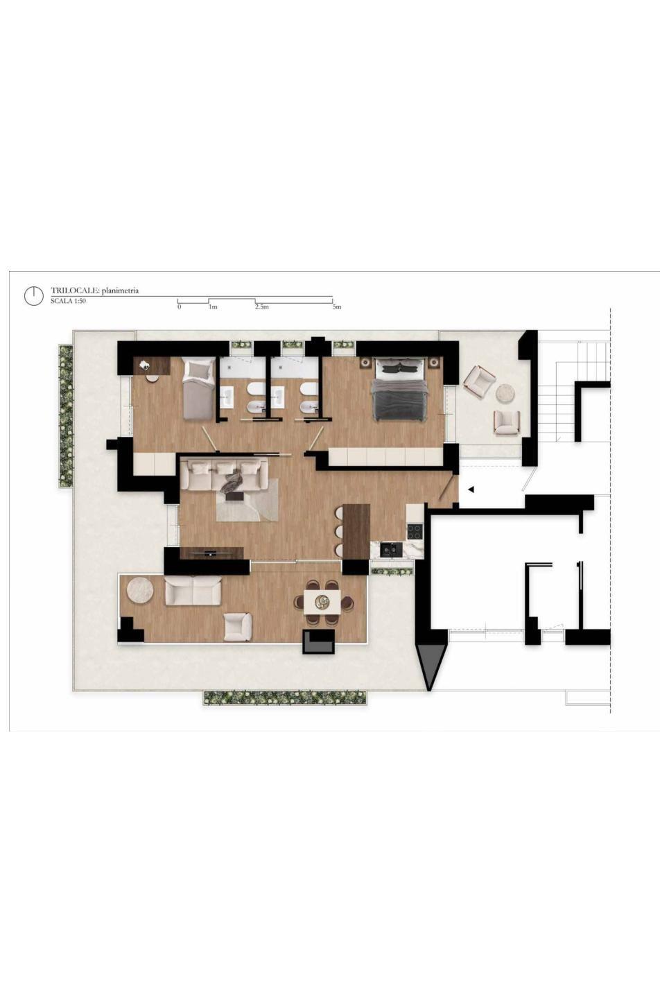 TRILOCALE composto da soggiorno con angolo cottura, salotto, due camere, doppi servizi, due terrazzi abitabili.