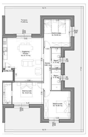 COMPOSIZIONE: 104 MQ interni, ampio salone con cucina a vista, tre camere matrimoniali di cui una con cabina armadio , due bagni e 73 mq di terrezzo perimetrale