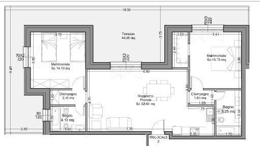 COMPOSIZIONE: 90 mq interni ,ampio salone con cucinotto , due camere matrimoniali, due bagni e terrazzo di 44 mq perimetrale