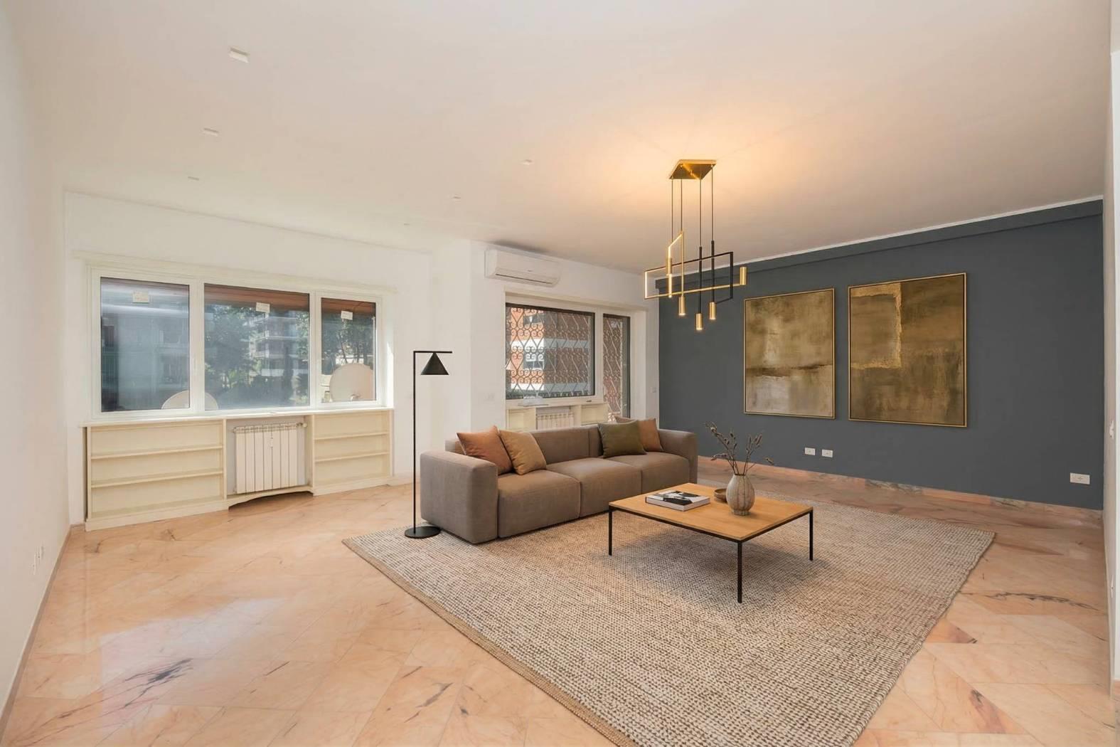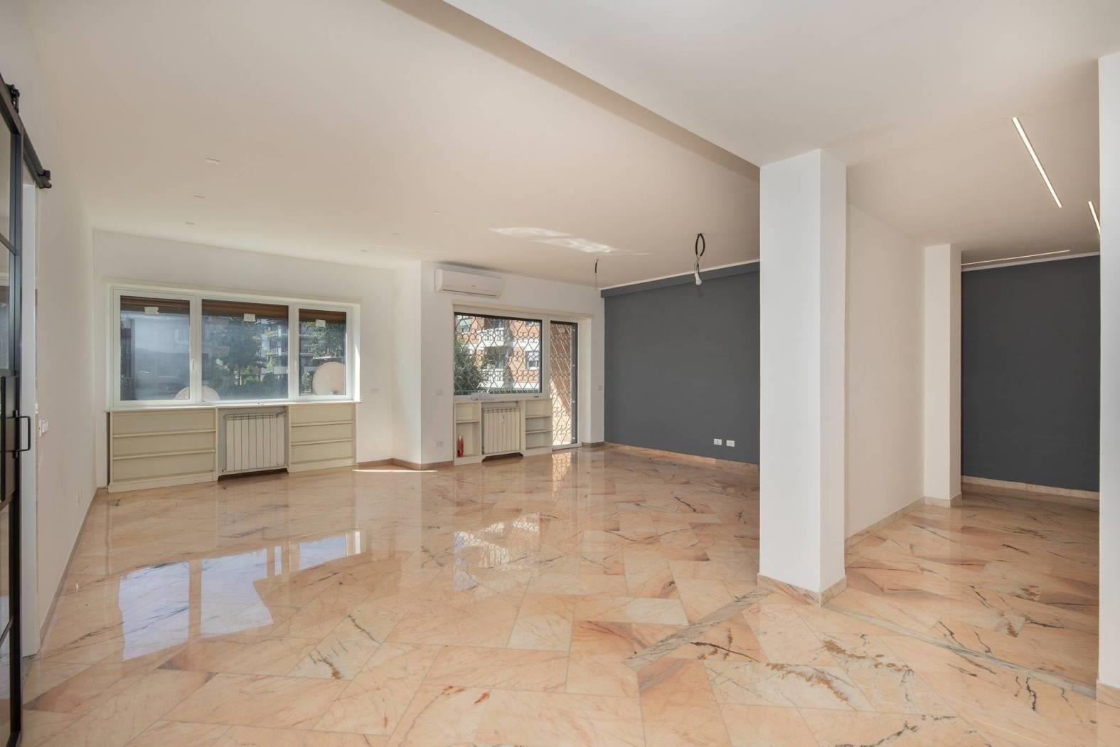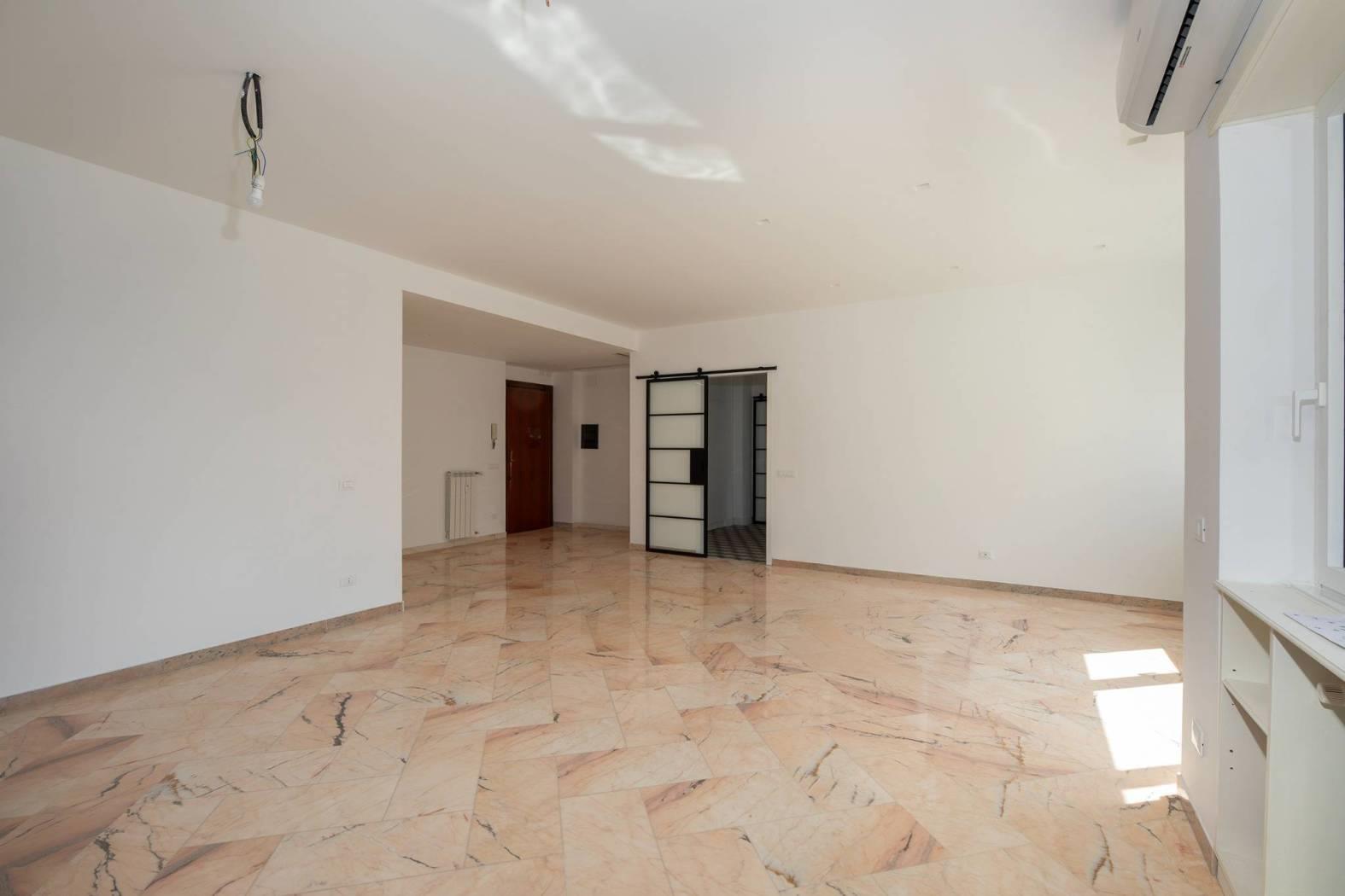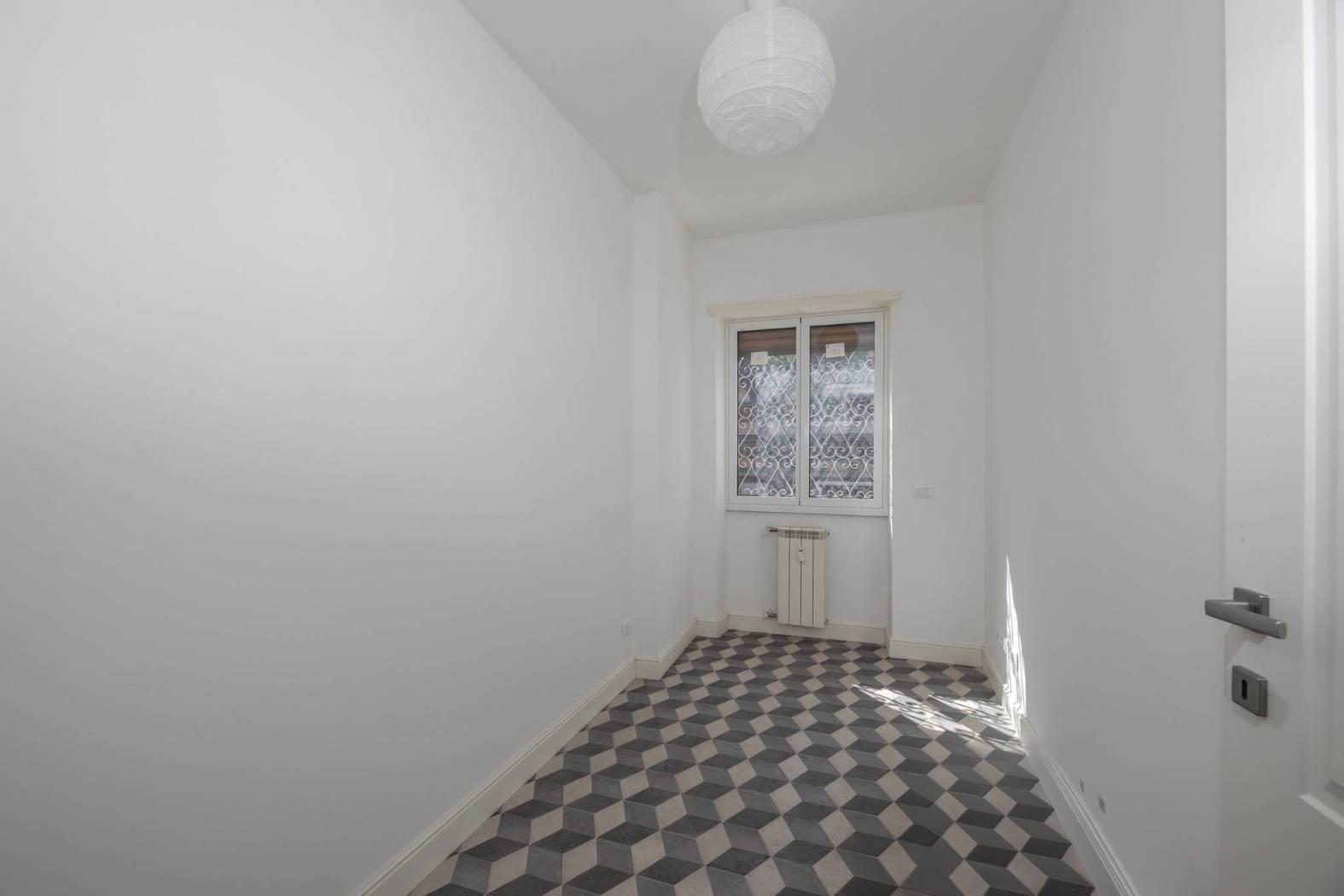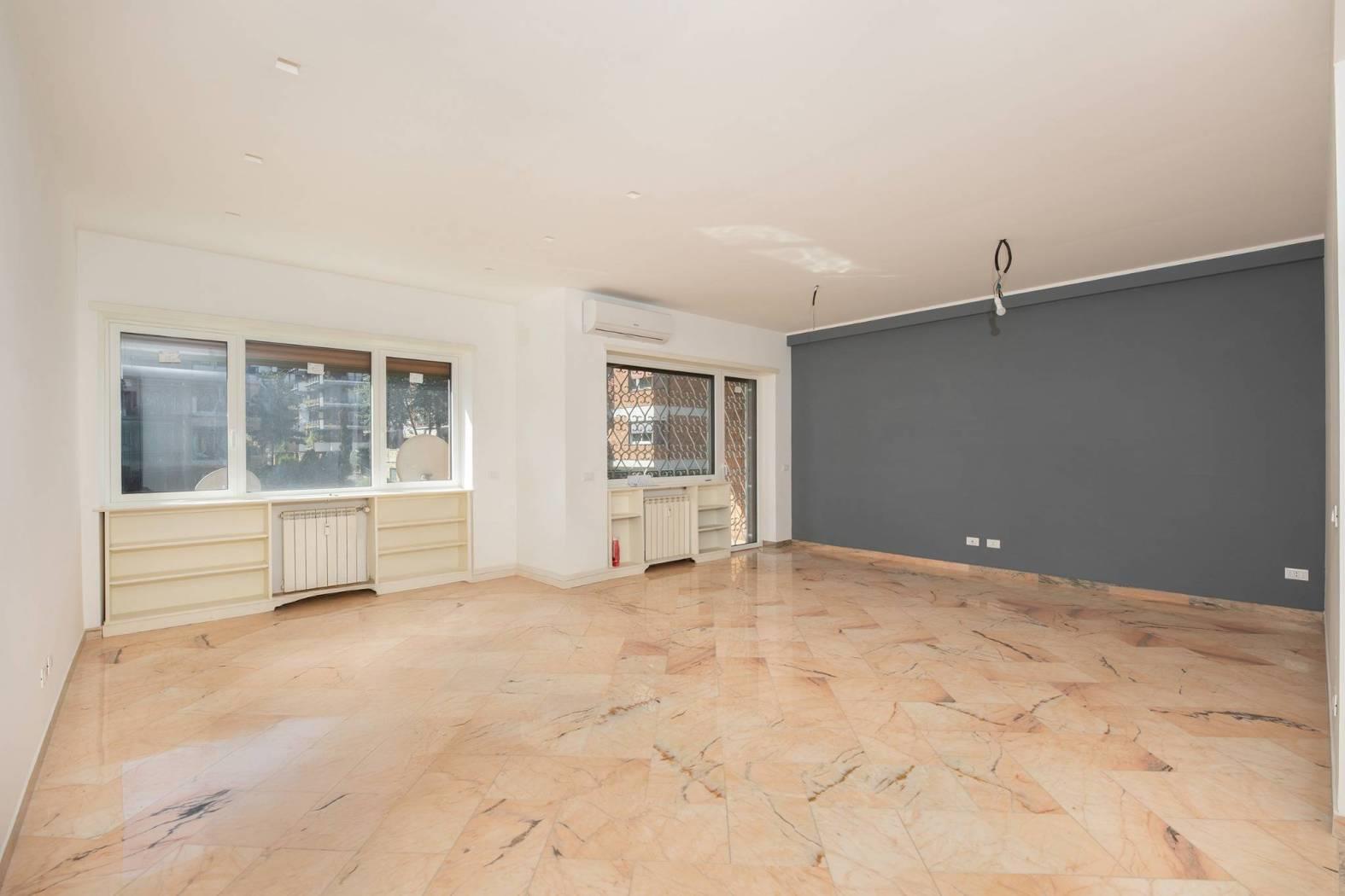 L’immobile e’ posto al piano primo dello stabile e si affaccia nel “verde” della zona. Unico livello, soluzione angolare con doppio affaccio: a sud-ovest. Totalmente ed elegantemente ristrutturato: infissi bianchi con doppio vetro termico/antisfondamento, porte per interni di designer, ambedue i bagni sia negli impianti che nei rivestimenti completamente nuovi, serrande coibentate elettriche. Pavimenti e rivestimenti di prima scelta. Marmi a terra. Grate di sicurezza. Portone blindato di ingresso alla casa. Split aria condizionata c/f. Antenna centralizzata. Riscaldamento centralizzato.