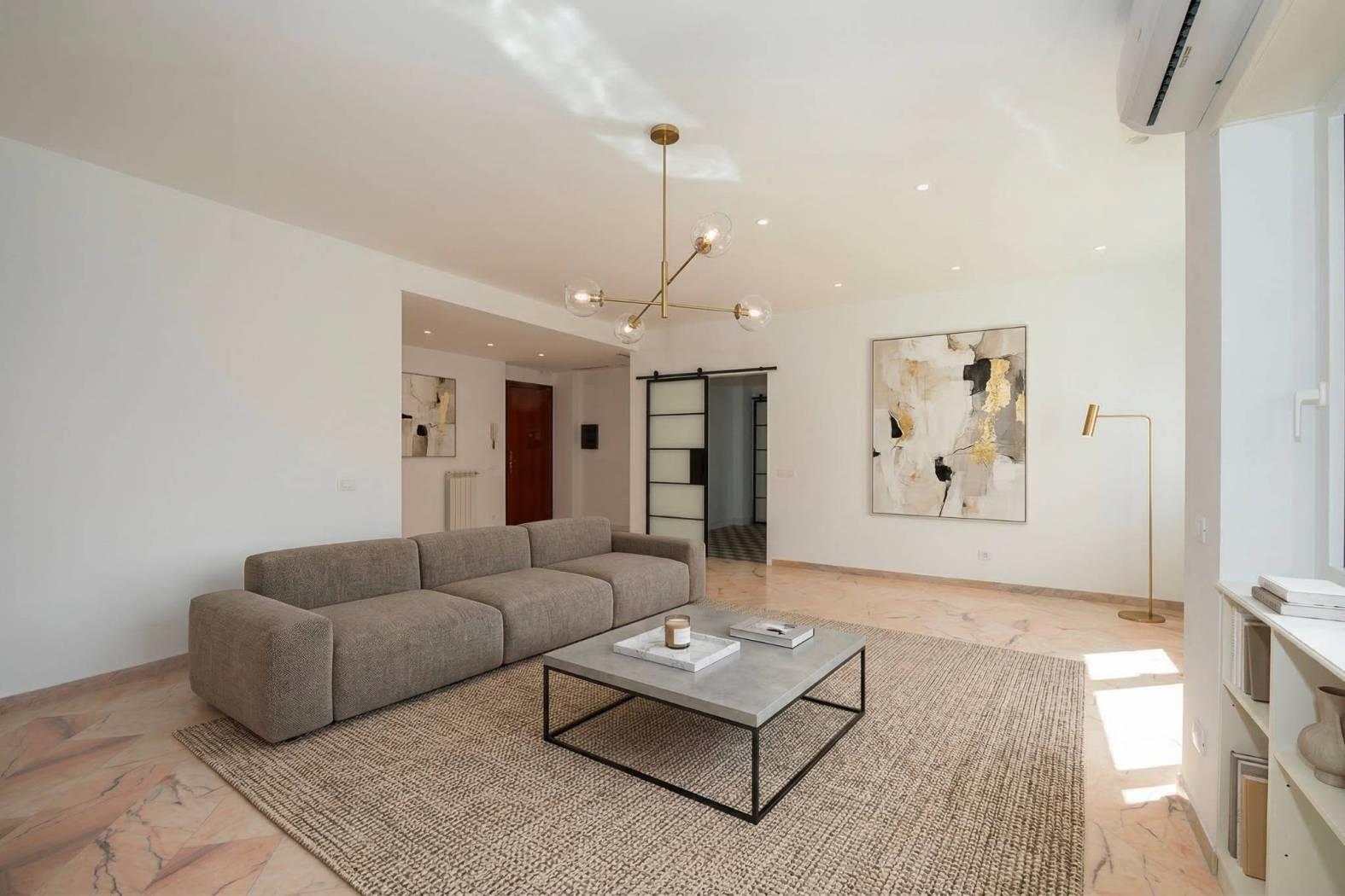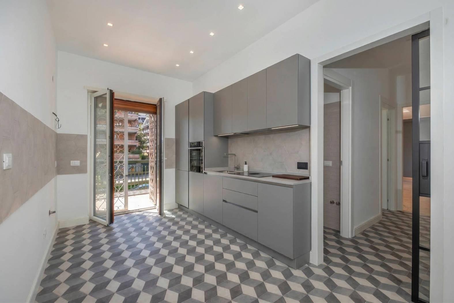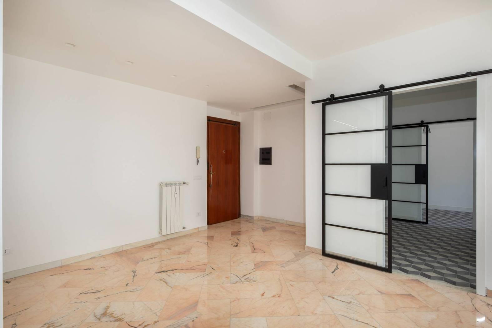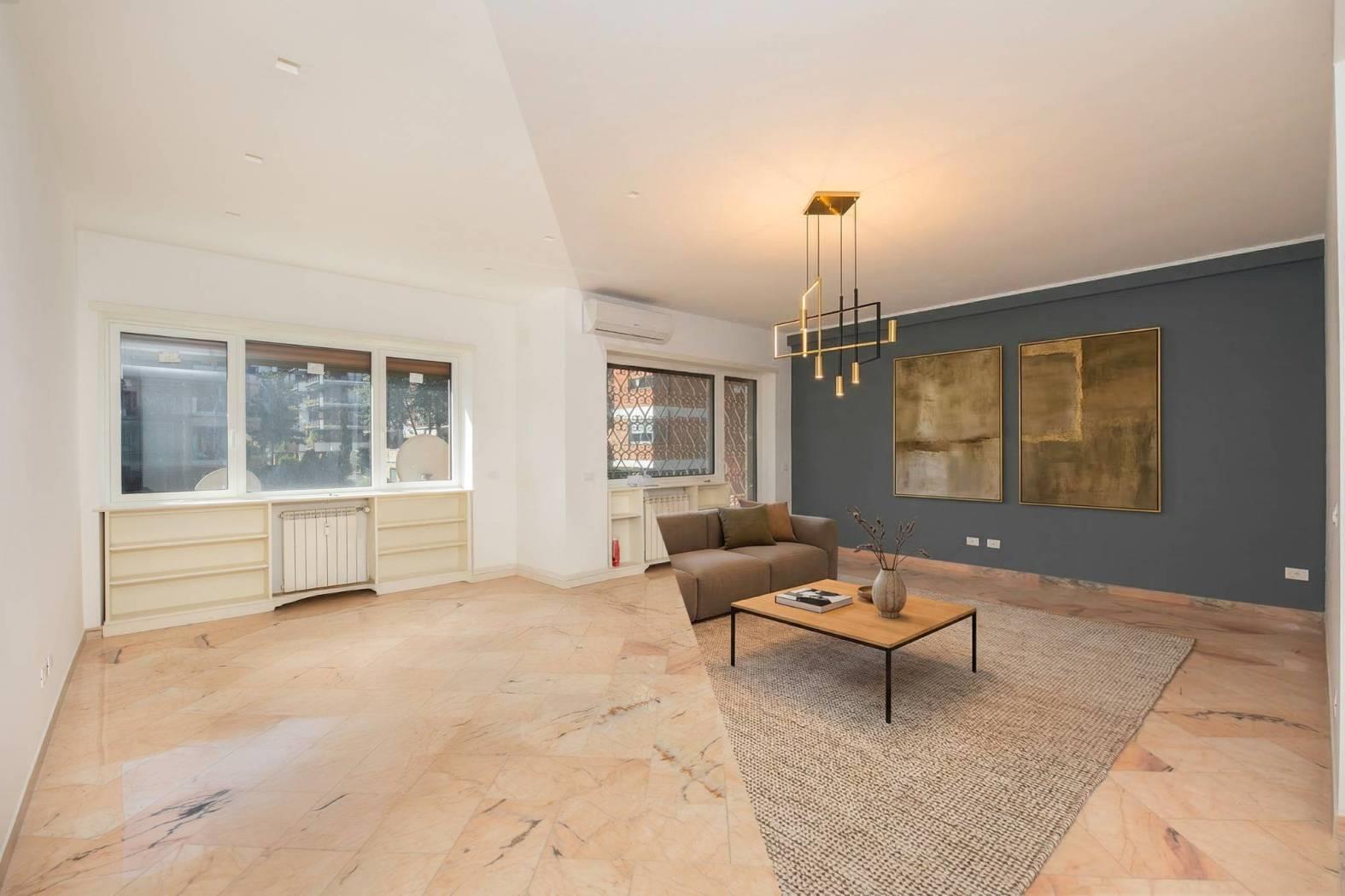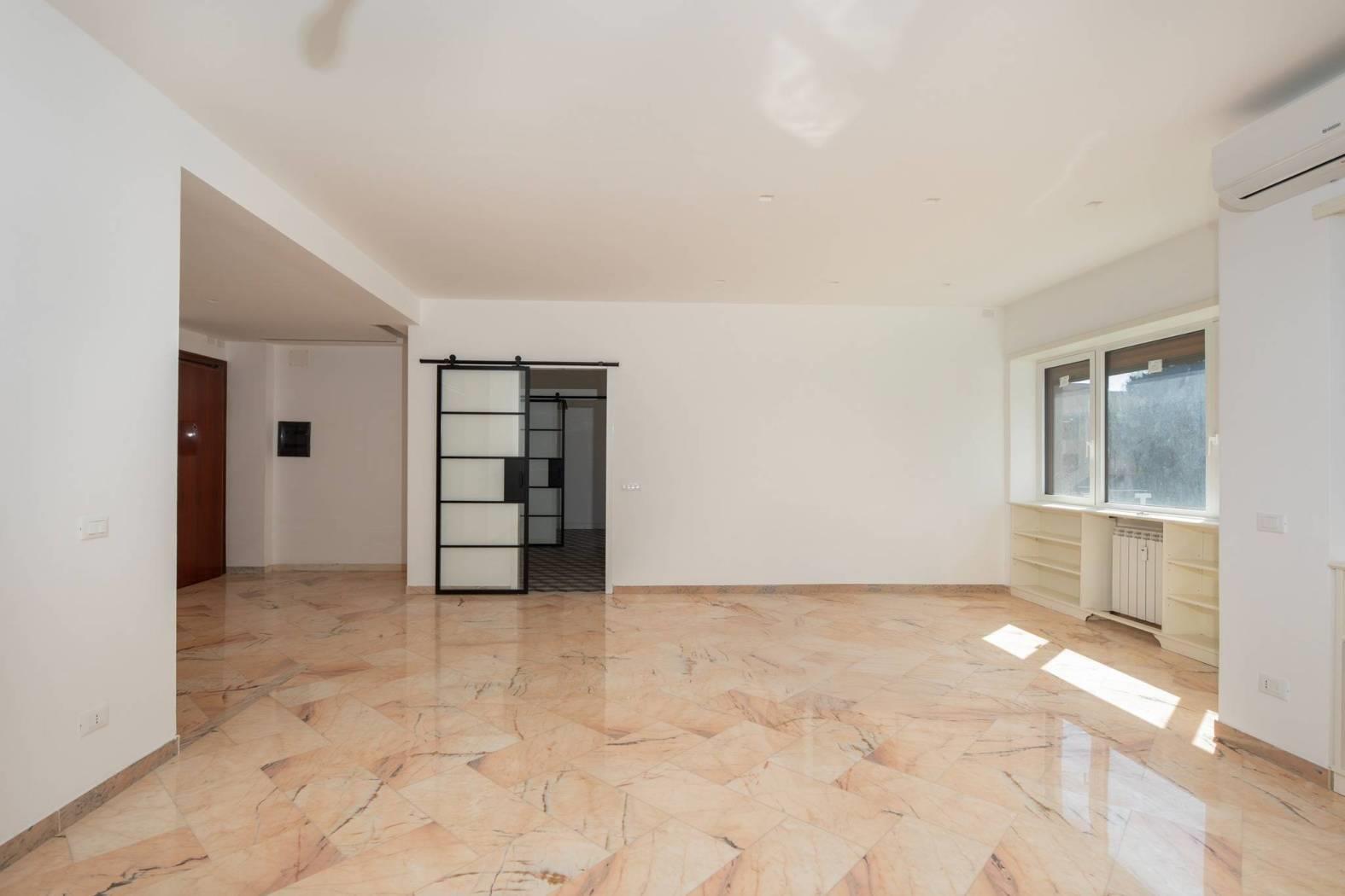 L’immobile e’ posto al piano primo dello stabile e si affaccia nel “verde” della zona. Unico livello, soluzione angolare con doppio affaccio: a sud-ovest. Totalmente ed elegantemente ristrutturato: infissi bianchi con doppio vetro termico/antisfondamento, porte per interni di designer, ambedue i bagni sia negli impianti che nei rivestimenti completamente nuovi, serrande coibentate elettriche. Pavimenti e rivestimenti di prima scelta. Marmi a terra. Grate di sicurezza. Portone blindato di ingresso alla casa. Split aria condizionata c/f. Antenna centralizzata. Riscaldamento centralizzato.
