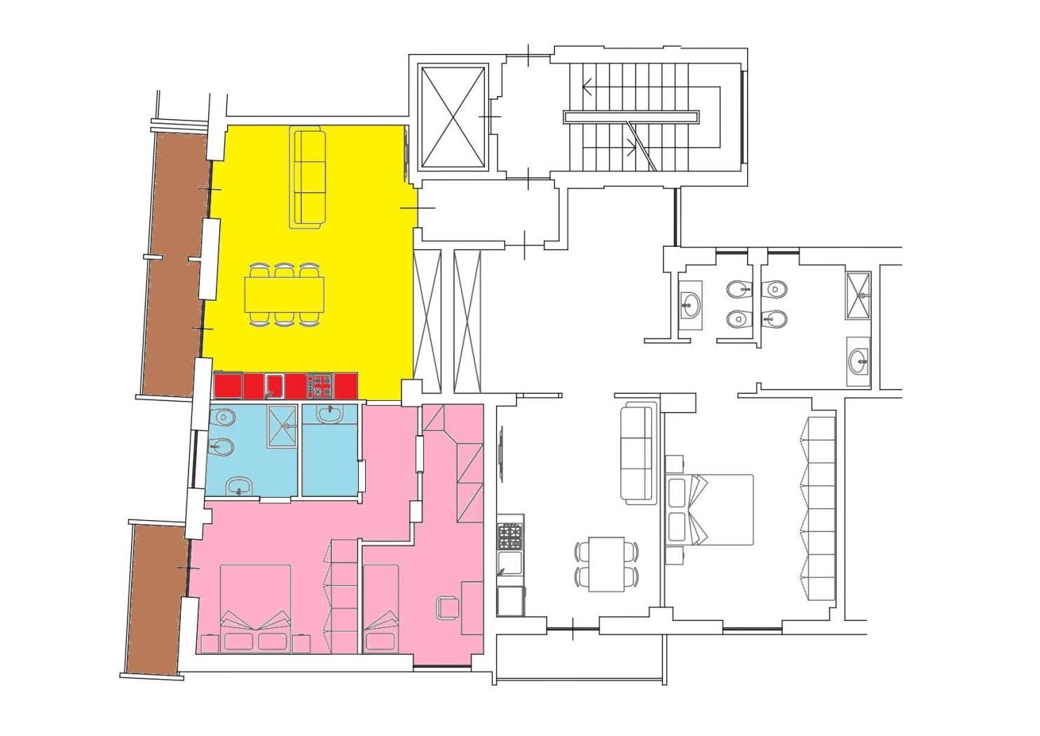 L’ingresso si apre su un ampio salone con cucina a vista con doppia uscita sul balcone, due camere matrimoniali di cui una con servizio privato e uscita al secondo balcone e un secondo servizio.