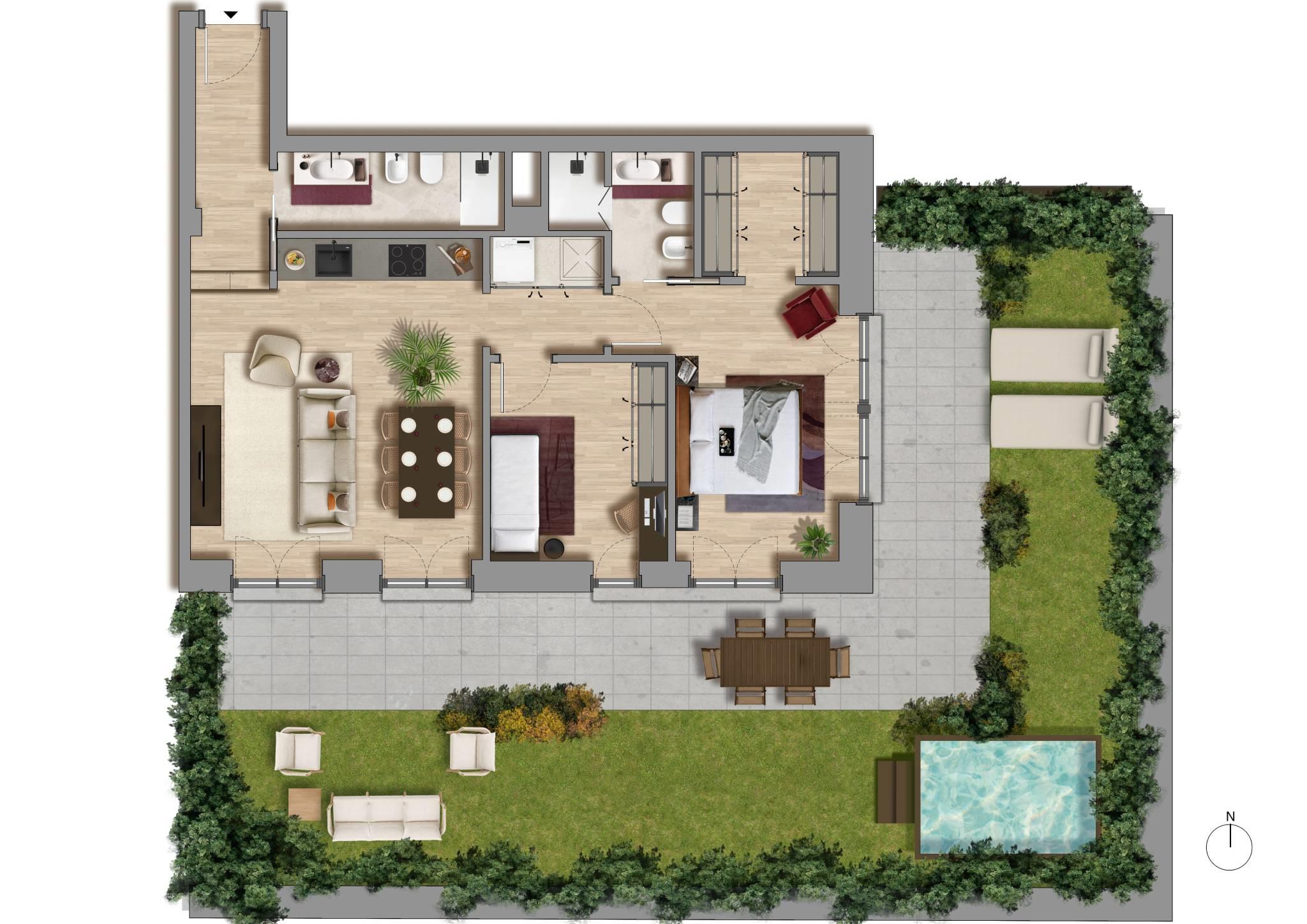 TRILOCALE INT. 3 - Ampio trilocale di generosa metratura, arricchito da un giardino privato di grandi dimensioni, una vera rarità nella zona. L'abitazione offre spazi interni ben distribuiti e luminosi, ideali per chi desidera comfort abitativo senza rinunciare al privilegio di un grande spazio esterno, difficilmente reperibile in questo contesto urbano. In posizioni angolare l'immobile è composto da ampio ingresso, la zona living luminosa ed accogliente integra una cucina a vista e soggiorno in un unico spazio conviviale. Camera matrimoniale ampia e luminosa con bagno en suite, arricchita da una cabina armadio dedicata pensata per offrire massima funzionalità ed un elegante organizzazione degli spazi creando un ambiente intimo e raffinato. Camera singola accogliente e funzionale, pronta ad adattarsi nel tempo alle esigenze di chi la vive. Secondo bagno, moderno e raffinato, caratterizzato da una doccia walk-in, che dona all'ambiente un'estetica pulita e contemporanea, offrendo al contempo massimo comfort e praticità. Locale lavanderia dedicato, separato e funzionale, ideale per gestire le attività domestiche in modo ordinato e pratico, contribuendo a mantenere gli altri ambienti sempre organizzati. Tutti gli ambienti si affacciano sul giardino creando un dialogo costante tra indoor e outdoor. Silenziosa!