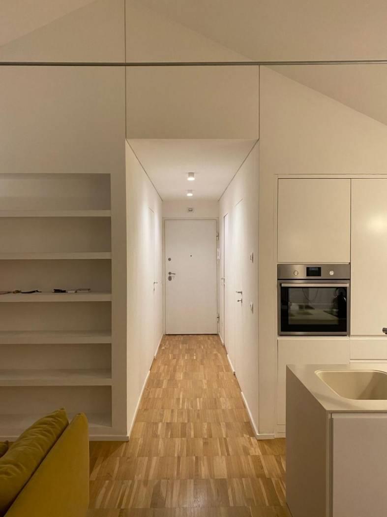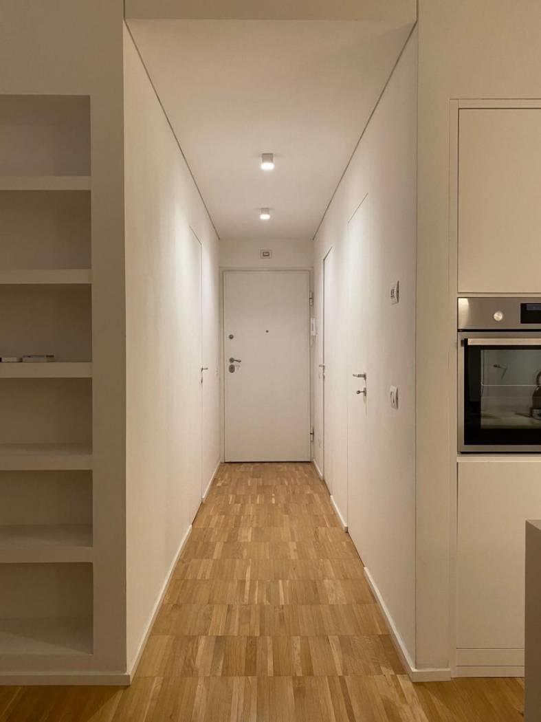 Materiali: L’intero appartamento vanta una pavimentazione in parquet massello industriale, che conferisce calore e un carattere "urban-chic" agli ambienti.
