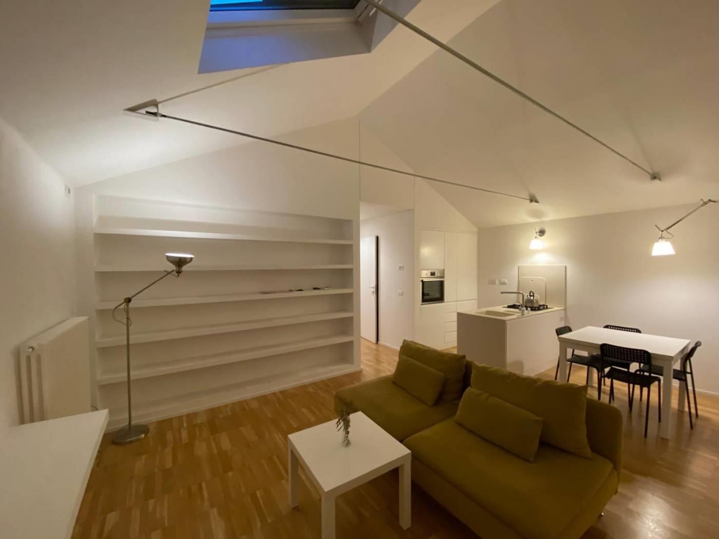 Zona Living: Un ambiente luminoso e arioso grazie all'inserimento di due Velux motorizzati che inondano lo spazio di luce naturale. La cucina a vista è un pezzo di design con piano di lavoro in Corian®.