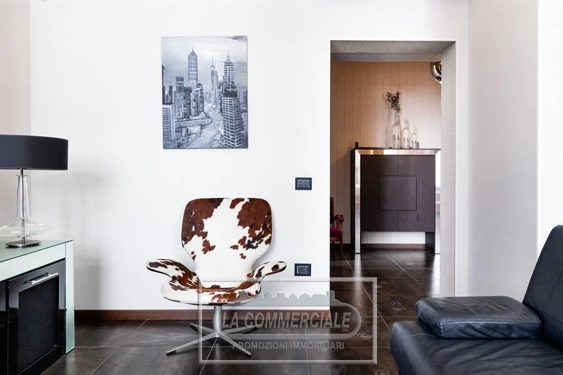 La caratteristica di questo appartamento è lo stile architettonico moderno, ancora più evidente per gli arredi firmati di grande pregio presenti e per i materiali utilizzati, di cui ci limitiamo a evidenziare i pavimenti della zona di rappresentanza in gres porcellanato effetto metallo color bronzo; i pavimenti della zona notte in parquet a listoni in noce walnut scuro, montati a correre; i rivestimenti e i pavimenti dei bagni in gres porcellanato con effetto pietra e i lavandini che sono delle opere d’arte moderna.