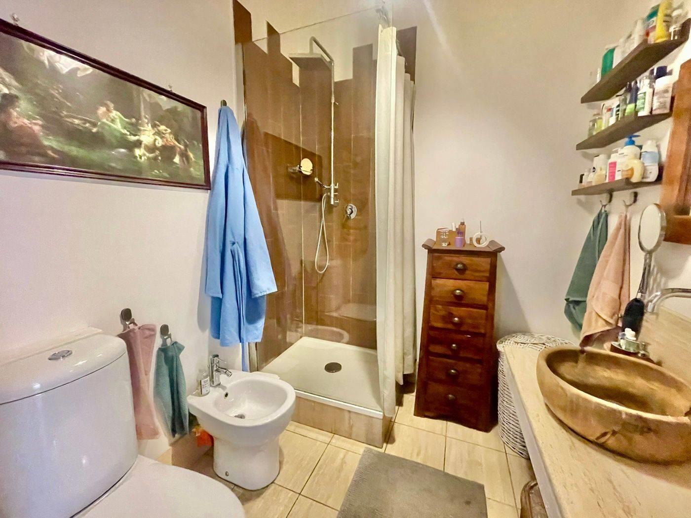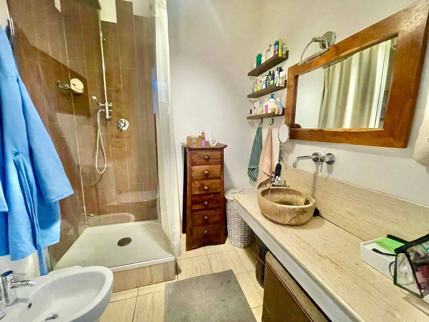 Sono inoltre presenti due servizi completi di comodo box doccia, ampie e capienti armadiature a muro ed un funzionale ripostiglio con allaccio idrico per essere sfruttato anche come lavanderia.