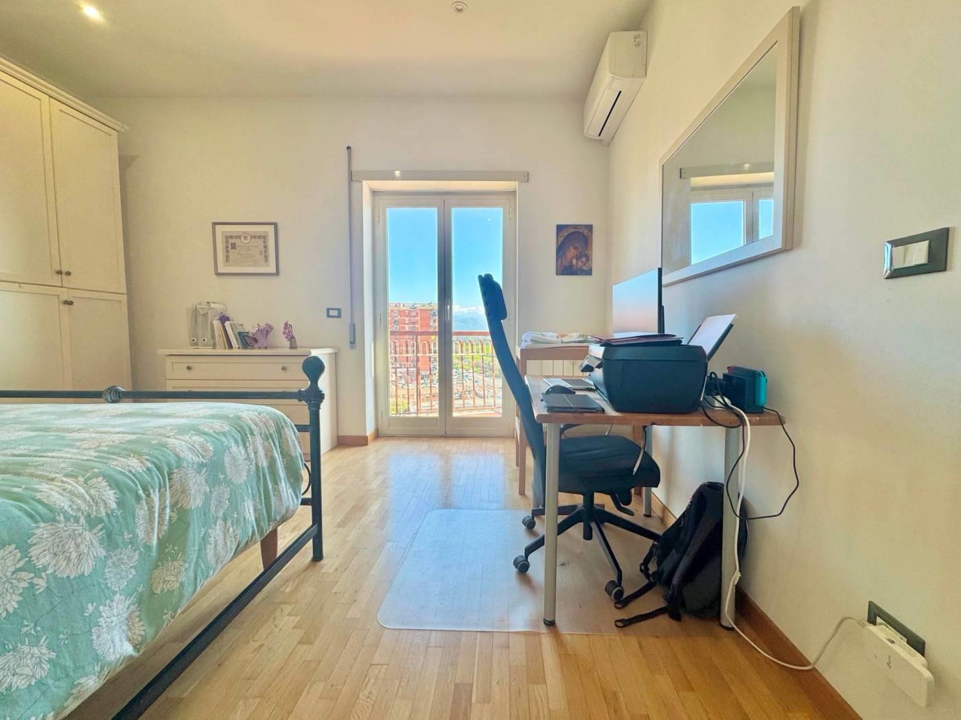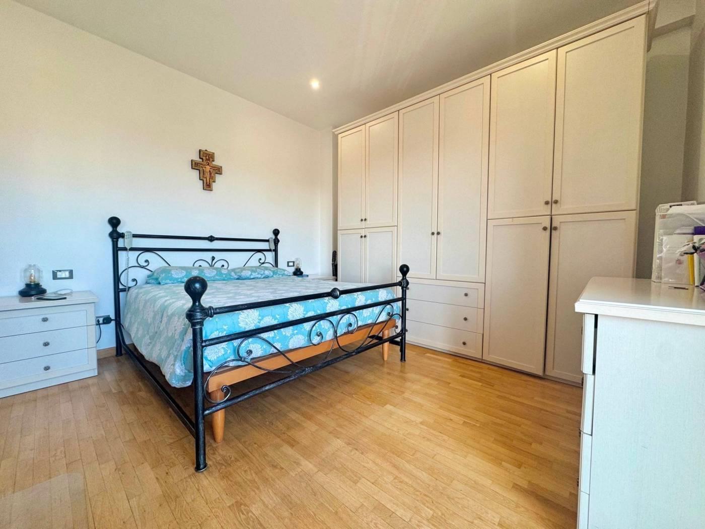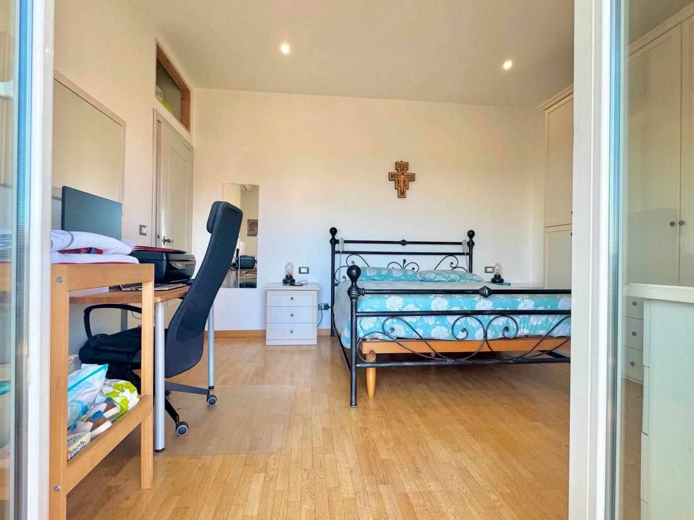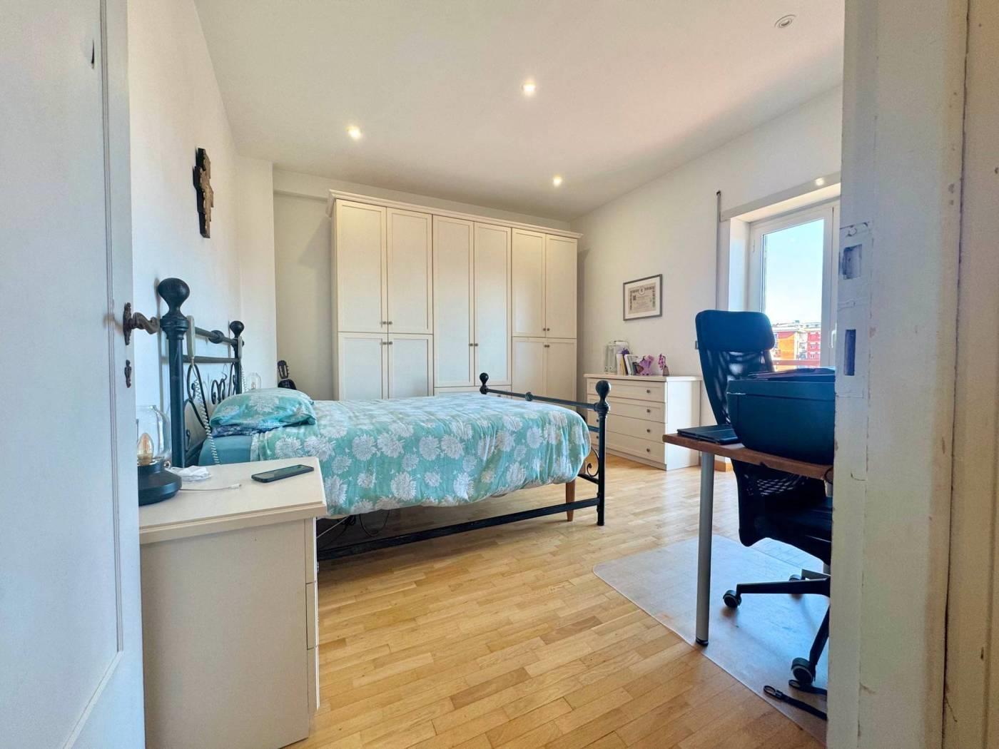 La zona notte è composta da due ampie camere da letto matrimoniali, entrambe con balcone privato, una cameretta e due bagni, di cui uno principale con vasca e un secondo bagno dotato di zona lavanderia. Tutto è distribuito lungo un pratico disimpegno, attrezzato con comodi armadi a muro che ottimizzano gli spazi.
