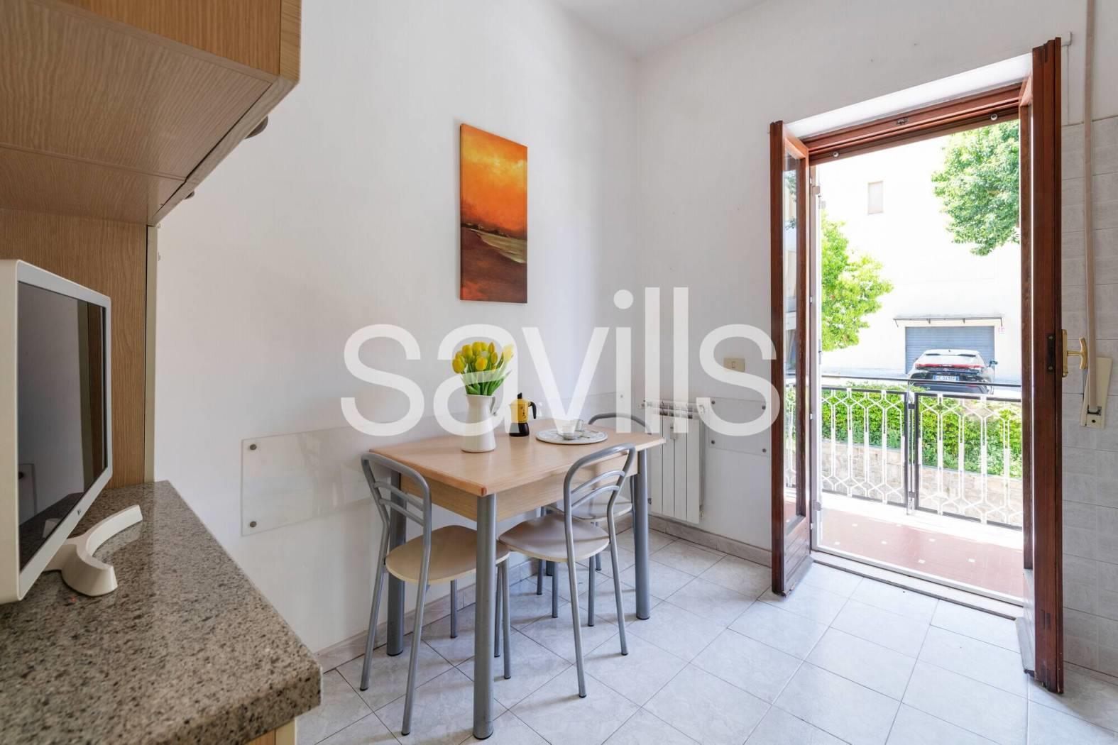 L'ingresso si apre su un ampio soggiorno, concepito come il naturale centro della vita quotidiana: un ambiente spazioso e accogliente con accesso diretto a un grande balcone affacciato sul cortile interno, un angolo tranquillo ideale per rilassarsi e cenare all’aperto senza uscire di casa. Adiacente alla zona giorno, la cucina è un comodo spazio intimo e funzionale con accesso a un secondo balcone, di generose dimensioni e pratico nella sua configurazione.