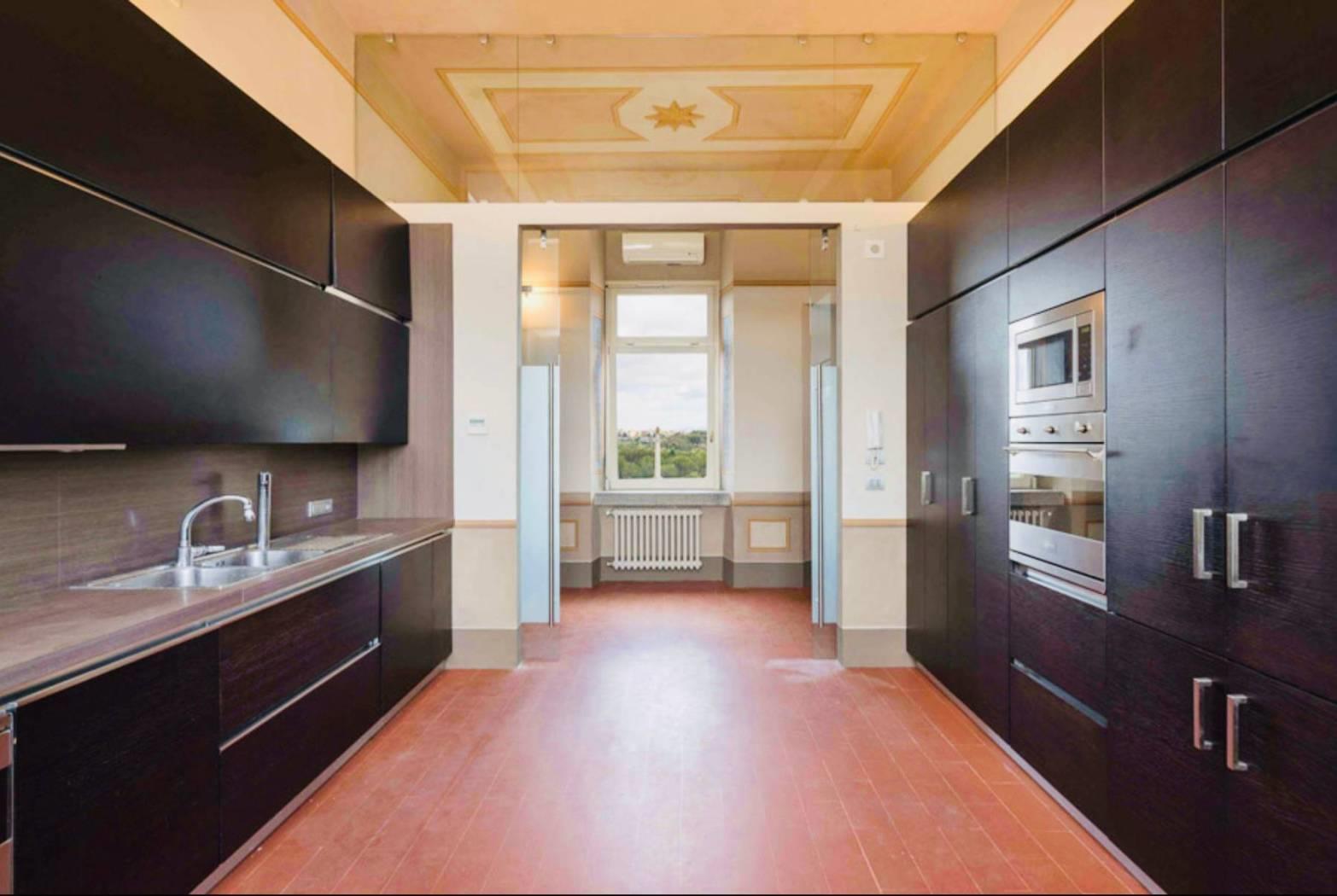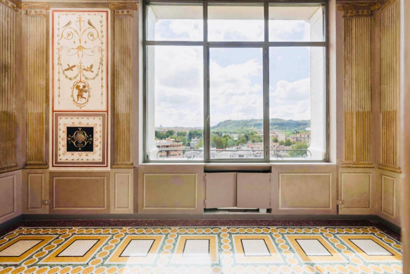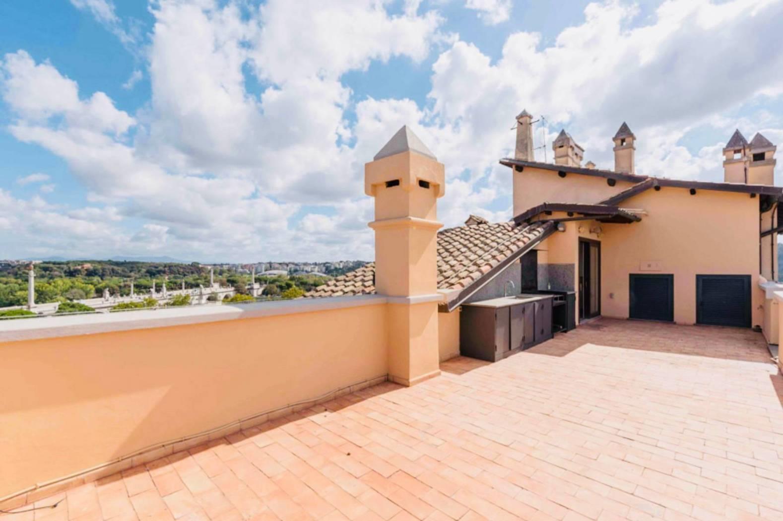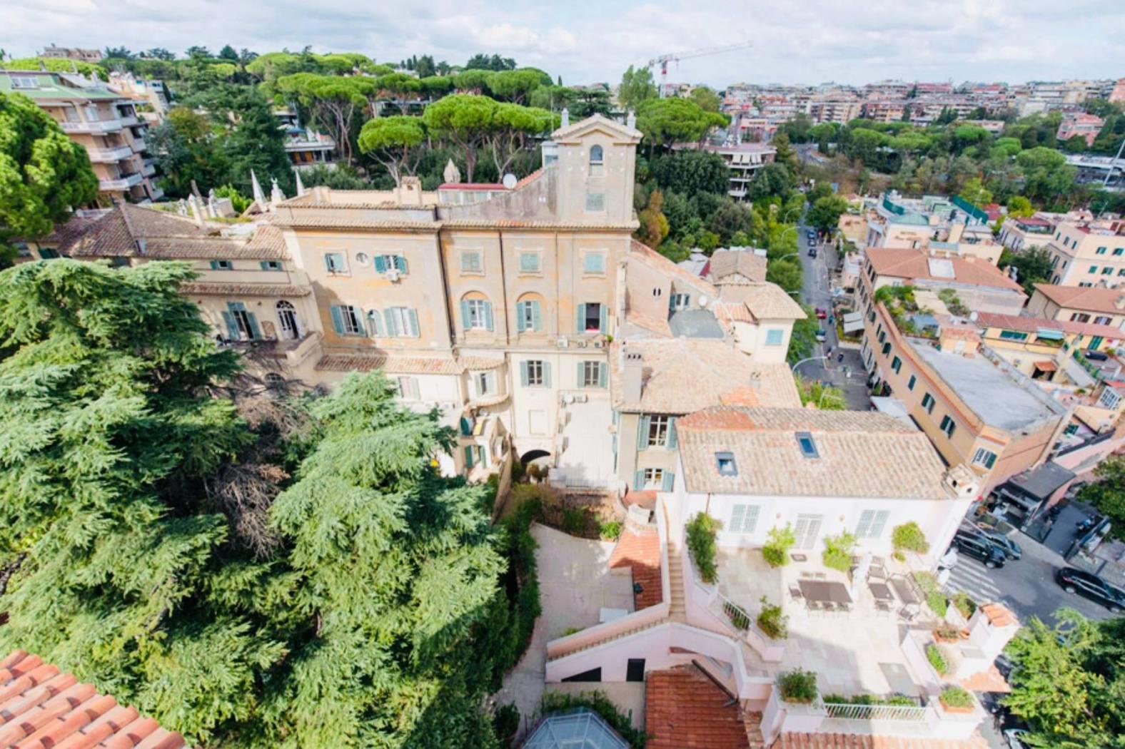 Questo appartamento di c.ca 350 mq interni e di c.ca 70 mq di terrazzo è il più prestigioso di tutto l’edificio. Presenta 5 camere, 7 bagni, 2 saloni di rappresentanza, una prestigiosa veranda, una zona adibita a studio o biblioteca, piú una grande cucina volutamente moderna con infissi in vetro e acciaio che spezza con gli ambienti storici della dimora. A completare il tutto un’ampia terrazza, da cui si gode una vista spettacolare sulla città eterna attrezzata con lavandino, barbecue e frigo.