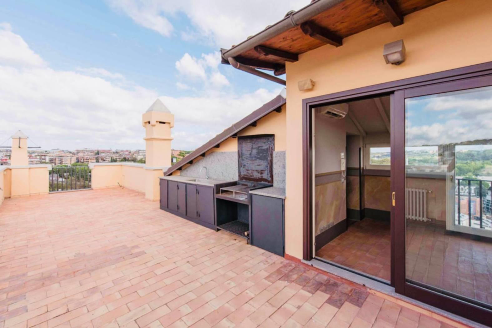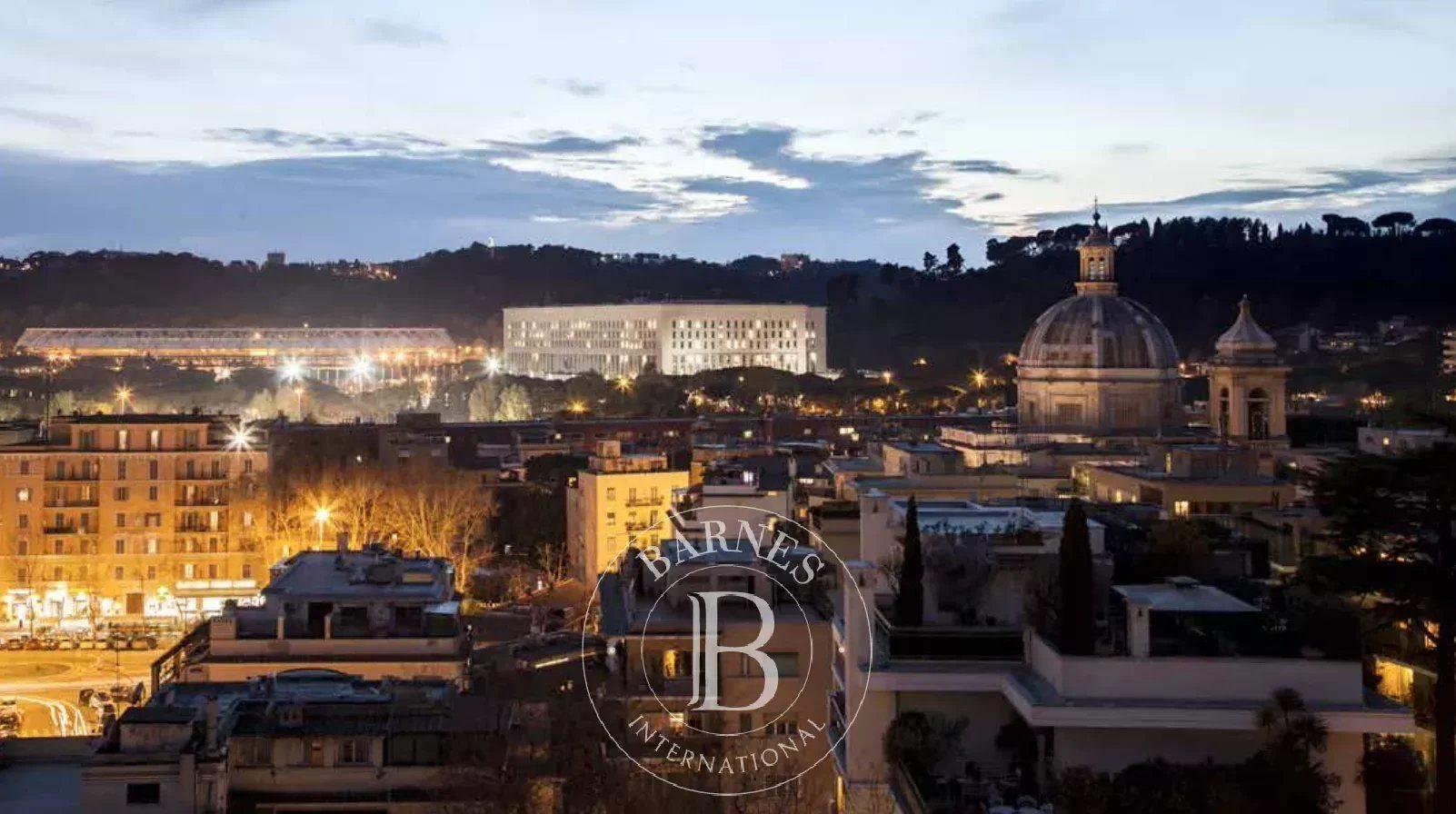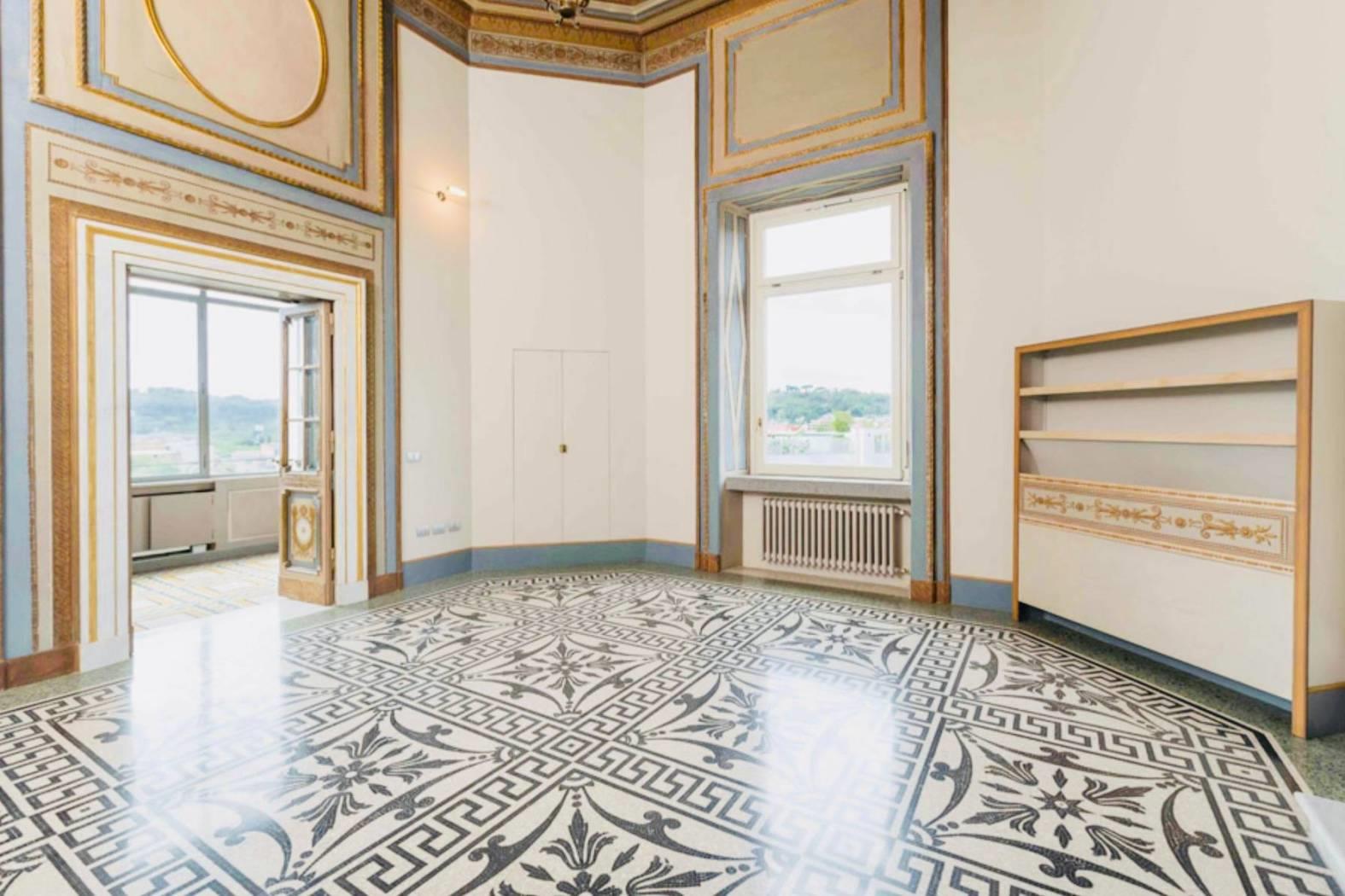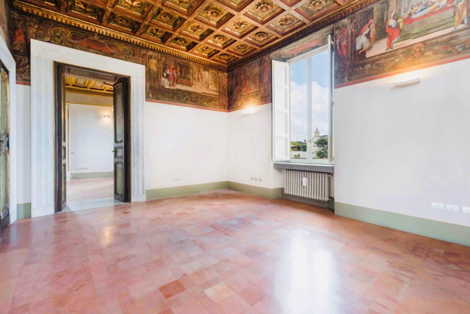 Questo appartamento di c.ca 350 mq interni e di c.ca 70 mq di terrazzo è il più prestigioso di tutto l’edificio. Presenta 5 camere, 7 bagni, 2 saloni di rappresentanza, una prestigiosa veranda, una zona adibita a studio o biblioteca, piú una grande cucina volutamente moderna con infissi in vetro e acciaio che spezza con gli ambienti storici della dimora. A completare il tutto un’ampia terrazza, da cui si gode una vista spettacolare sulla città eterna attrezzata con lavandino, barbecue e frigo.