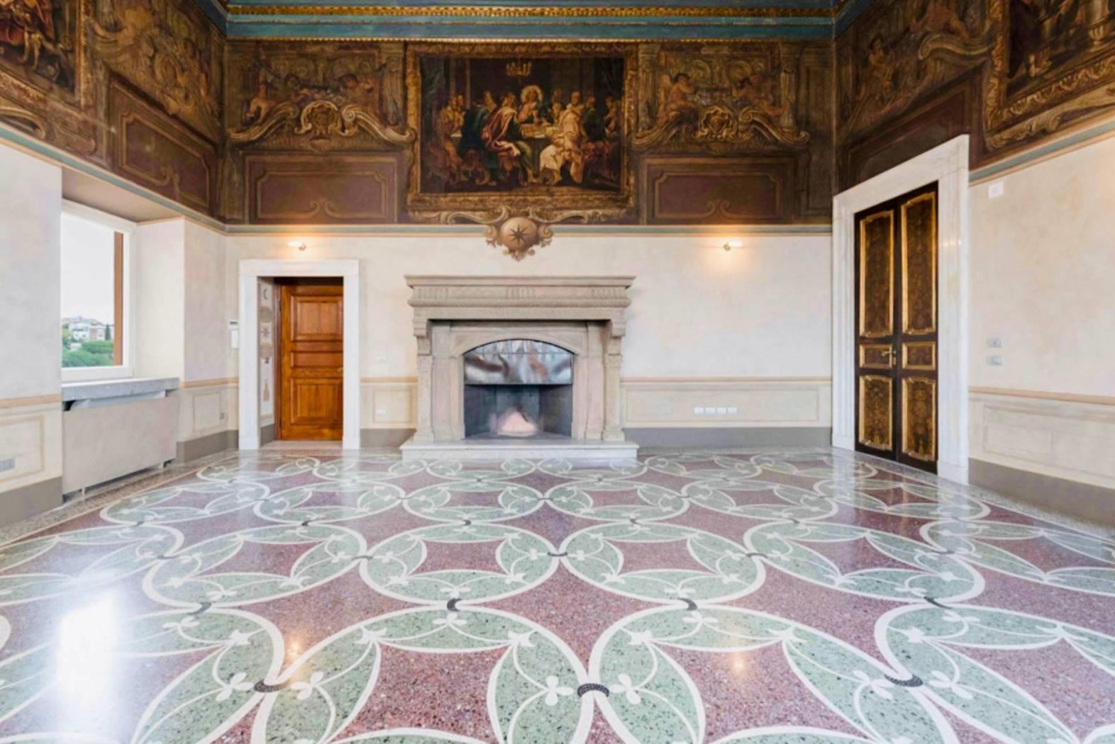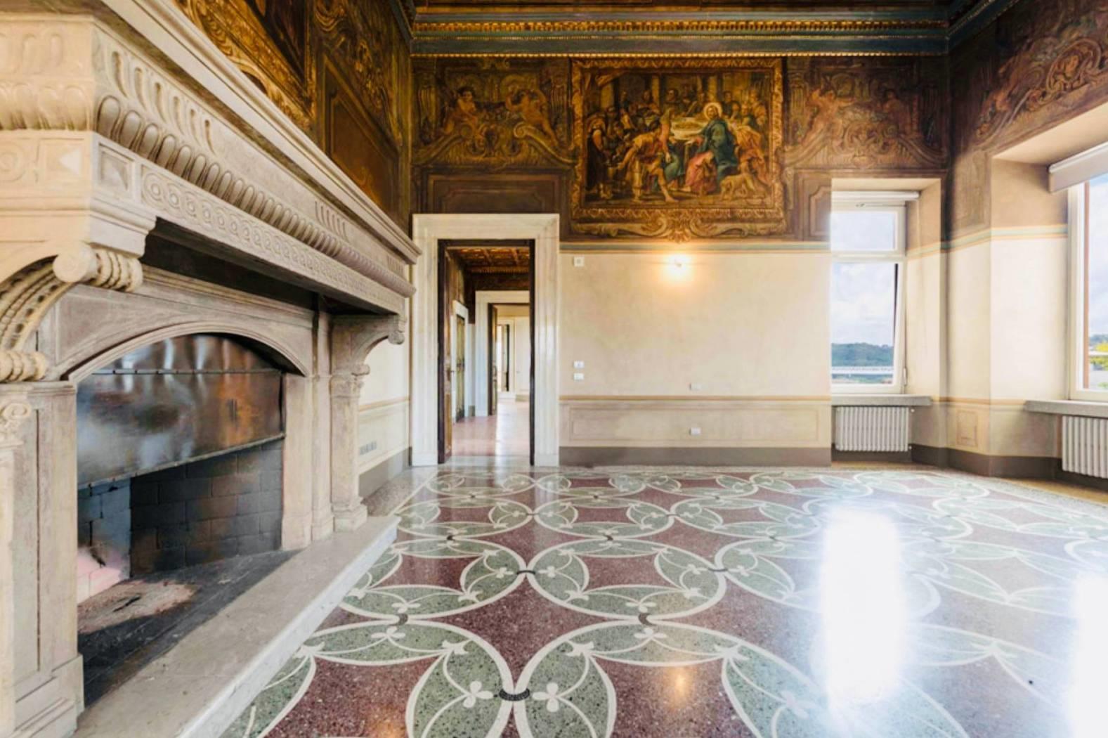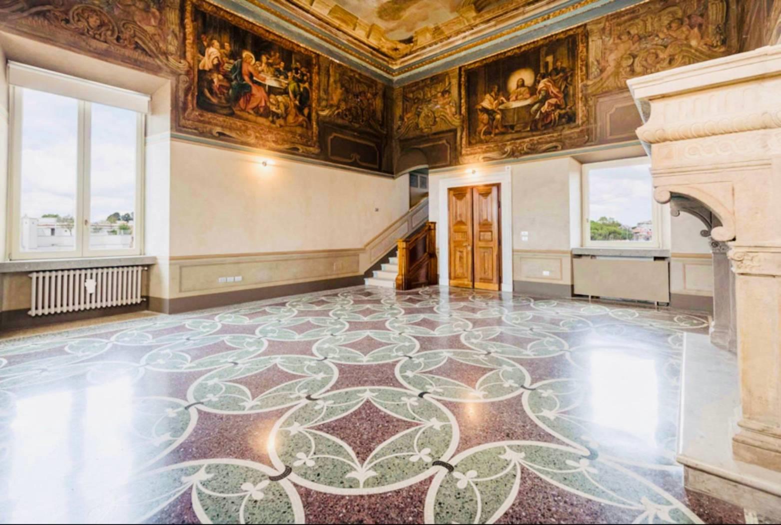 Le opere d’arti risalenti al ‘600, gli arazzi, i pavimenti a veneziana realizzati con graniglie di marmi verdi e porfidi con inserti in Carrara. Soffitti a cassettoni con decori in oro. Un camino in peperino scolpito e labris dipinto a tempera e l’altro in marmo bianco con intarsi in porfido presenta al centro un bassorilievo antico, fanno tutto da commento a dettagli di grande valore storico e unicità.