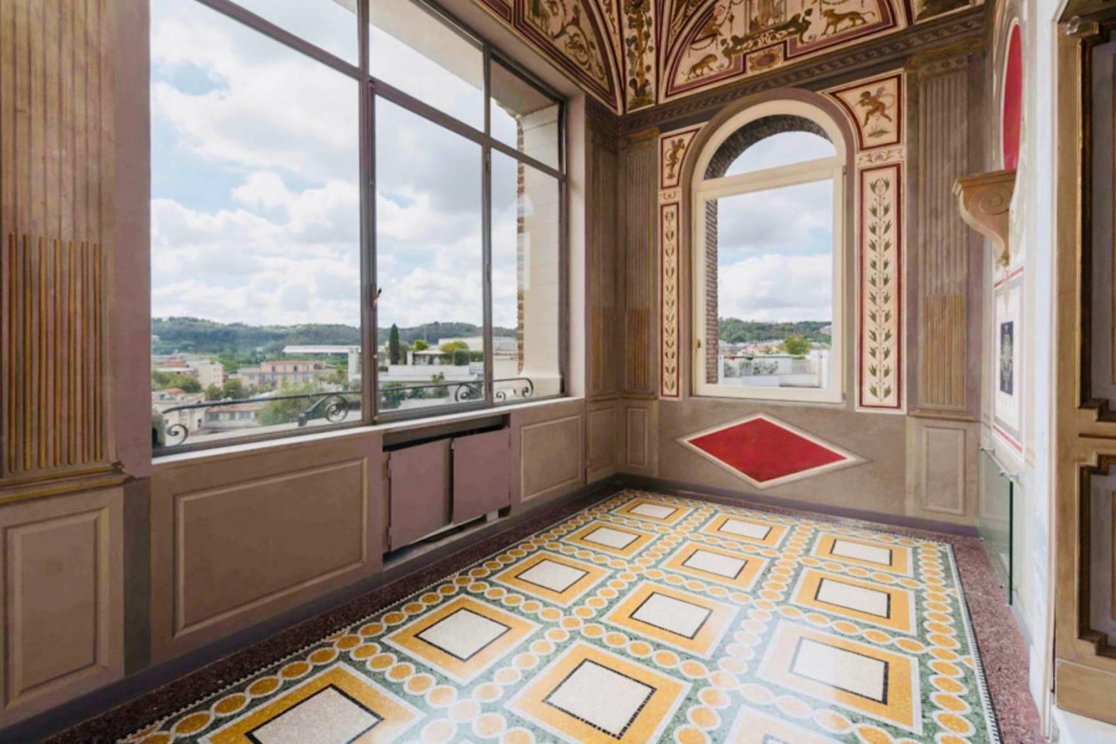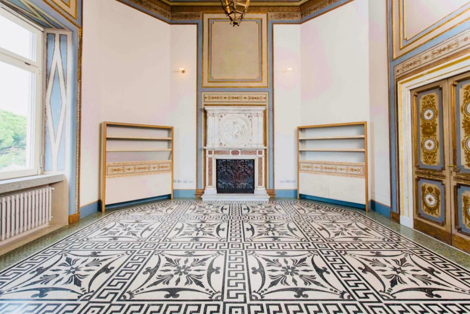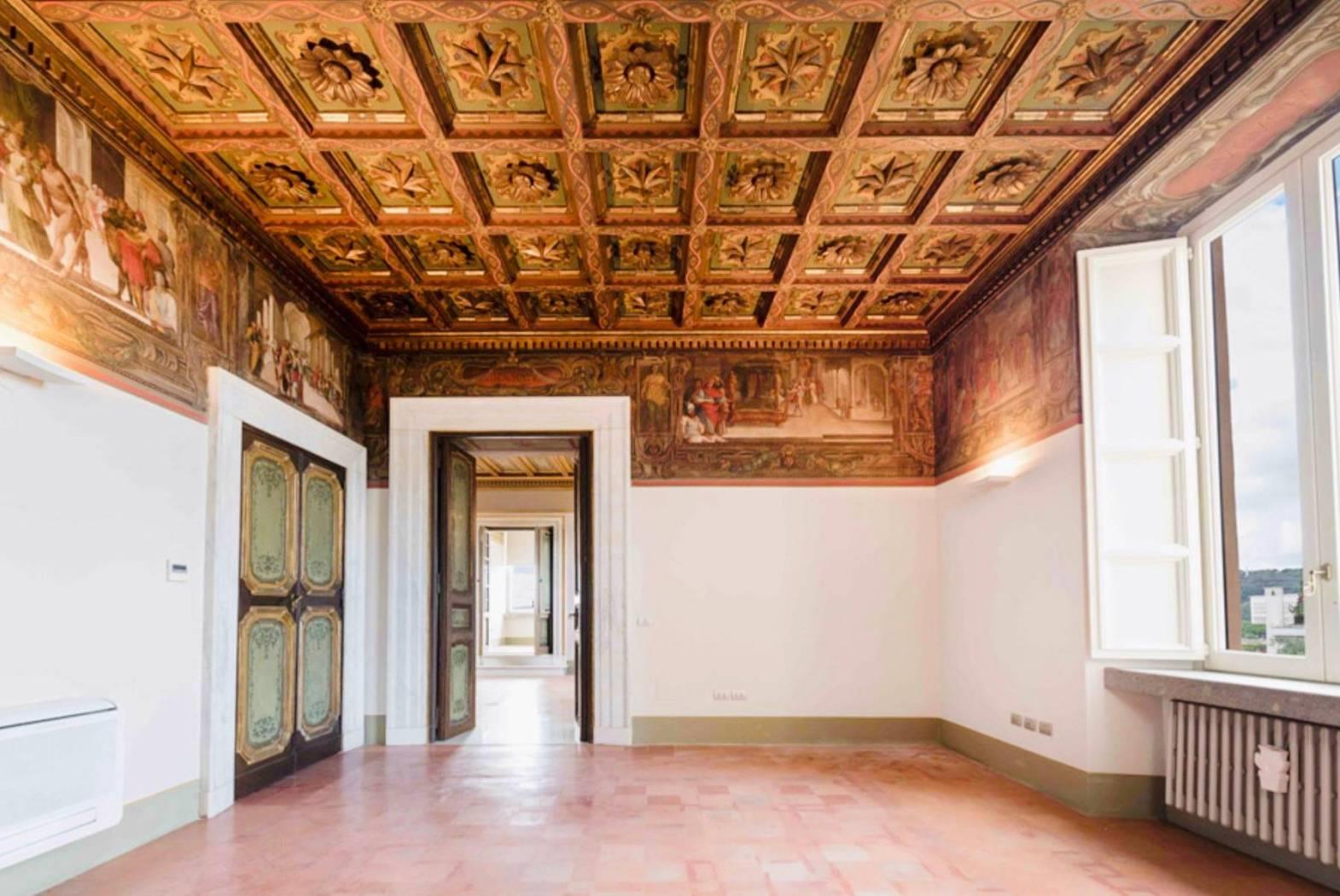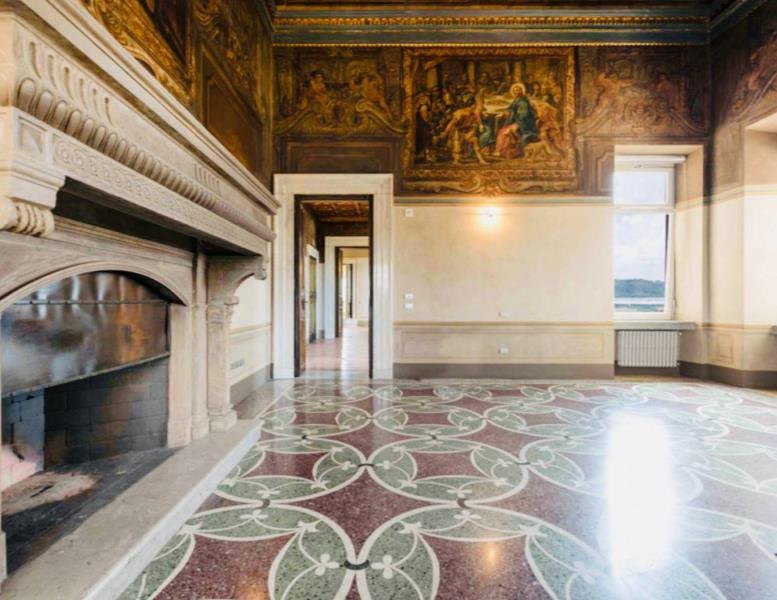 Le opere d’arti risalenti al ‘600, gli arazzi, i pavimenti a veneziana realizzati con graniglie di marmi verdi e porfidi con inserti in Carrara. Soffitti a cassettoni con decori in oro. Un camino in peperino scolpito e labris dipinto a tempera e l’altro in marmo bianco con intarsi in porfido presenta al centro un bassorilievo antico, fanno tutto da commento a dettagli di grande valore storico e unicità.