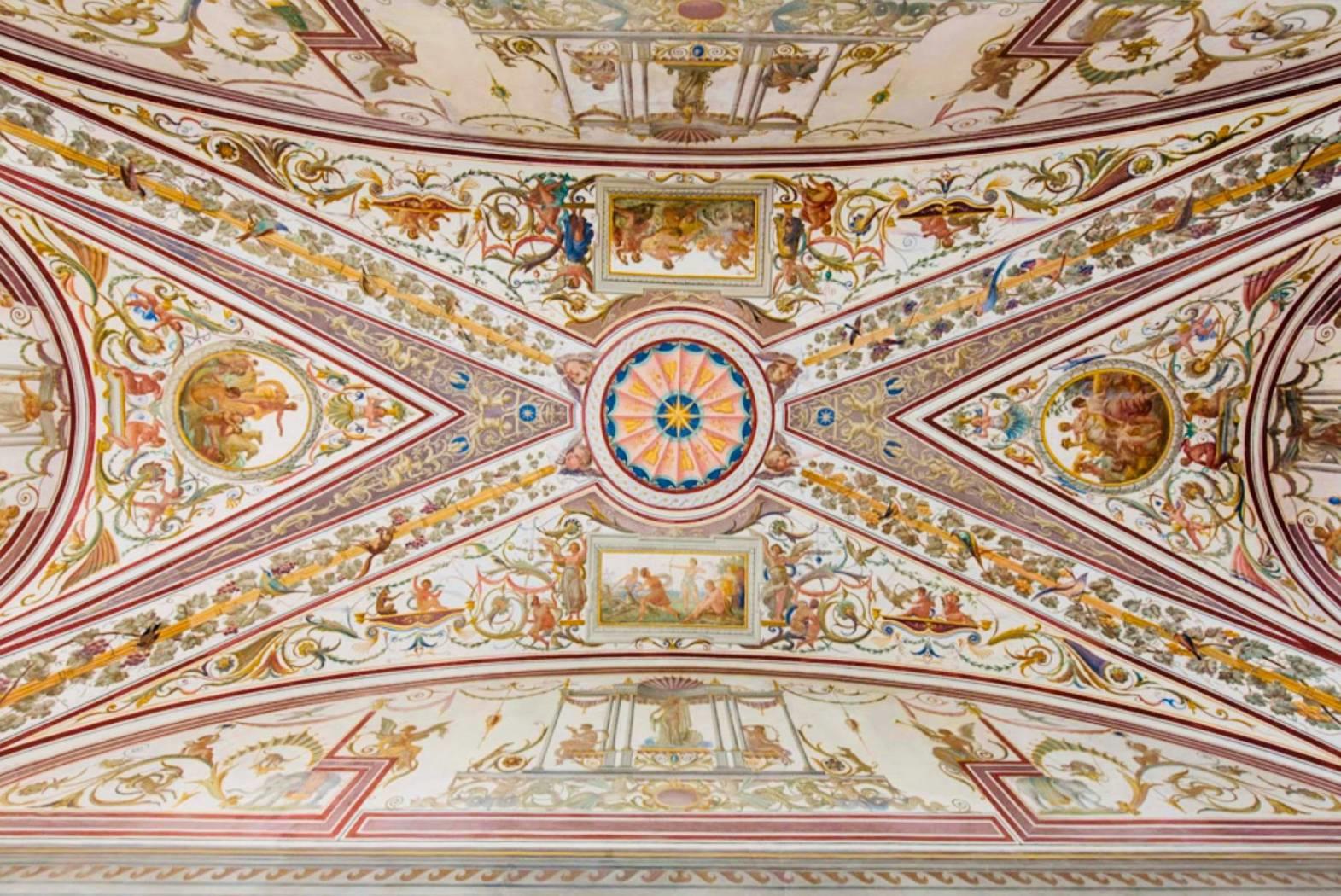 La fascia pittorica di decoro in alto, immediatamente sotto il soffitto, presenta l’alternanza di dipinti di spoglio con figure femminili, a similitudine delle decorazioni pittoriche del rinascimento.