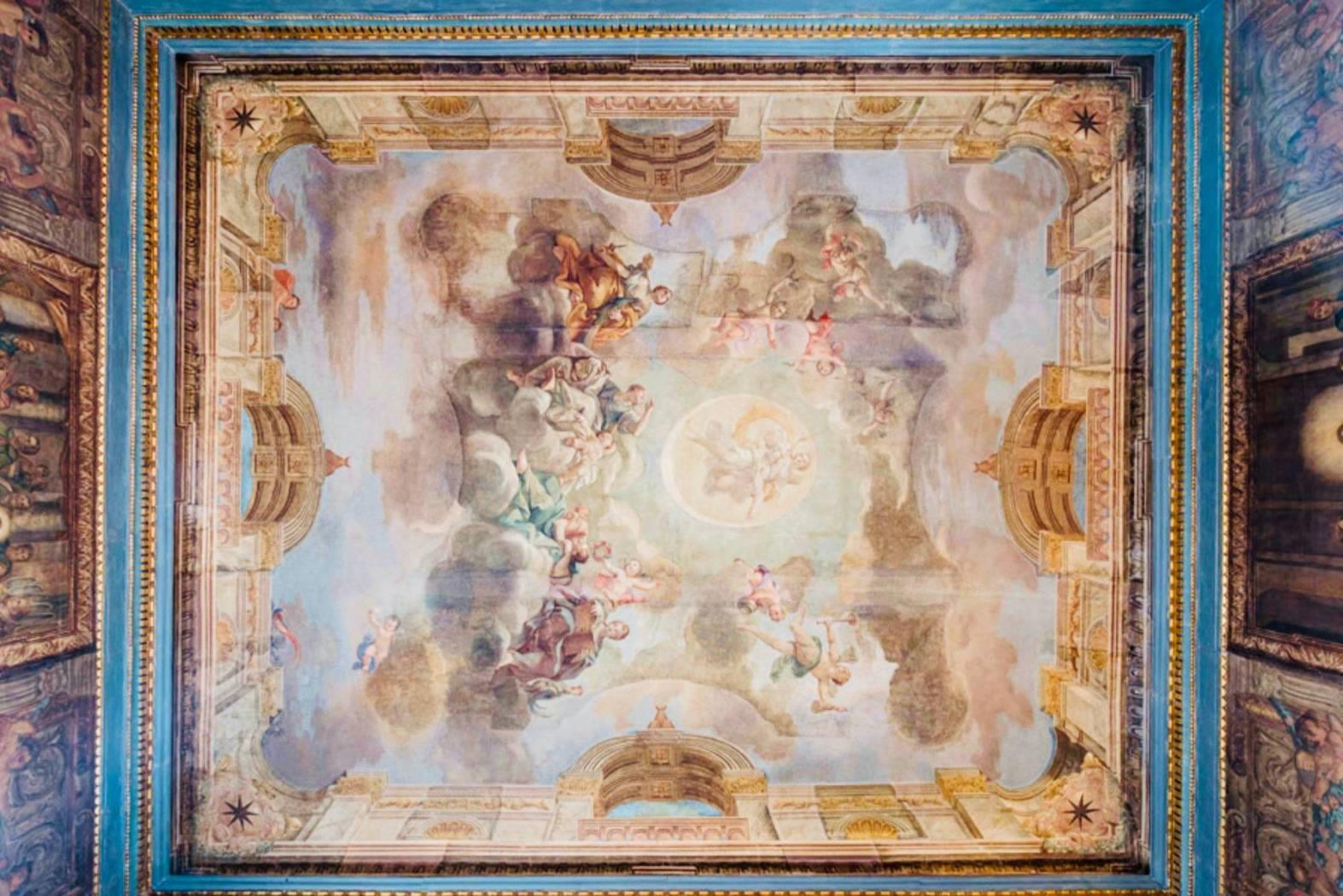 Un fregio dipinto corre tutt’intorno sulle quattro pareti, alternando inserti su tela a soggetto religioso e pitture decorative con putti danzanti, cartigli e festoni floreali.