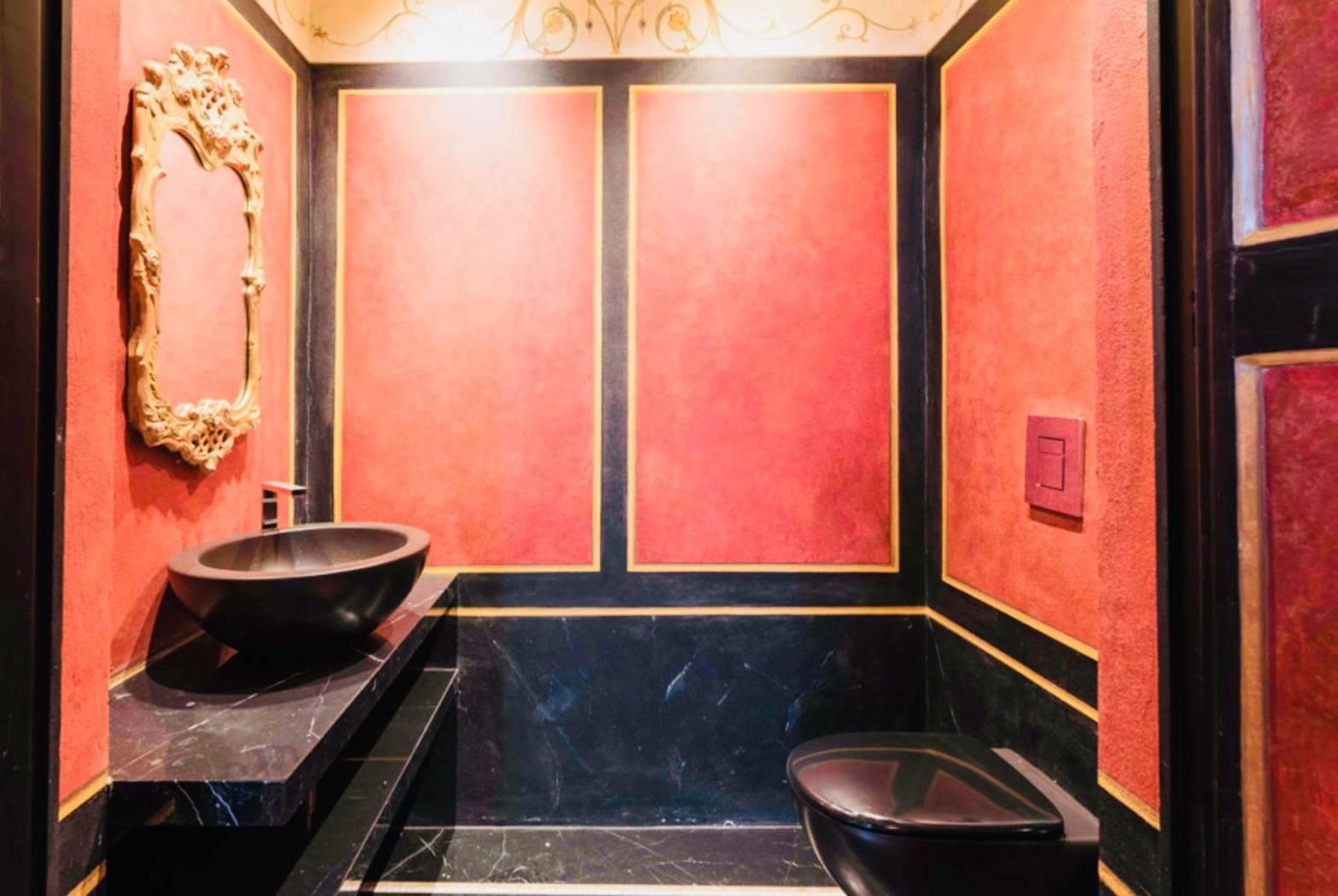 Un piccolo bagno destinato agli ospiti, tutto decorato in rosso e nero, di atmosfera pompeiana, si