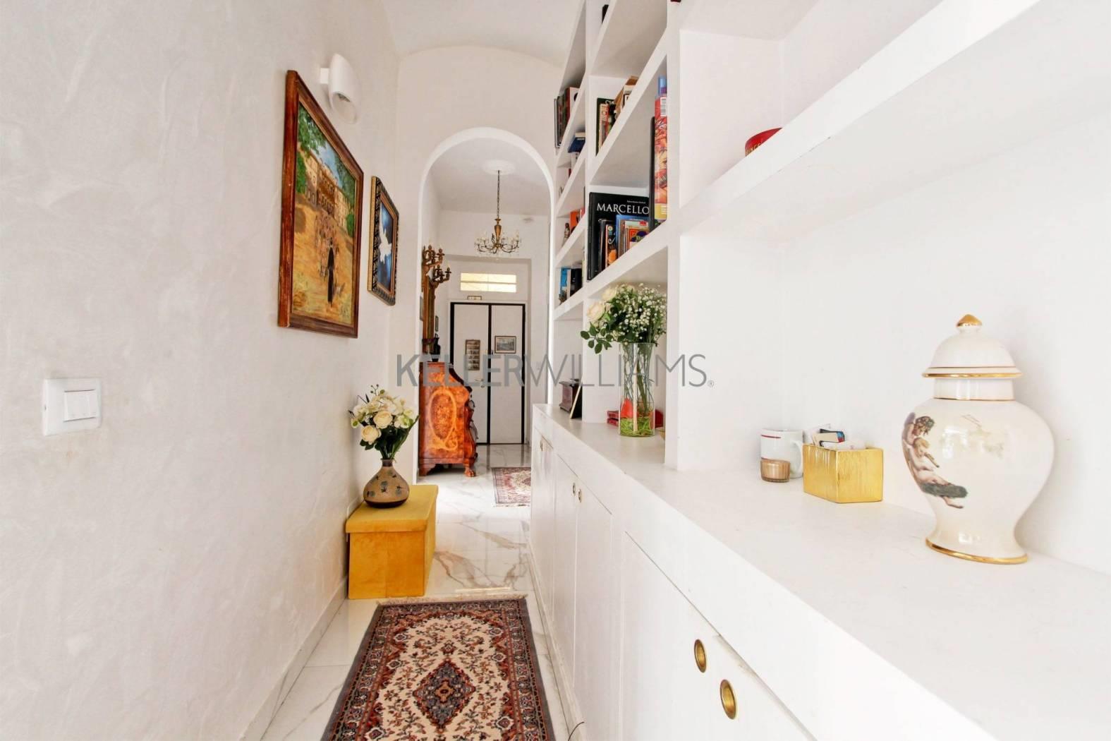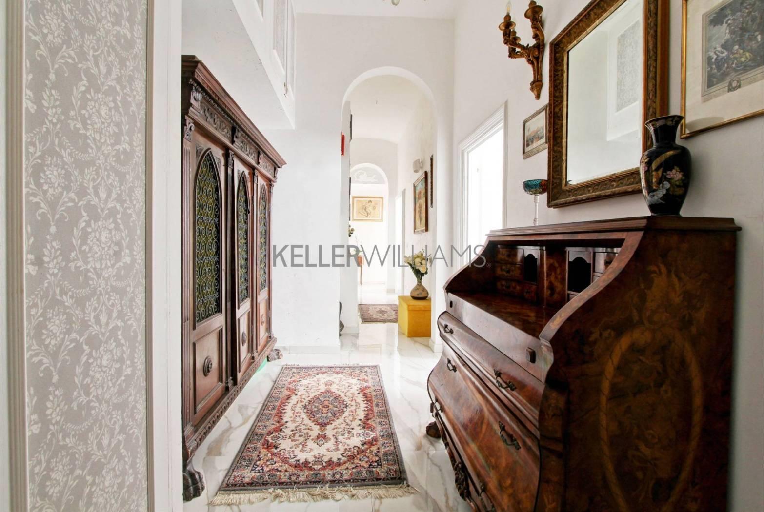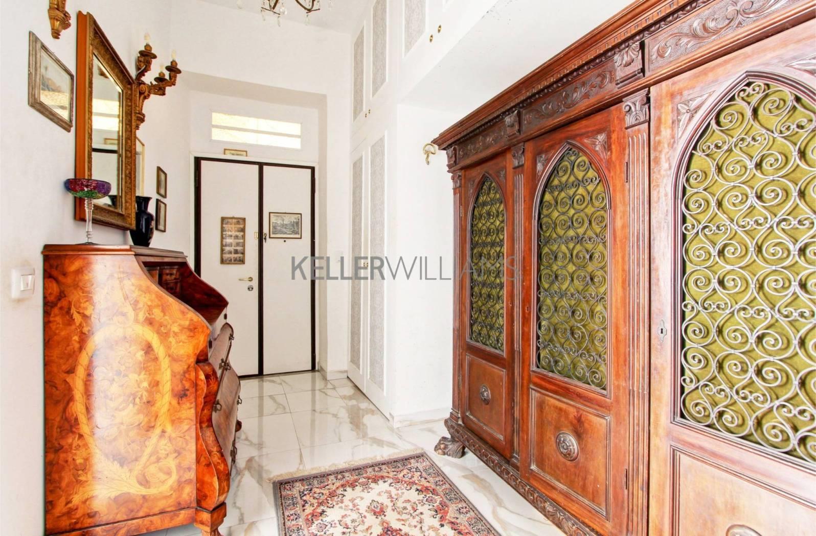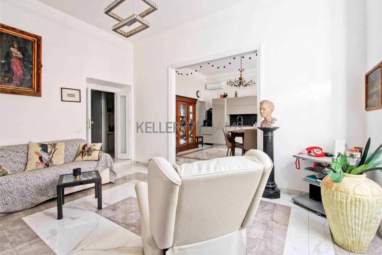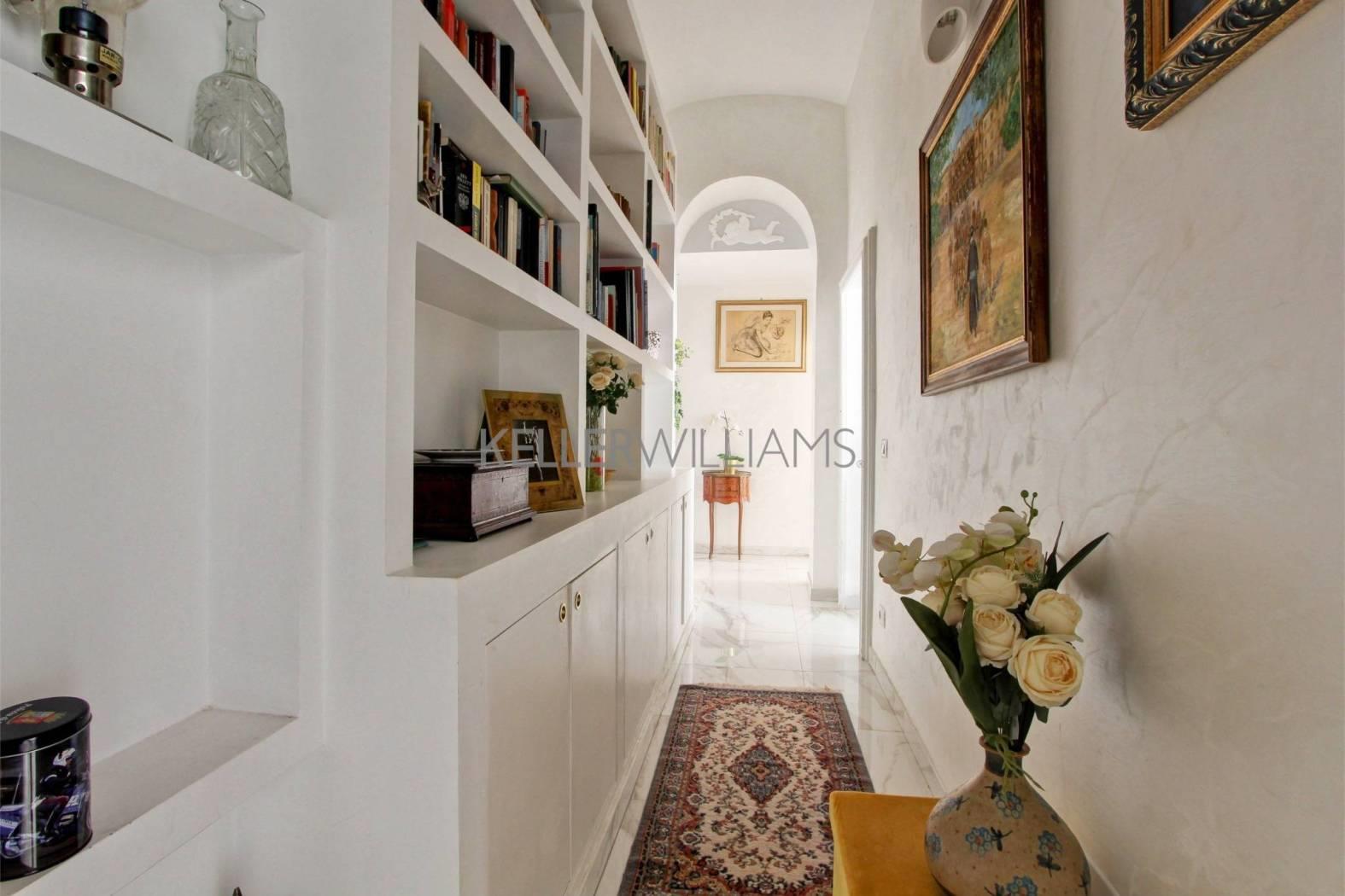 L’appartamento, di circa 200 mq completamente ristrutturato con materiali di pregio, come l’intera pavimentazione in pregiatissimo marmo bianco e grigio, è composto da un elegante ingresso che divide la zona notte dalla zona giorno.